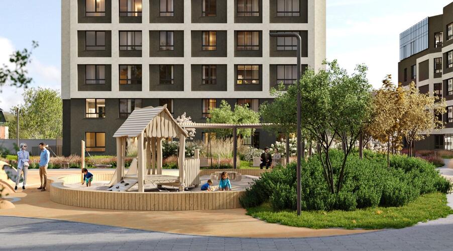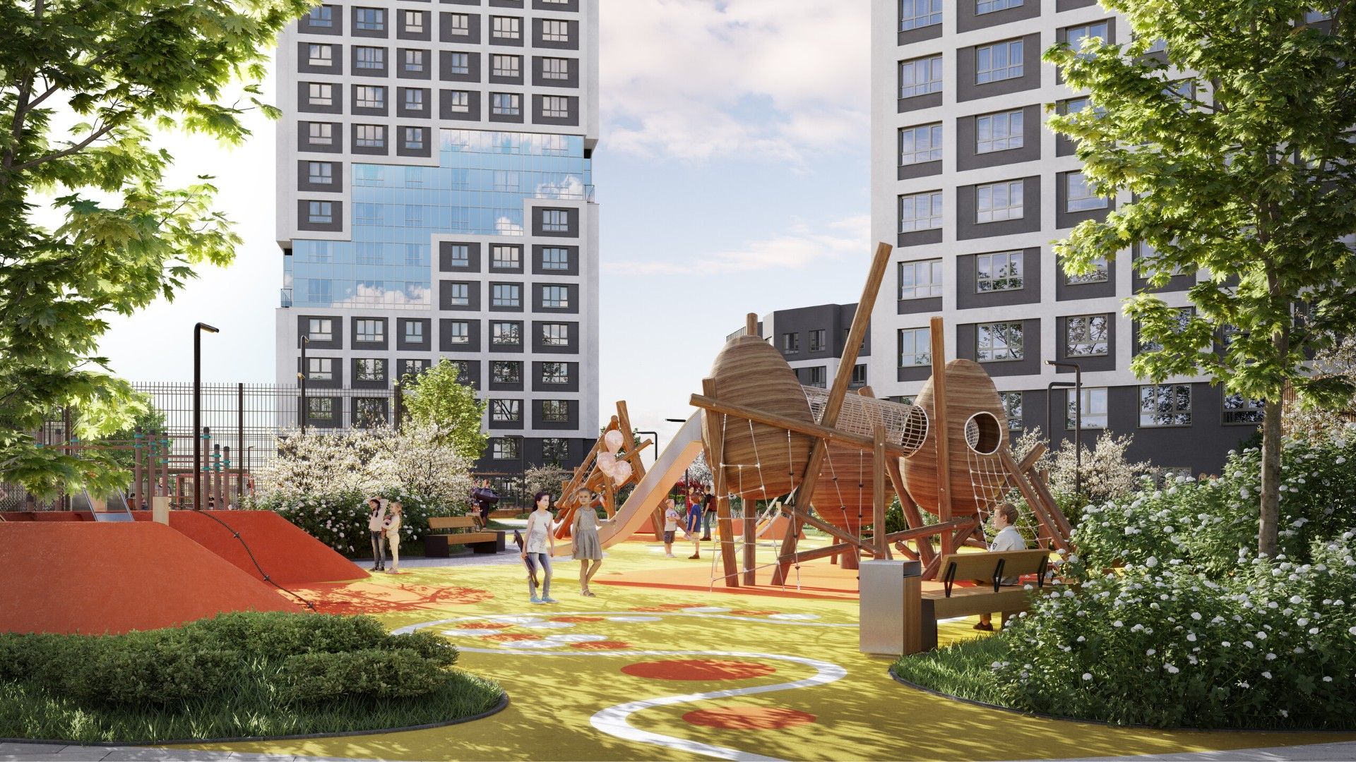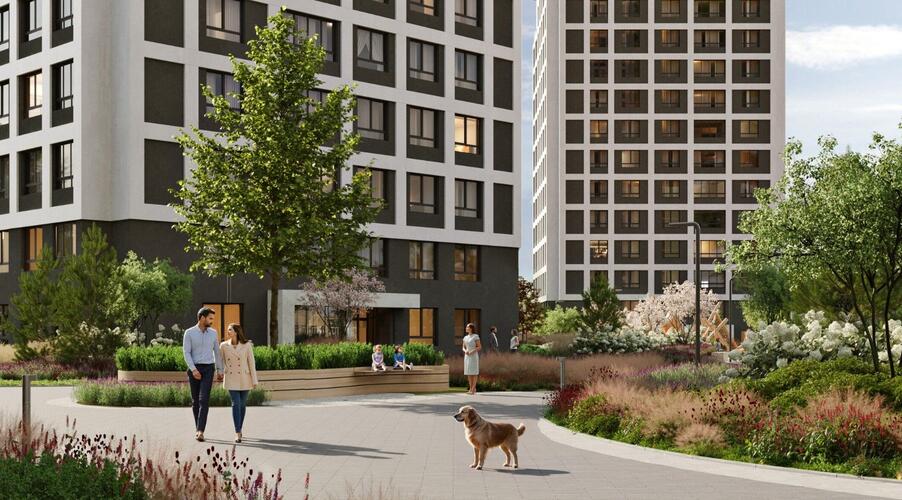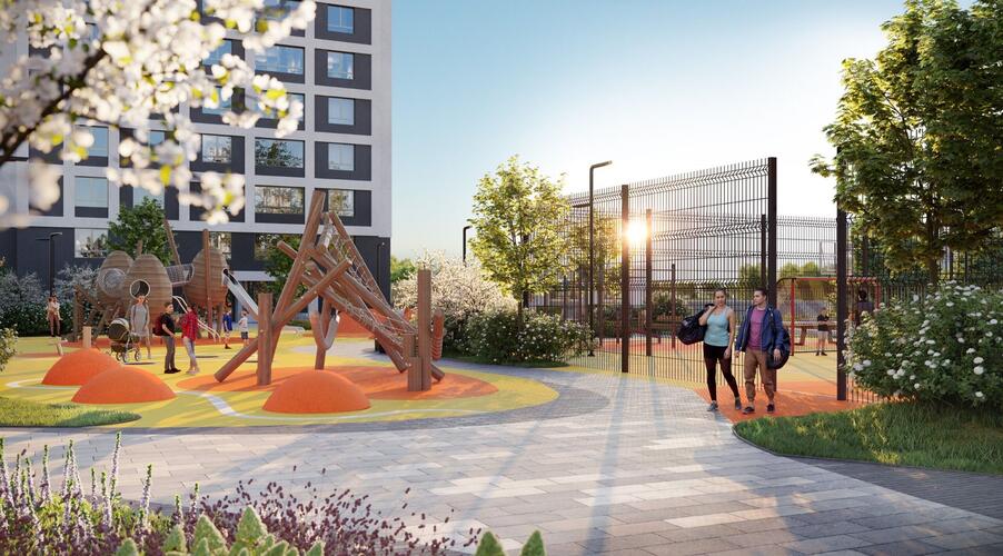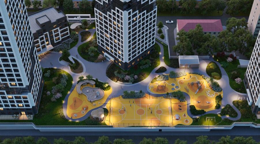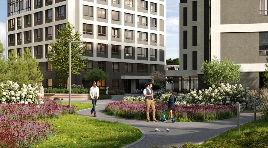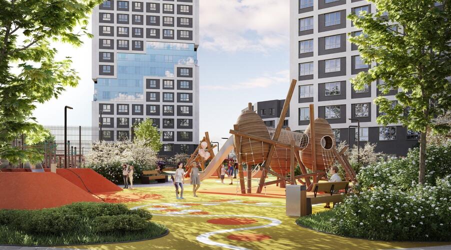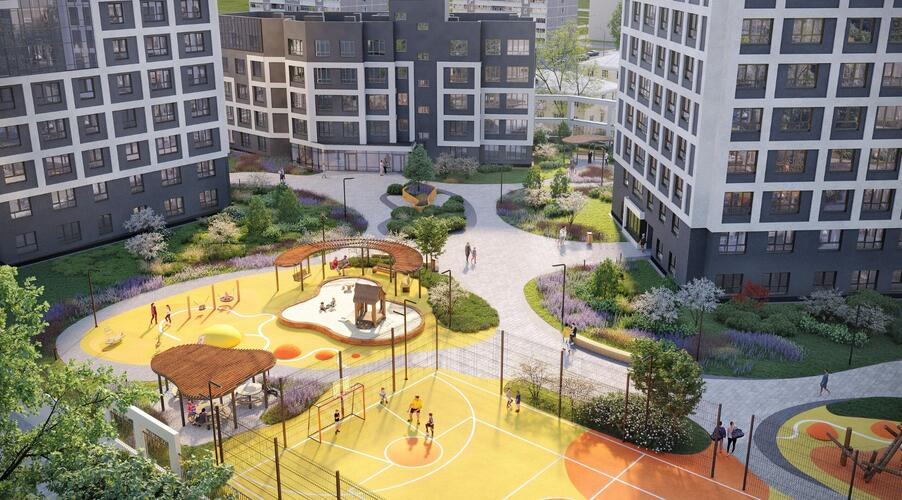 Внутреннее пространство квартала спроектировано как большой безопасный двор-парк, ориентированный на комфорт жителей всех возрастов: