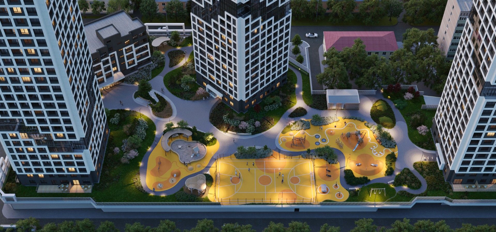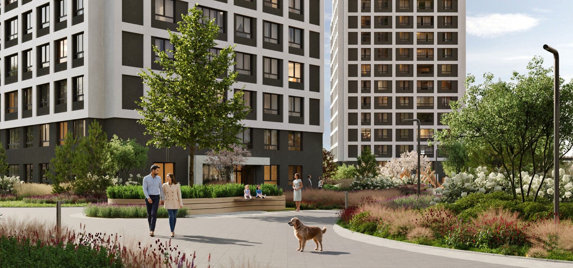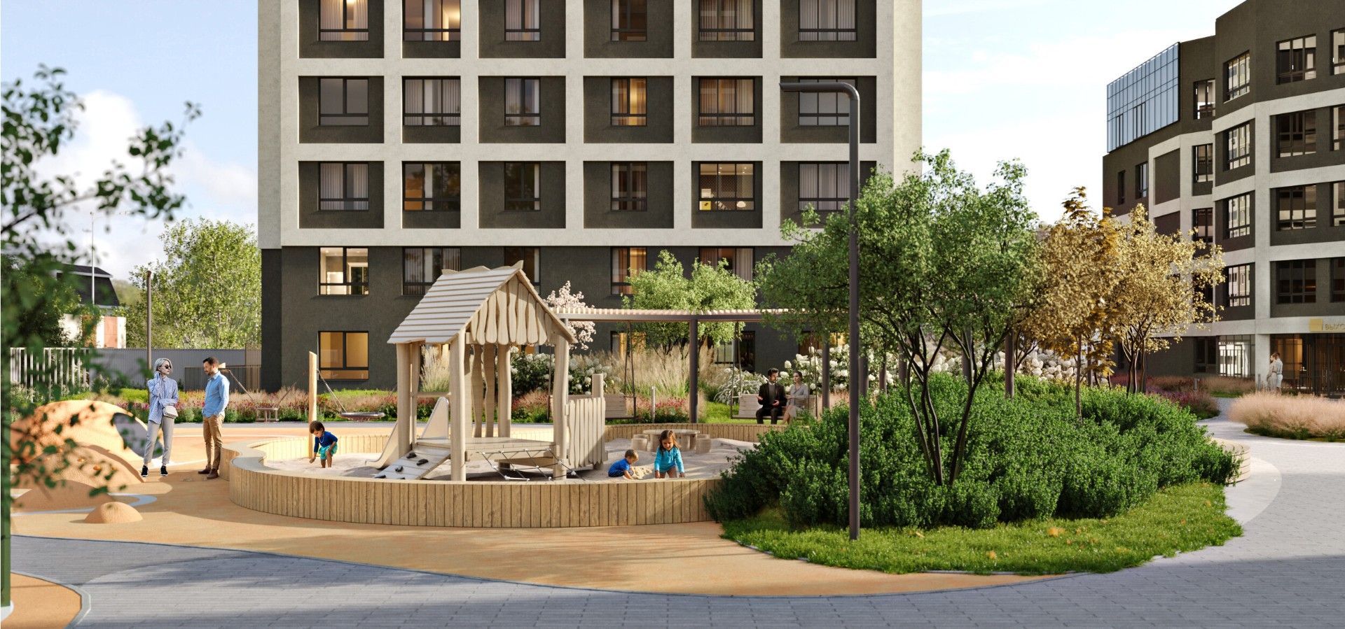 Внутреннее пространство квартала спроектировано как большой безопасный двор-парк, ориентированный на комфорт жителей всех возрастов: