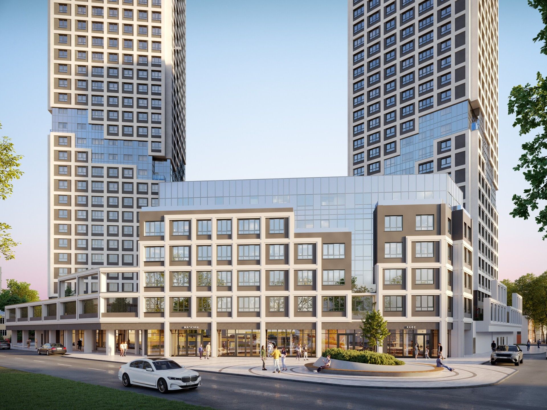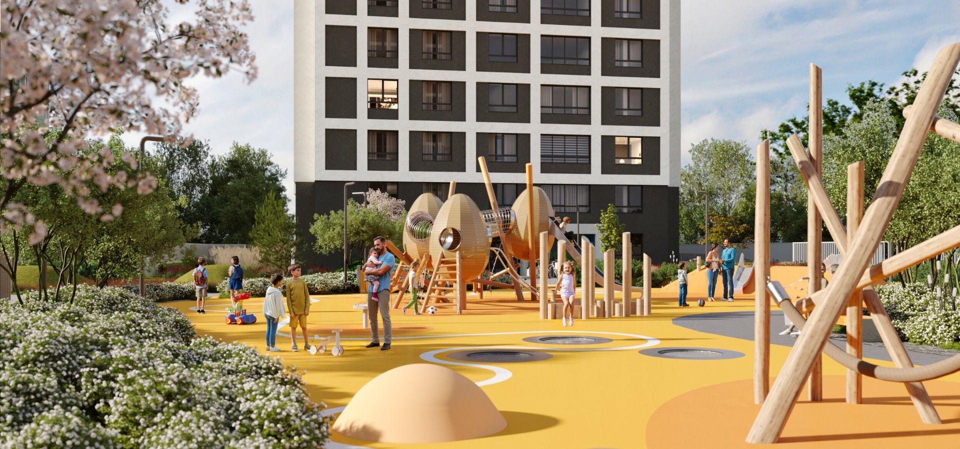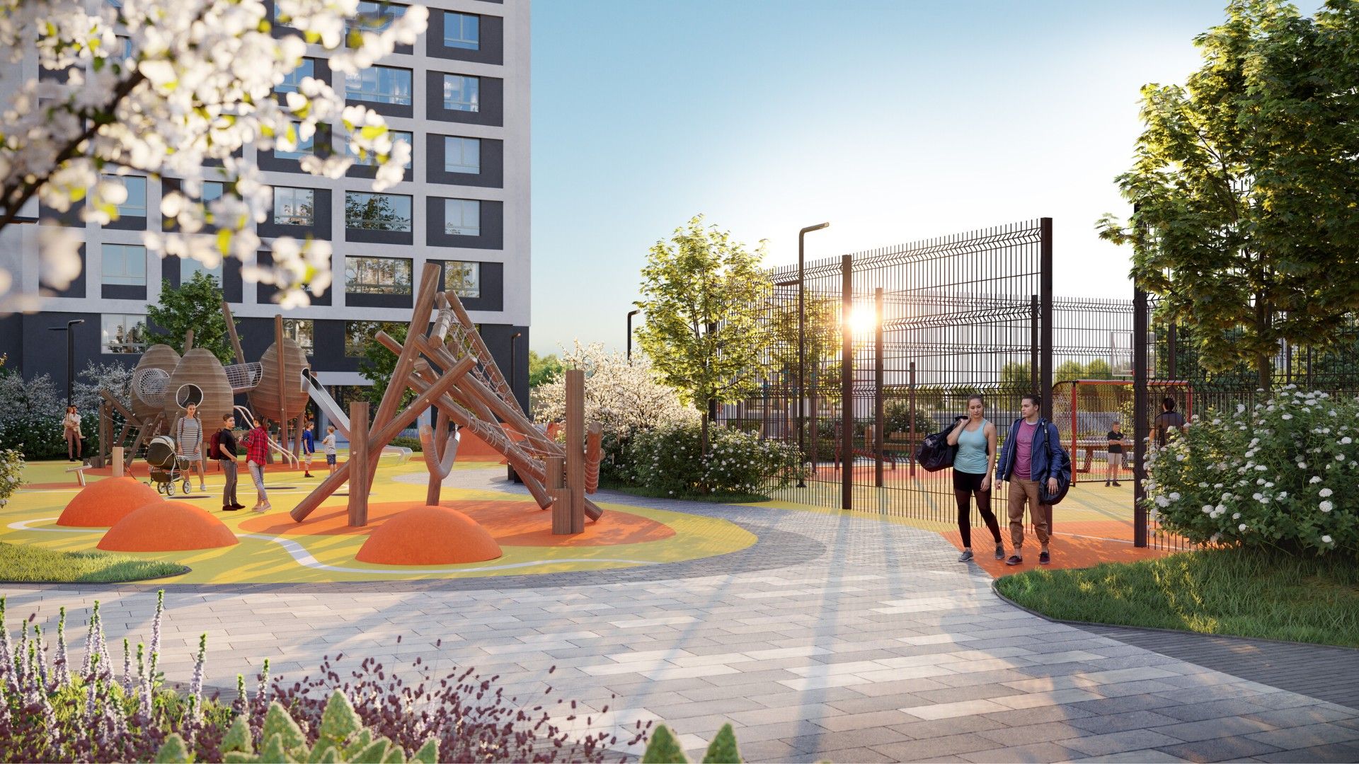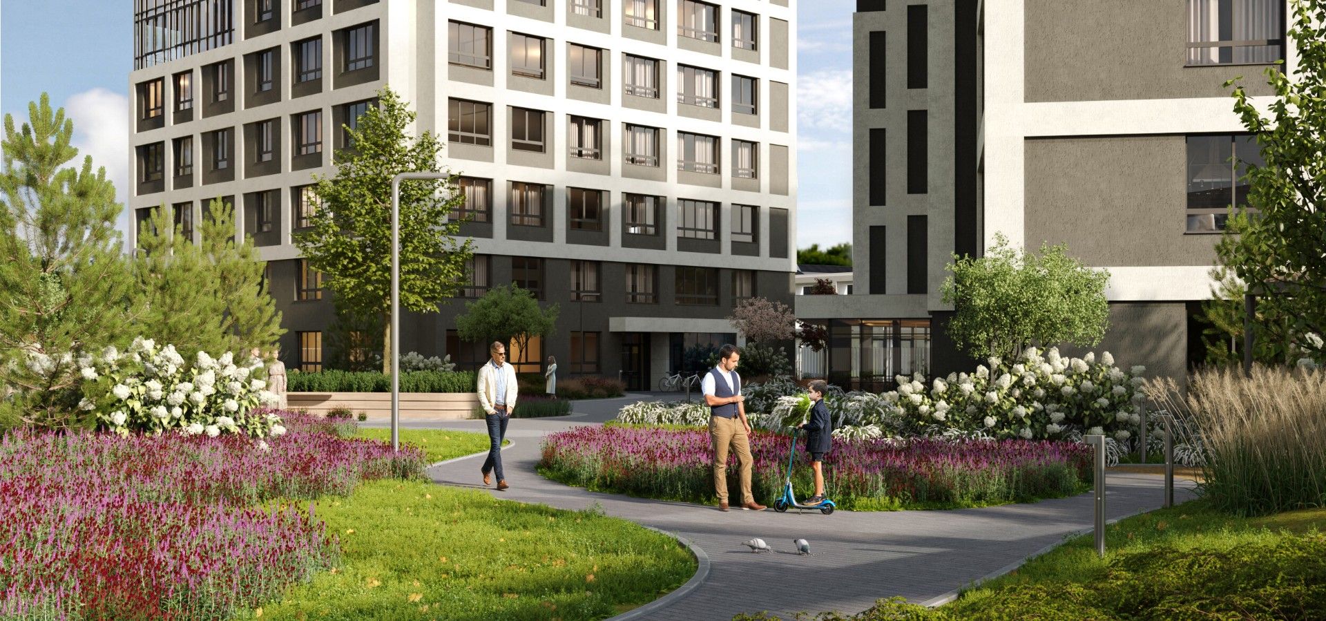 Внутреннее пространство квартала спроектировано как большой безопасный двор-парк, ориентированный на комфорт жителей всех возрастов: