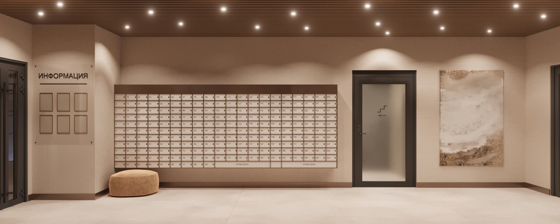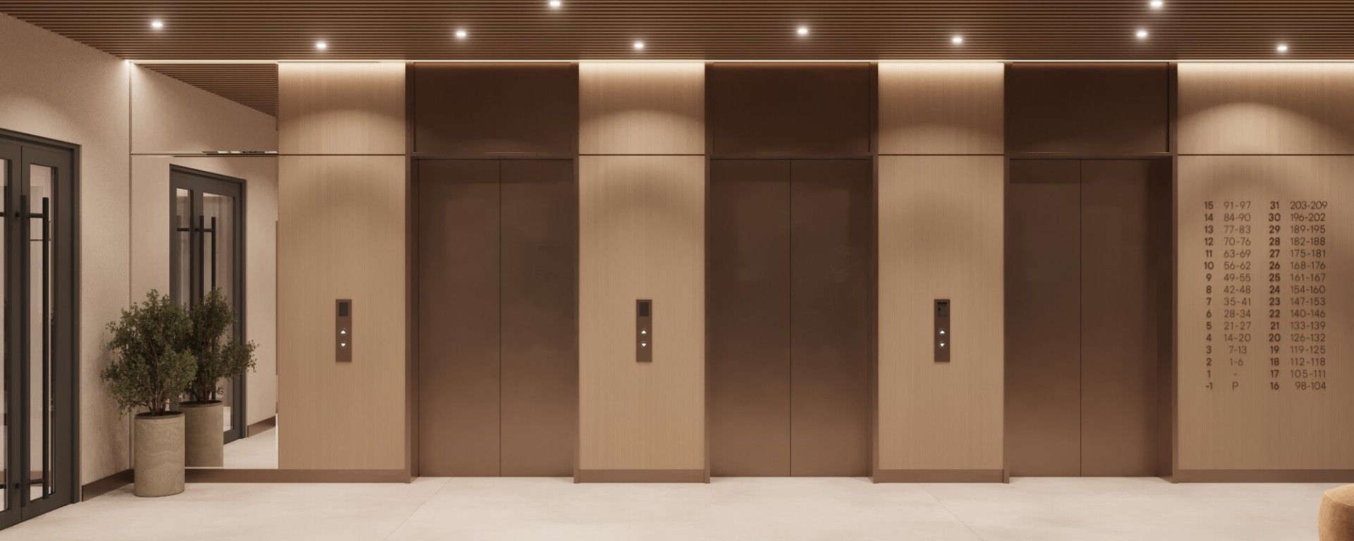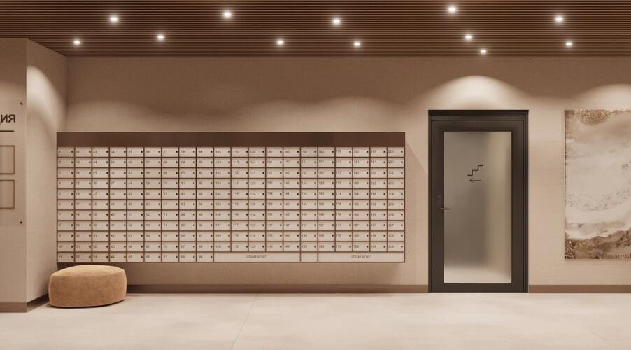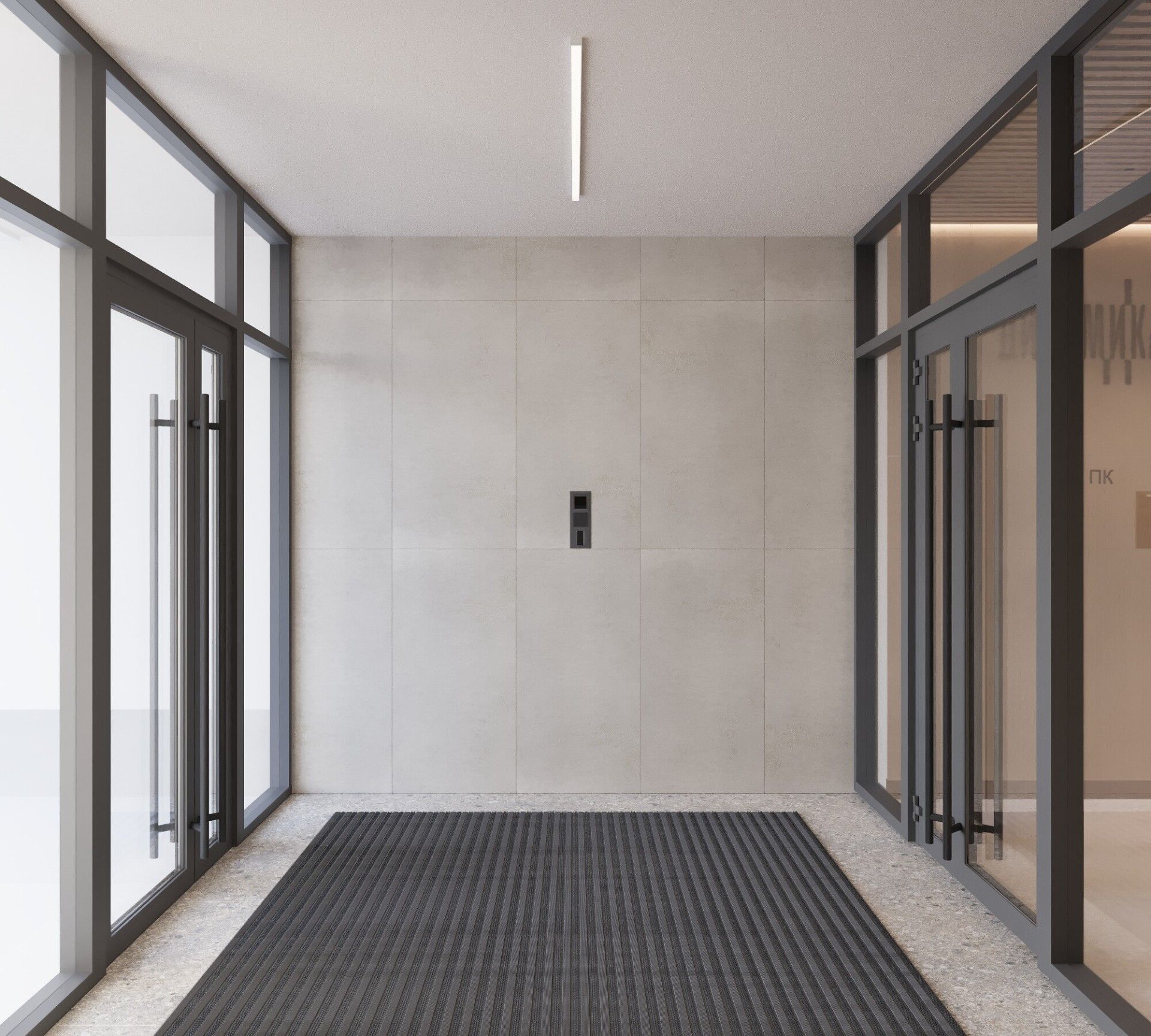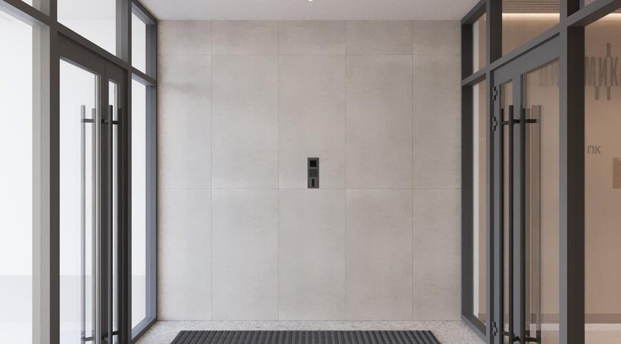 - Парадный вход с улицы Малышева с просторным холлом, панорамным остеклением, лаундж-зоной и ресепшеном.