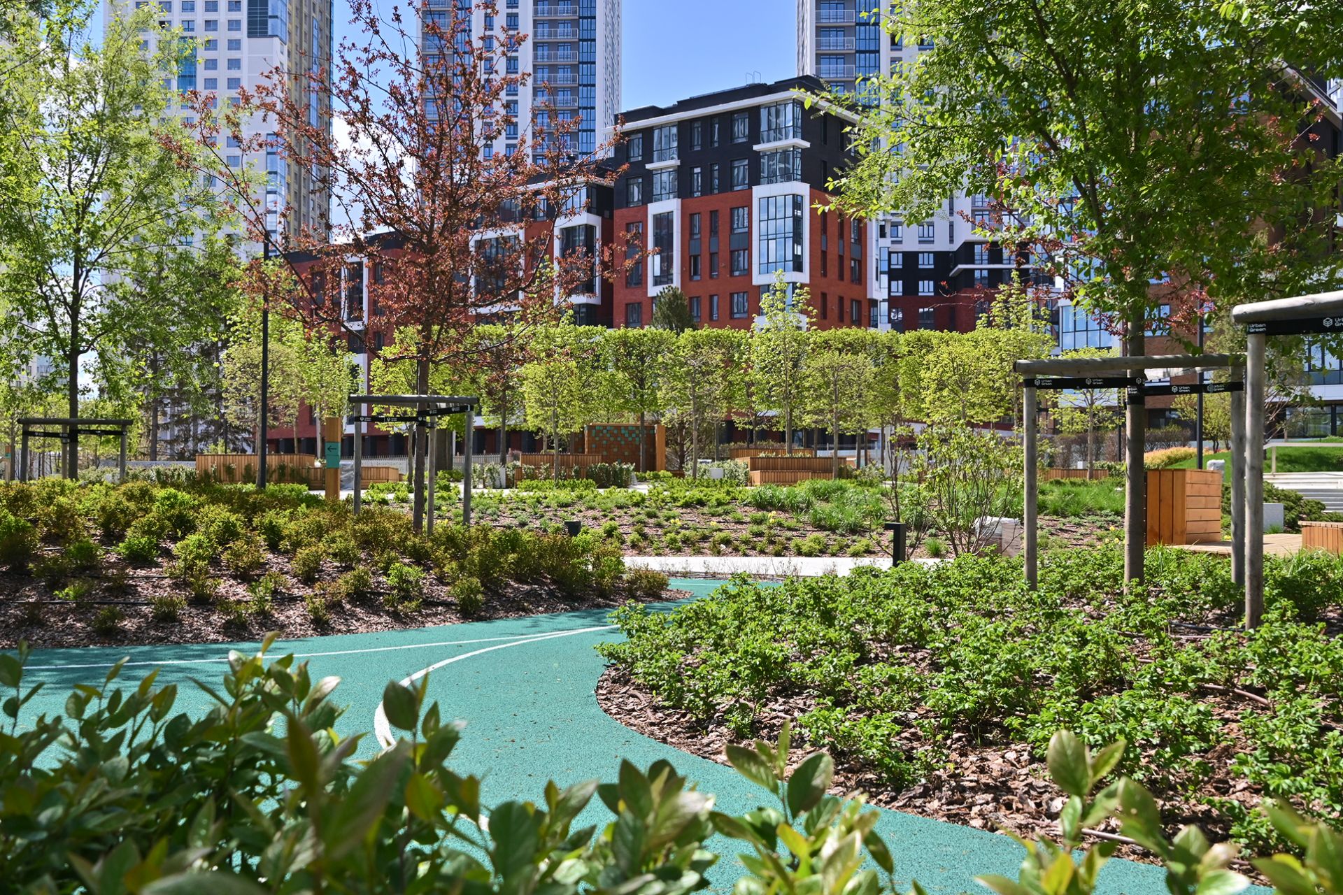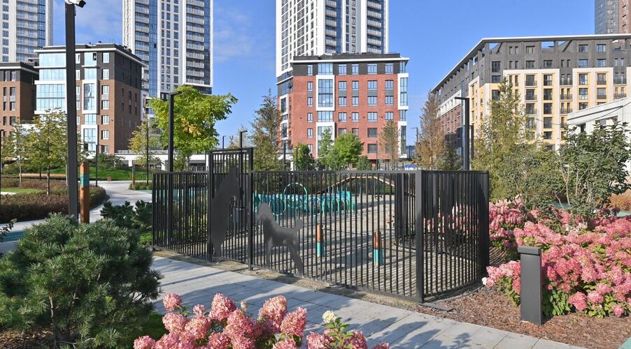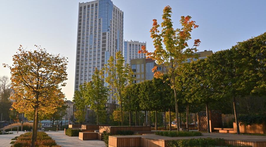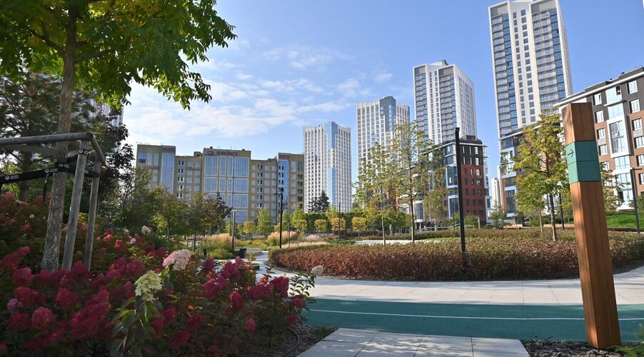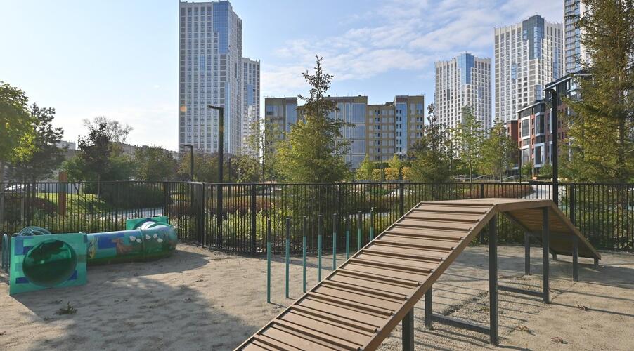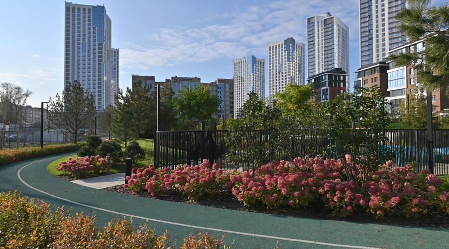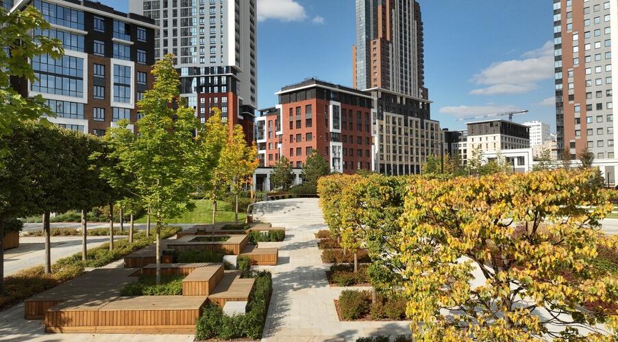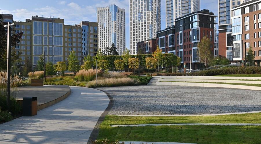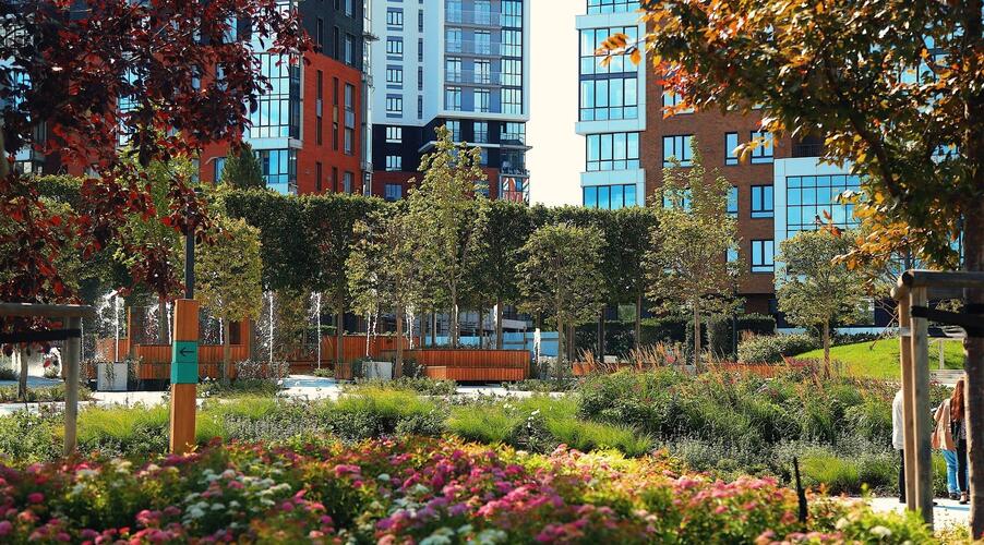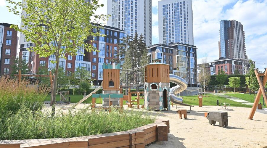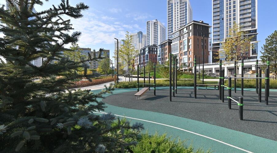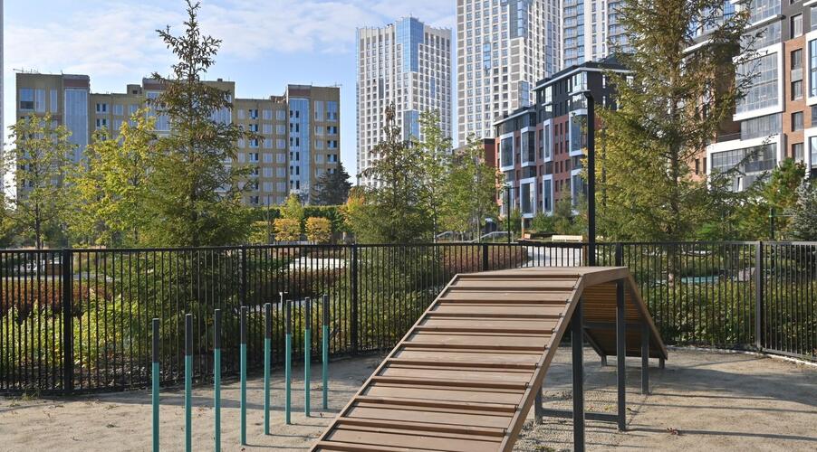 Благоустроенная территория — это ключевая особенность ЖК. Проектом предусмотрено создание масштабного урбан-парка площадью 1 Га с прогулочными аллеями, зонами для отдыха, спортивными кластерами и детскими площадками с безопасным покрытием. Дворы спроектированы как камерные пространства, закрытые для посторонних. Реализована концепция безбарьерной среды, что важно для маломобильных граждан и родителей с колясками.