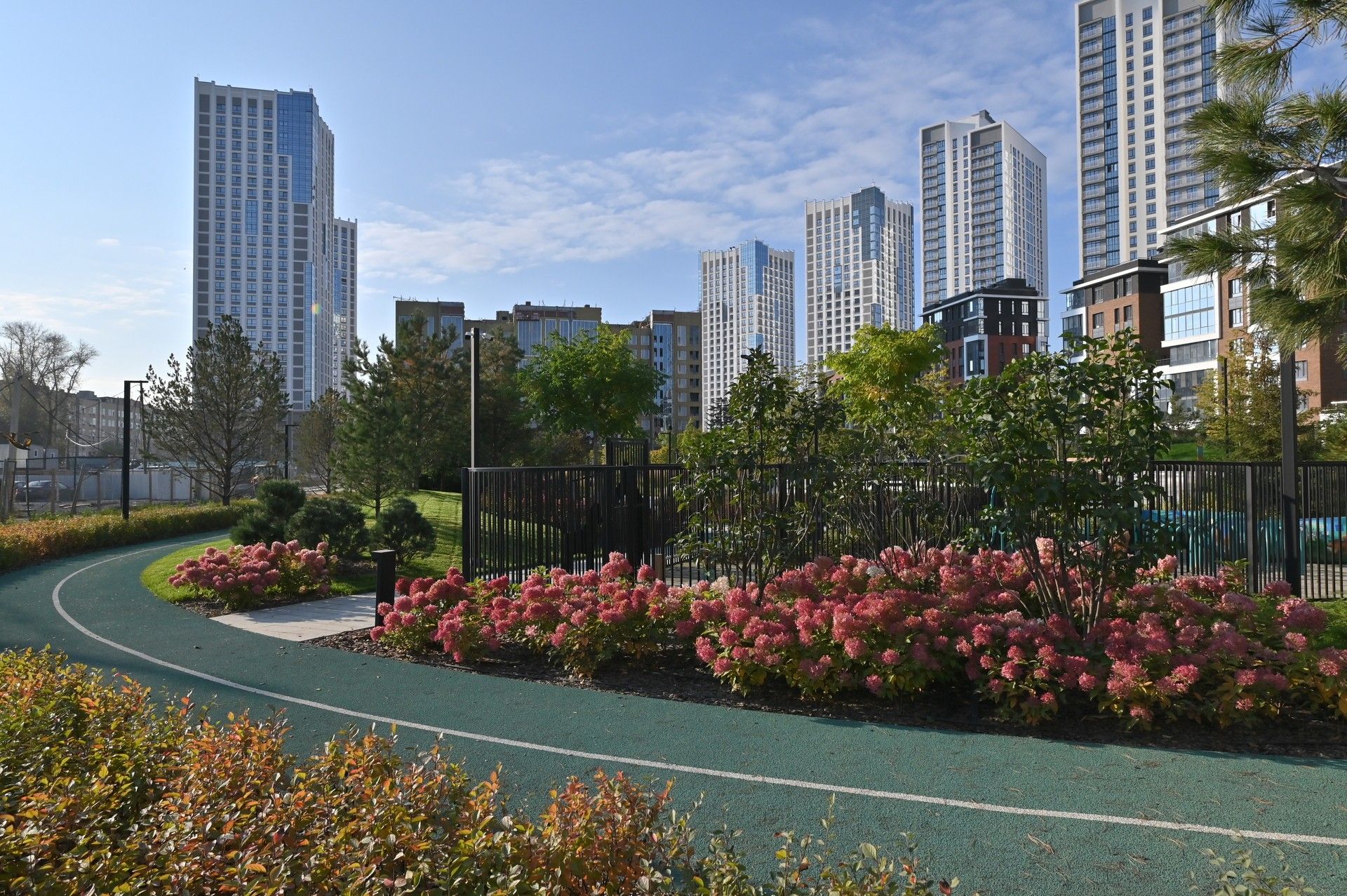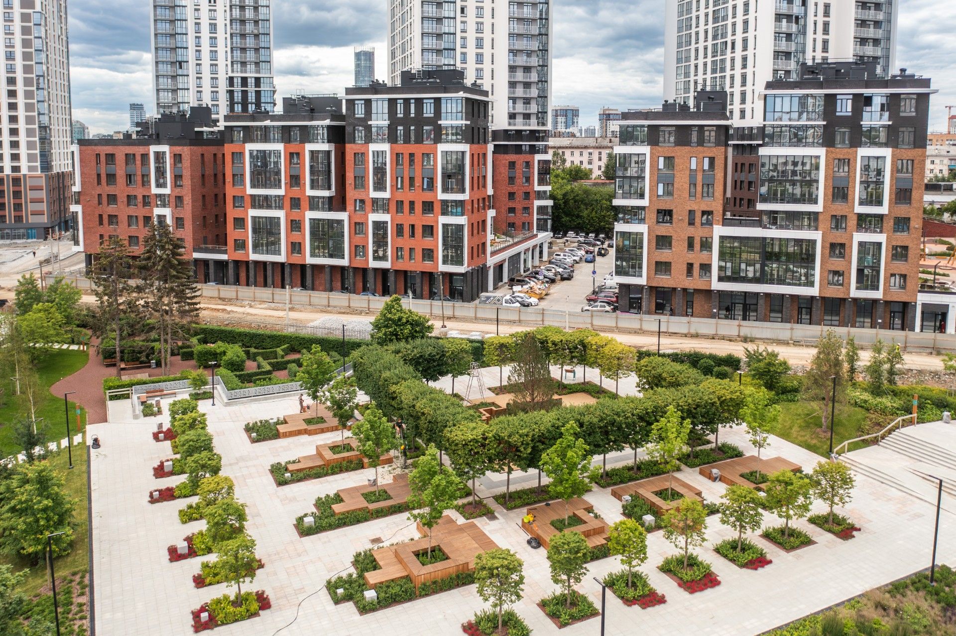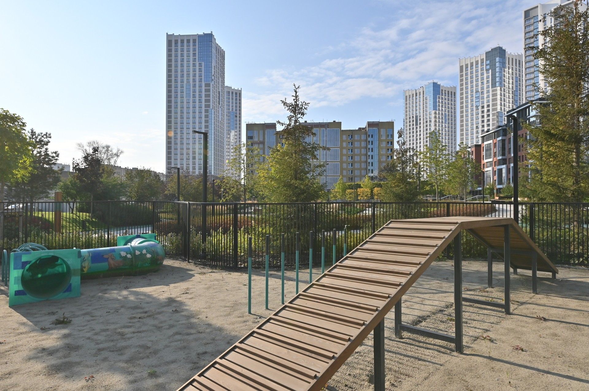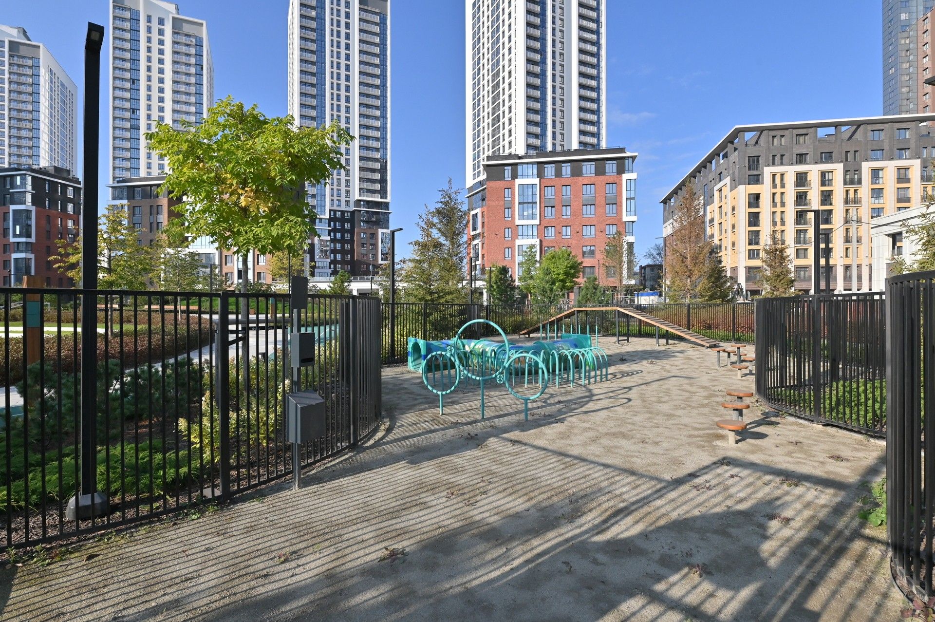 Благоустроенная территория — это ключевая особенность ЖК. Проектом предусмотрено создание масштабного урбан-парка площадью 1 Га с прогулочными аллеями, зонами для отдыха, спортивными кластерами и детскими площадками с безопасным покрытием. Дворы спроектированы как камерные пространства, закрытые для посторонних. Реализована концепция безбарьерной среды, что важно для маломобильных граждан и родителей с колясками.