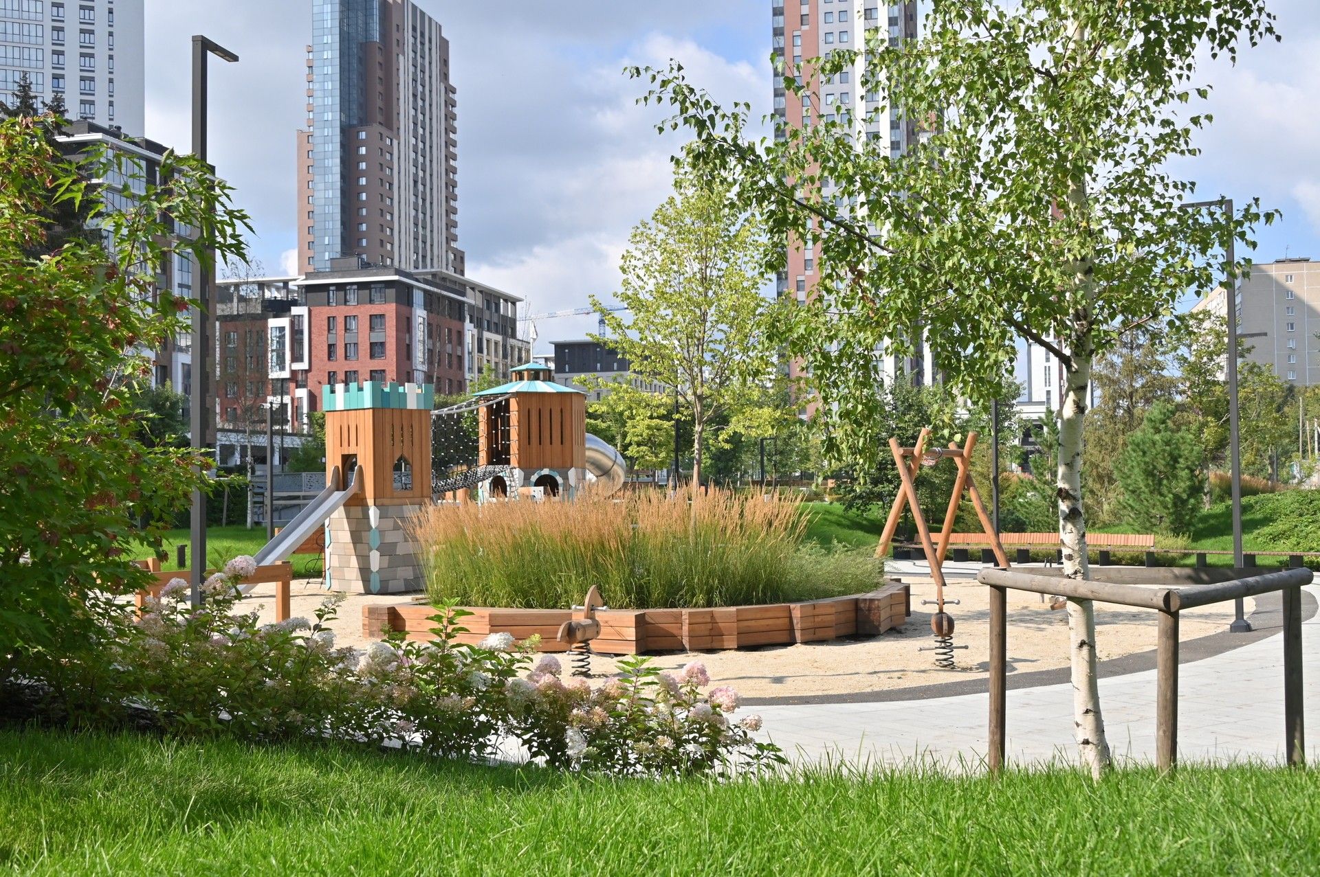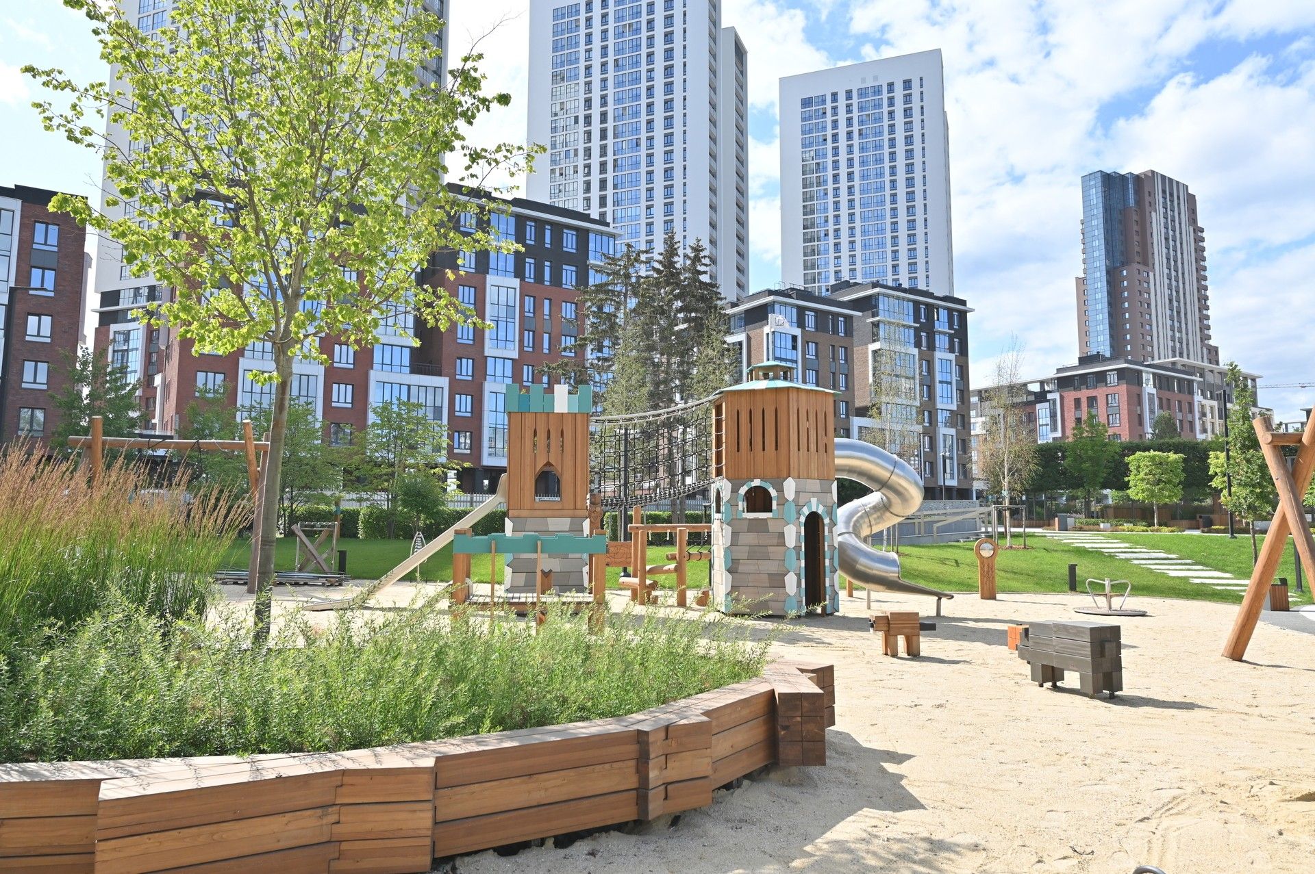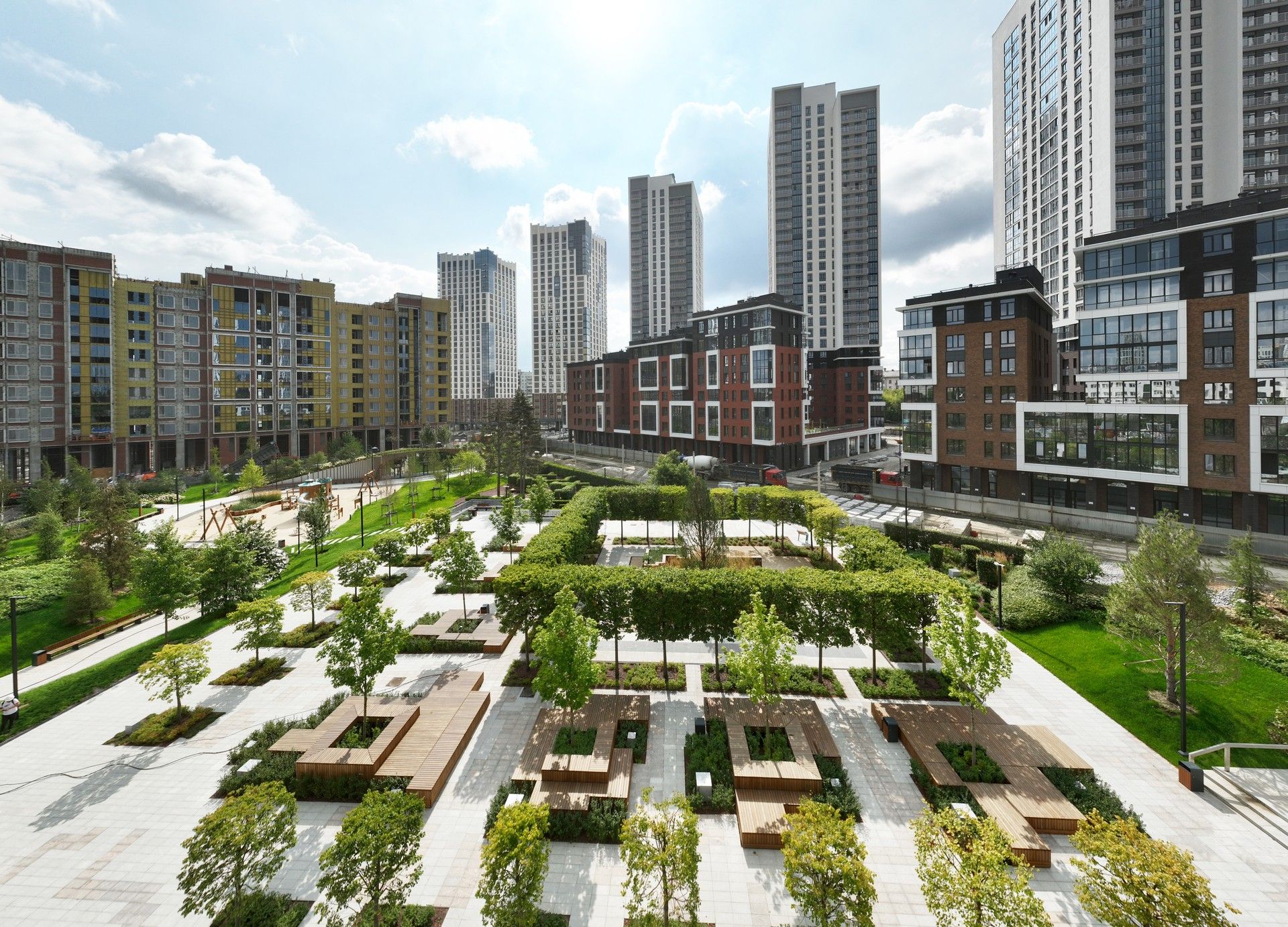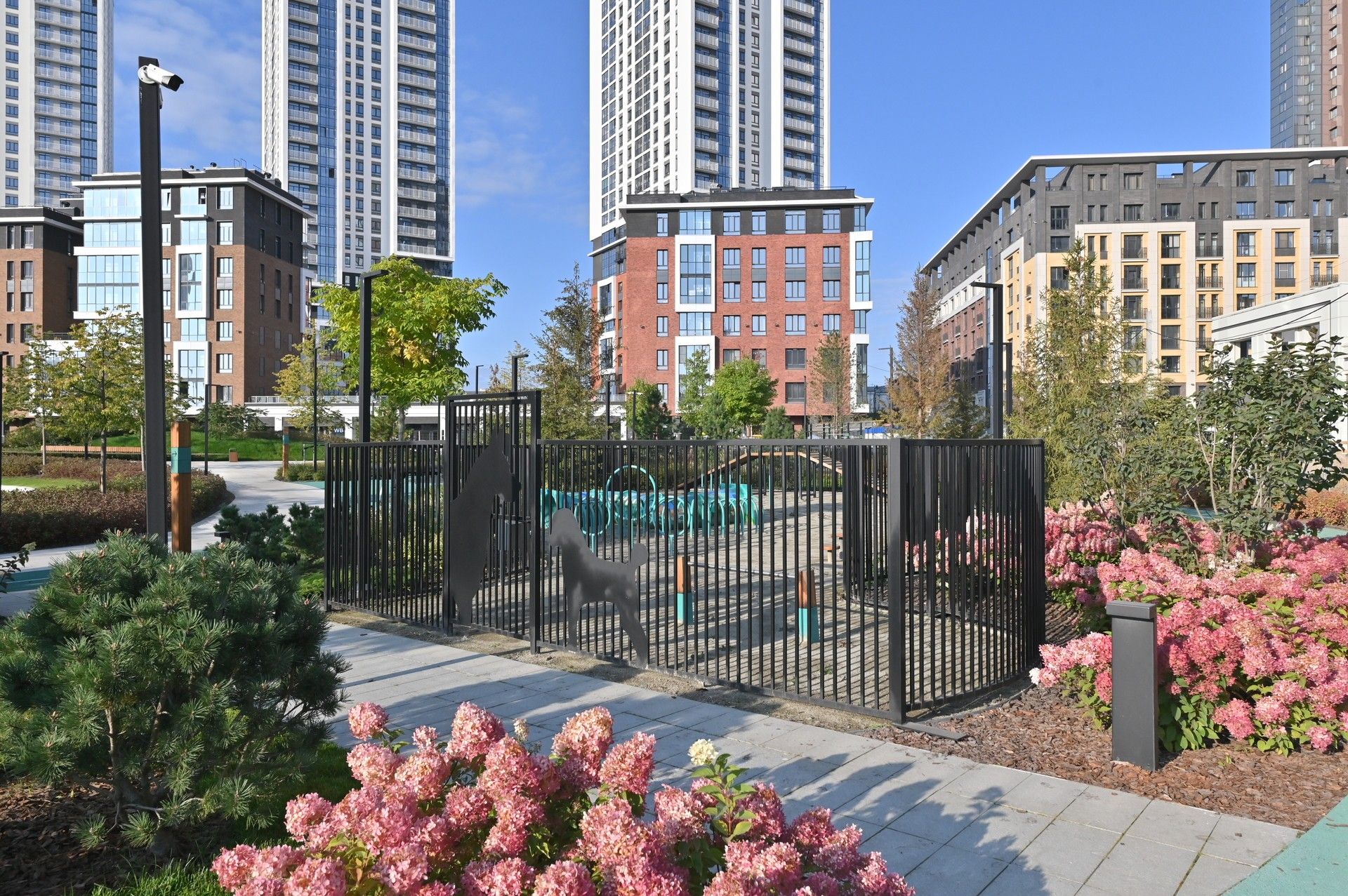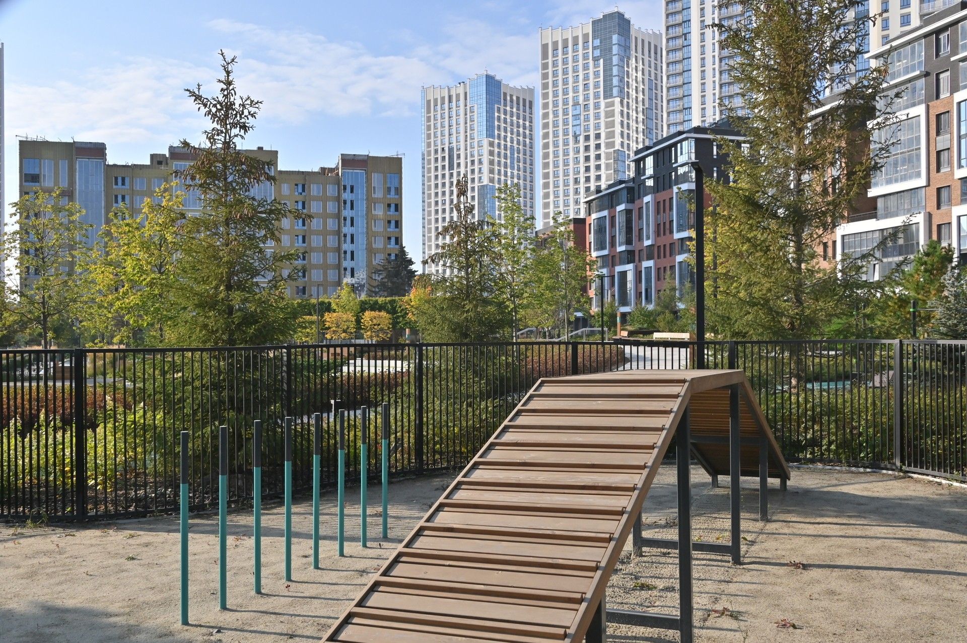 Благоустроенная территория — это ключевая особенность ЖК. Проектом предусмотрено создание масштабного урбан-парка площадью 1 Га с прогулочными аллеями, зонами для отдыха, спортивными кластерами и детскими площадками с безопасным покрытием. Дворы спроектированы как камерные пространства, закрытые для посторонних. Реализована концепция безбарьерной среды, что важно для маломобильных граждан и родителей с колясками.