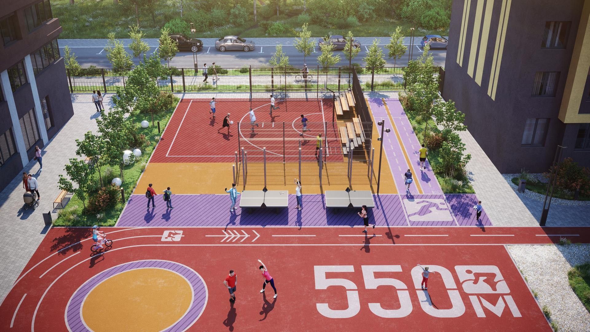 | Спортивные зоны | Воркаут-площадки, корты, велодорожки. |