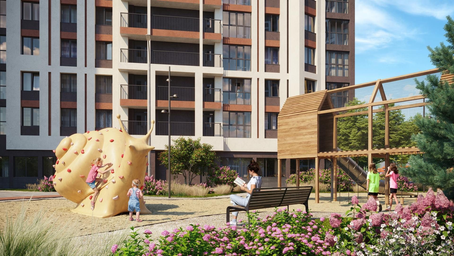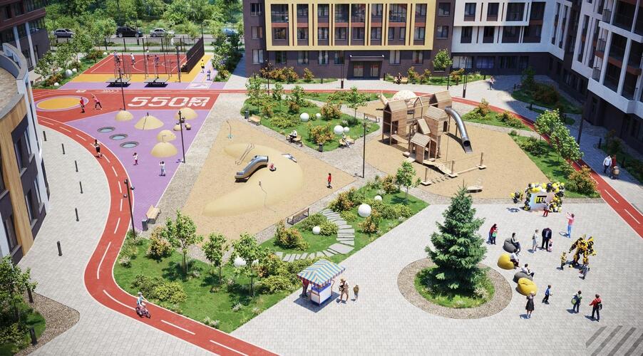 Дворы комплекса — закрытые от машин и зонированы для разных групп жителей.