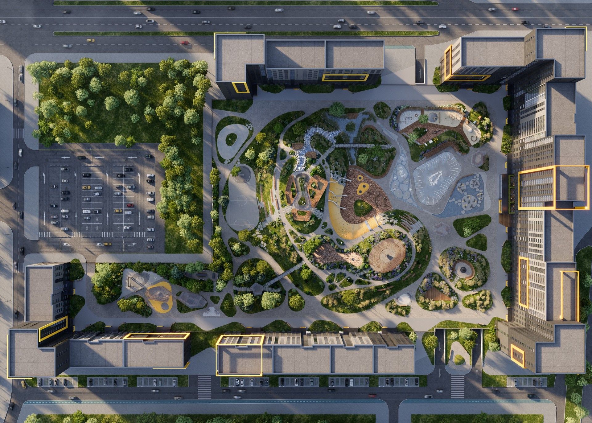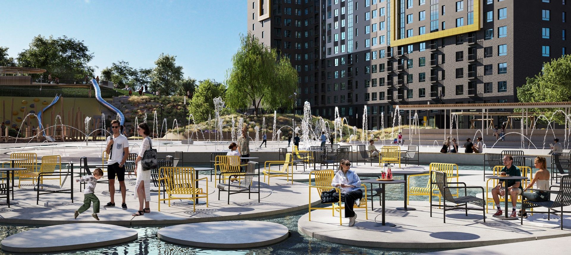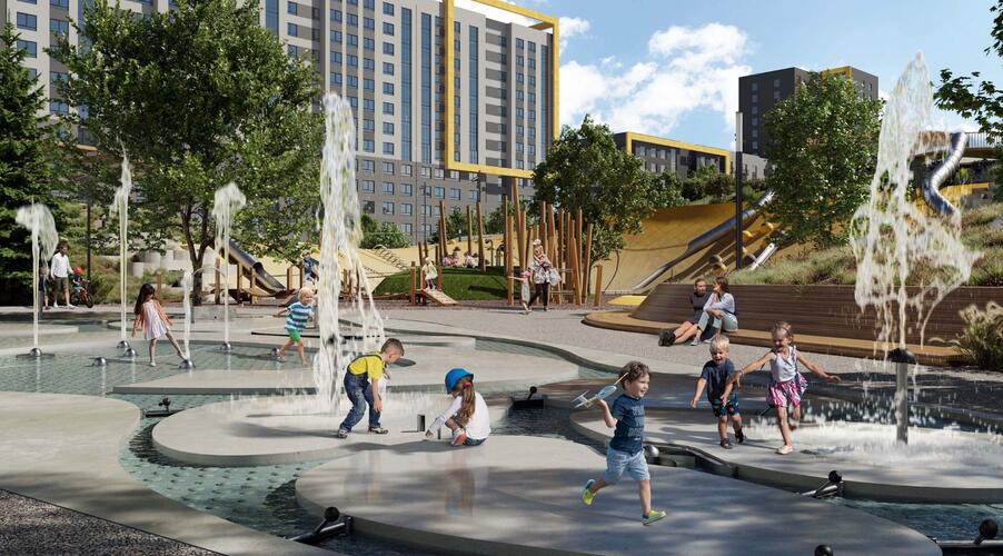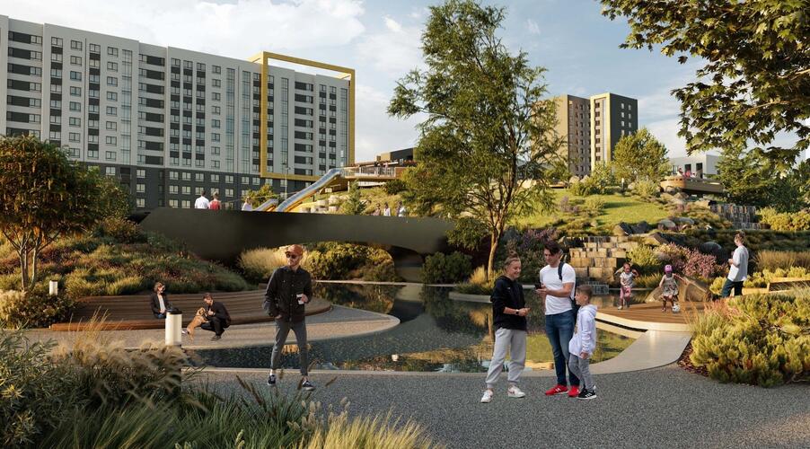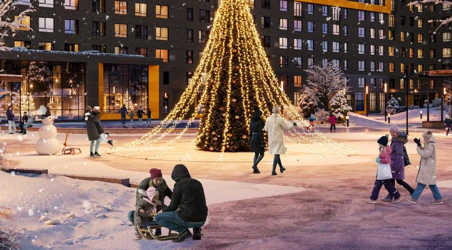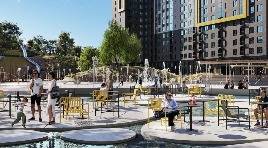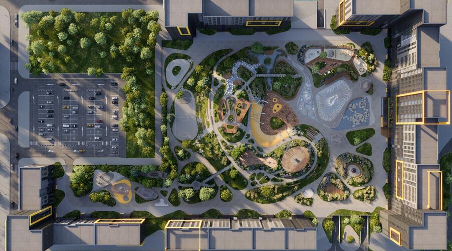 - Инновационное дворовое пространство. Концепция «двора-трансформера» не имеет аналогов в регионе. На территории созданы искусственные холмы высотой 6 и 9 метров с винтовыми горками, зиплайном и зимними спусками для тюбинга. Центральным элементом является рукотворная река с водопадом, которая летом создаёт прохладу, а зимой превращается в каток. Пространство разделено на 19 тематических зон для разного возраста и типа отдыха, что исключает конфликты между активными играми детей и спокойным отдыхом взрослых.