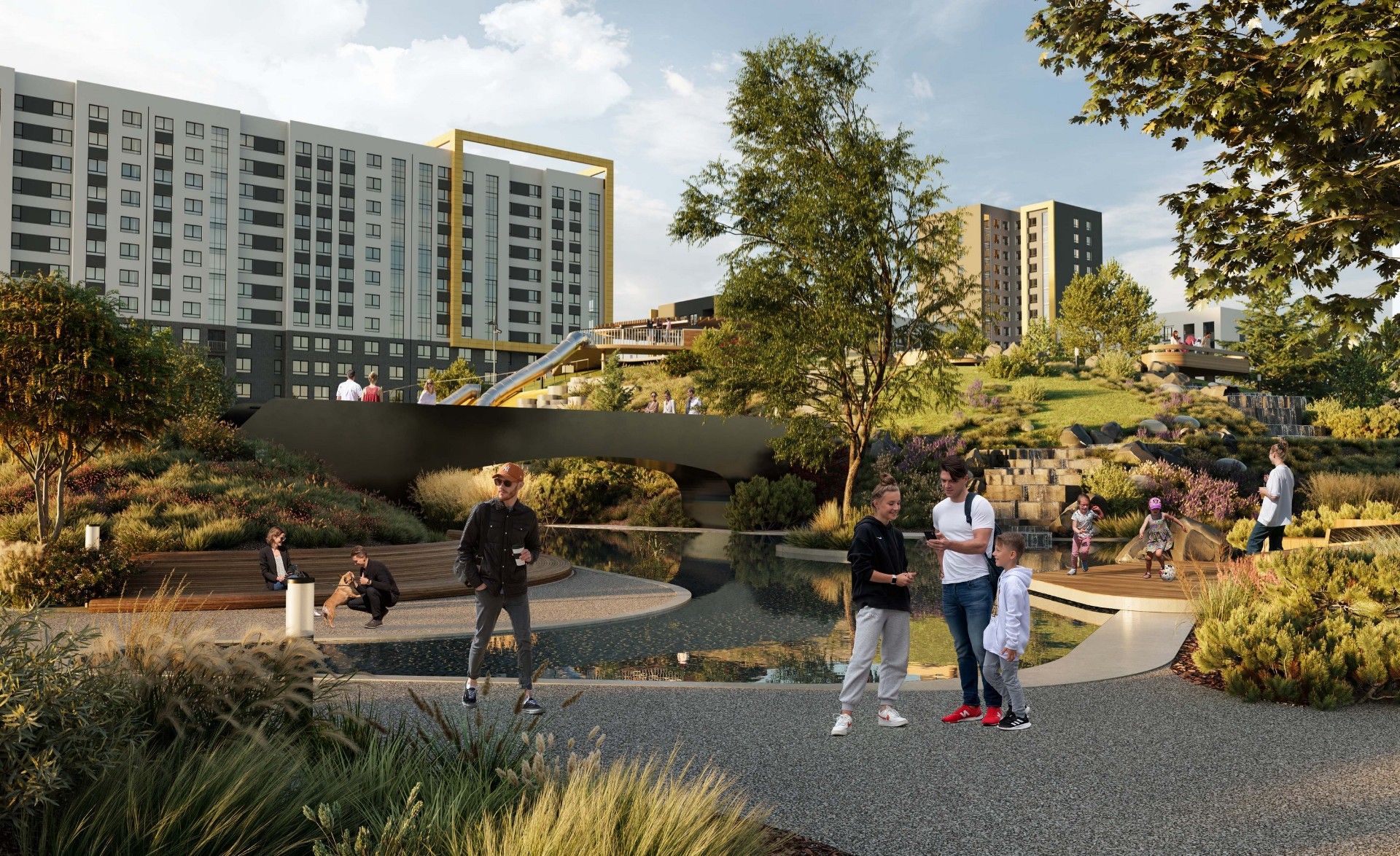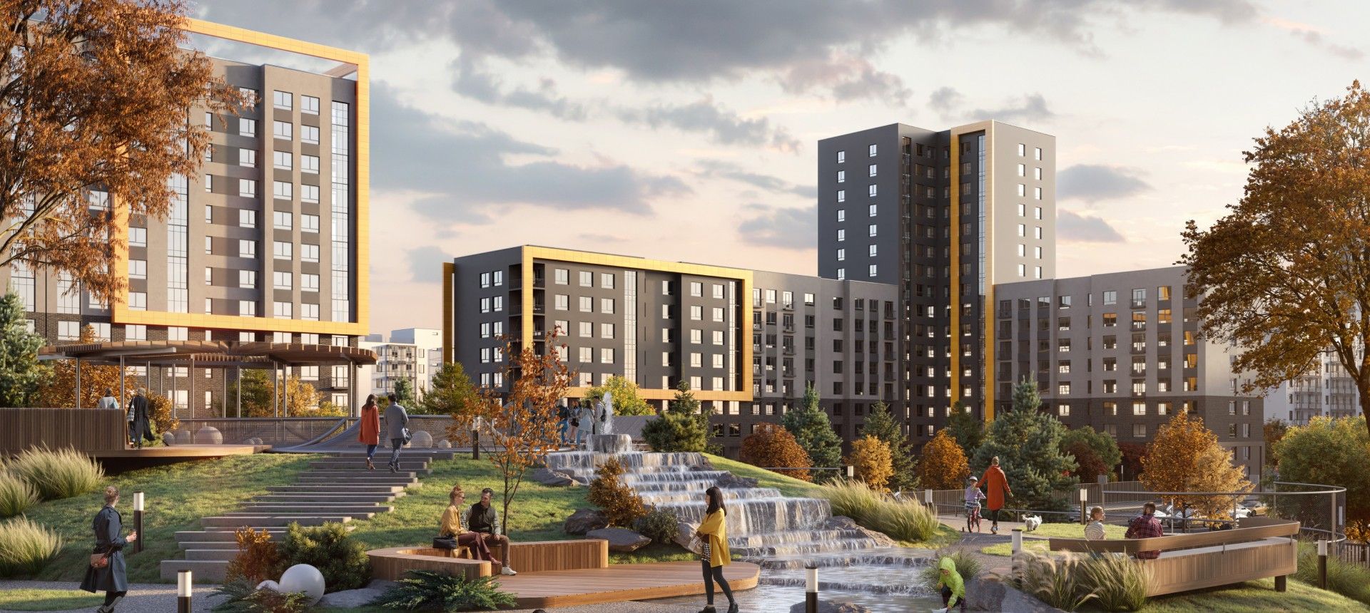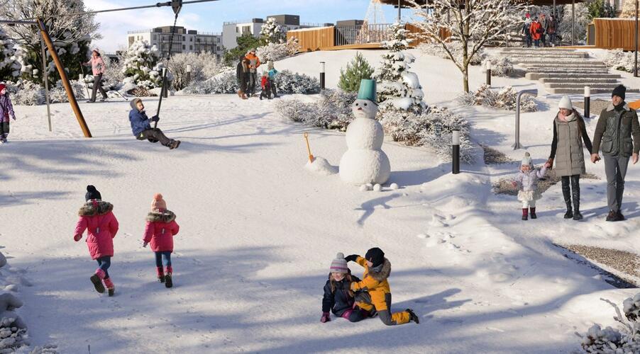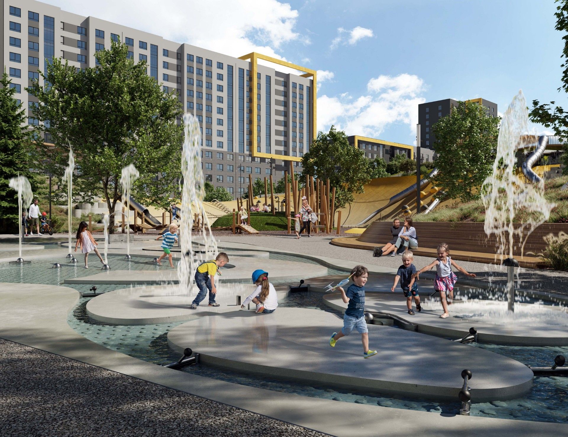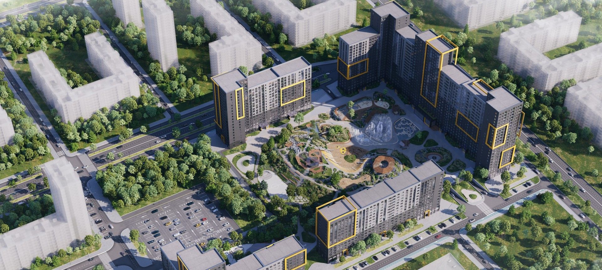 - Инновационное дворовое пространство. Концепция «двора-трансформера» не имеет аналогов в регионе. На территории созданы искусственные холмы высотой 6 и 9 метров с винтовыми горками, зиплайном и зимними спусками для тюбинга. Центральным элементом является рукотворная река с водопадом, которая летом создаёт прохладу, а зимой превращается в каток. Пространство разделено на 19 тематических зон для разного возраста и типа отдыха, что исключает конфликты между активными играми детей и спокойным отдыхом взрослых.
