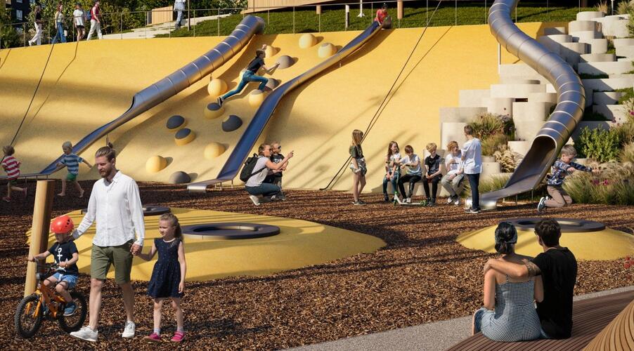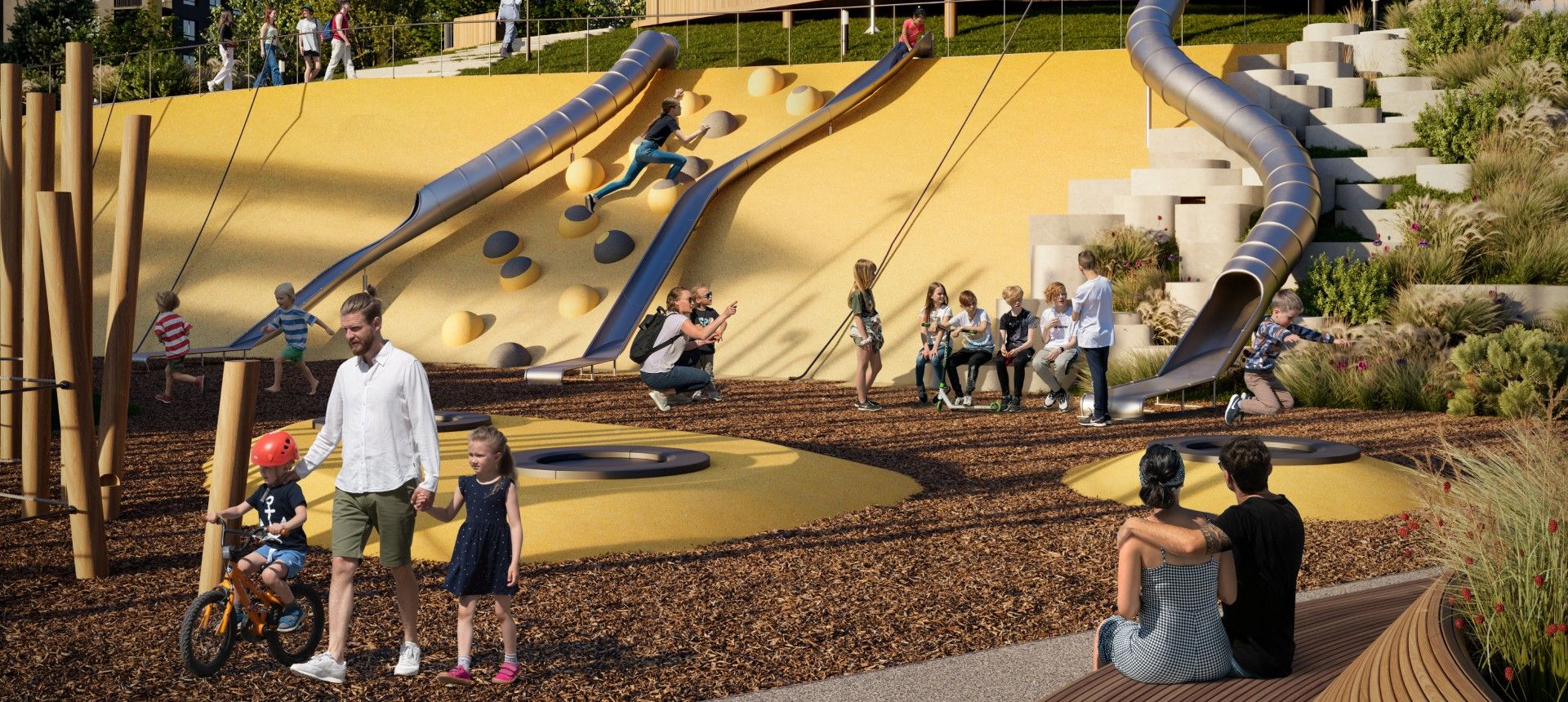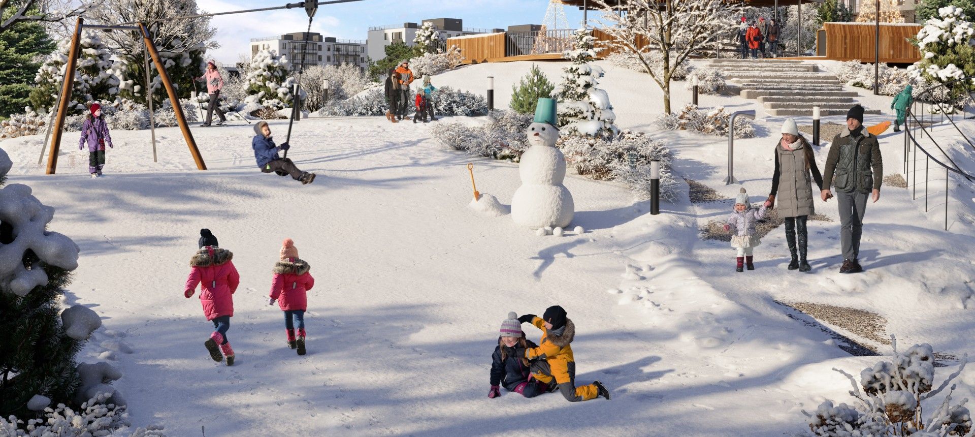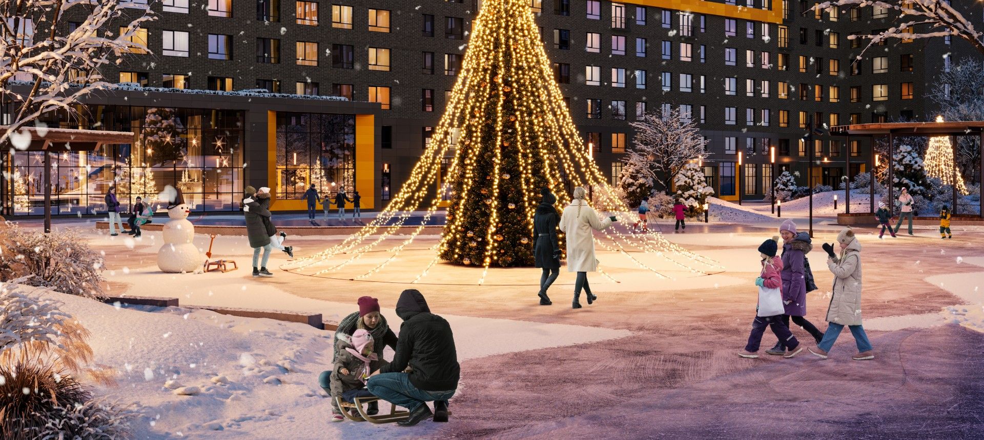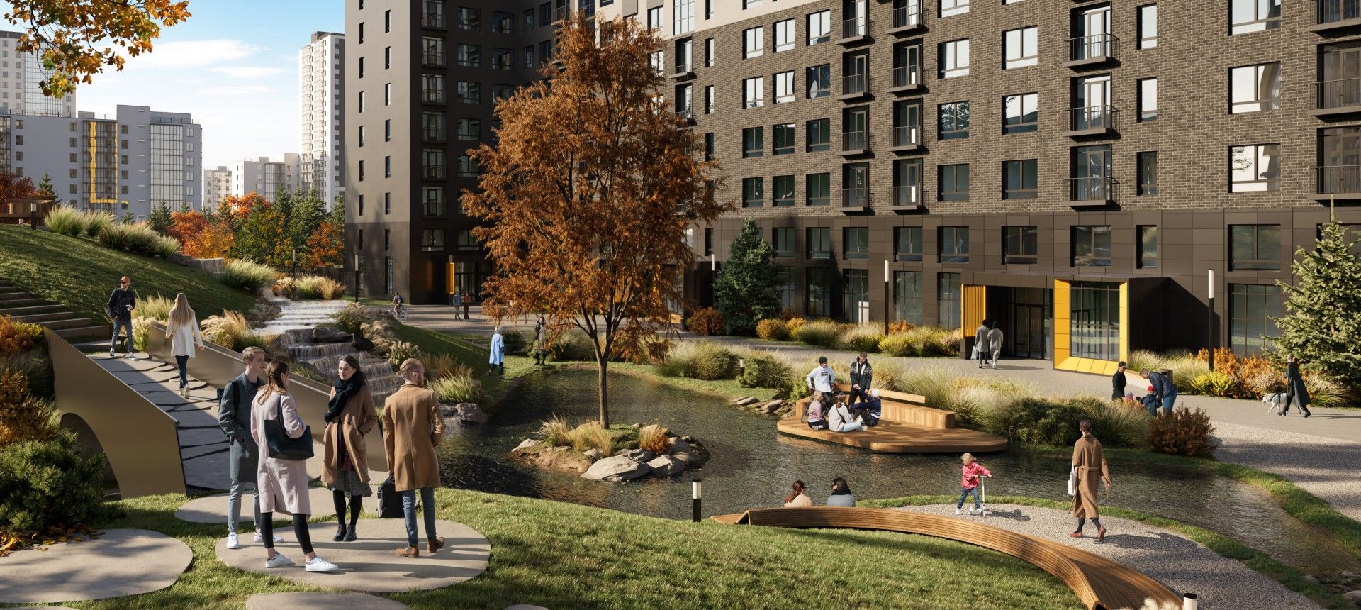 - Инновационное дворовое пространство. Концепция «двора-трансформера» не имеет аналогов в регионе. На территории созданы искусственные холмы высотой 6 и 9 метров с винтовыми горками, зиплайном и зимними спусками для тюбинга. Центральным элементом является рукотворная река с водопадом, которая летом создаёт прохладу, а зимой превращается в каток. Пространство разделено на 19 тематических зон для разного возраста и типа отдыха, что исключает конфликты между активными играми детей и спокойным отдыхом взрослых.