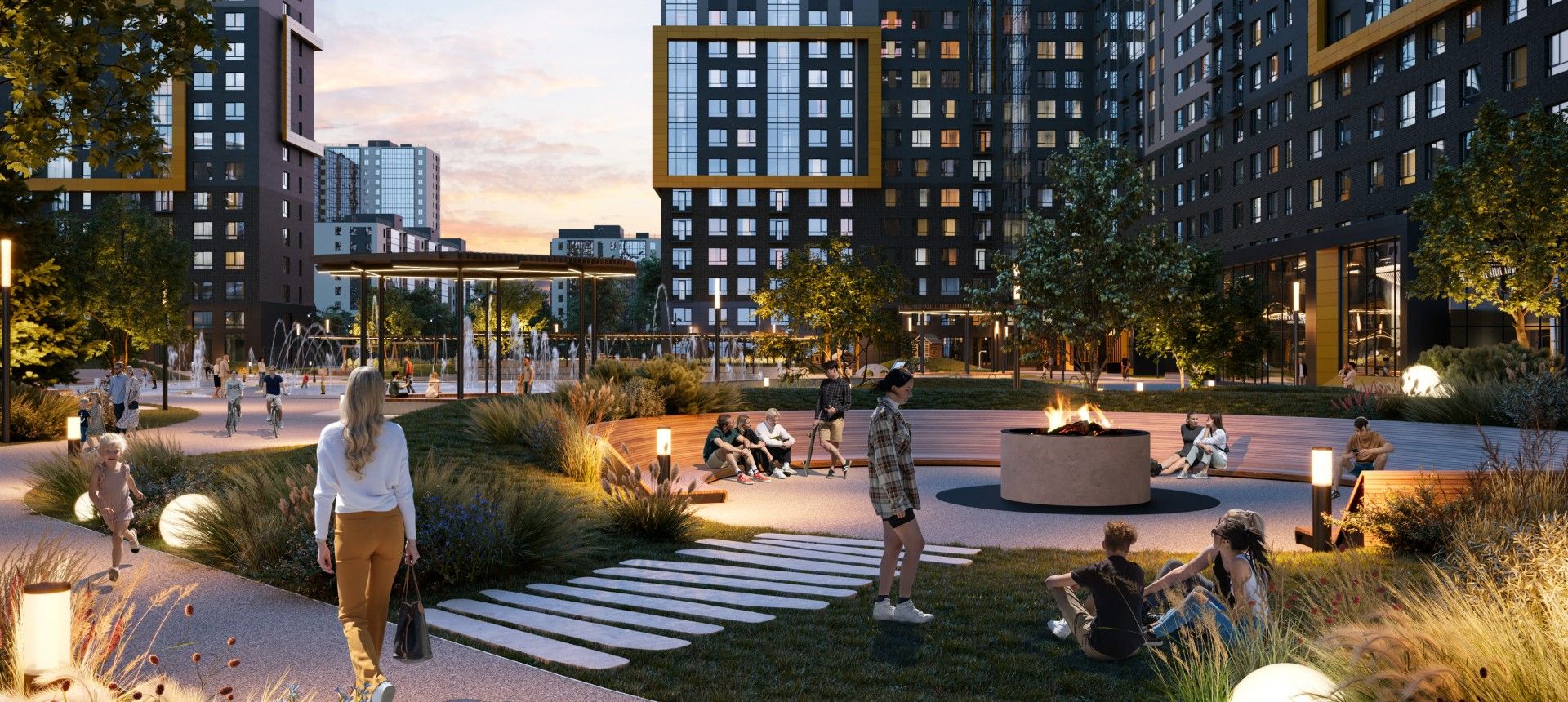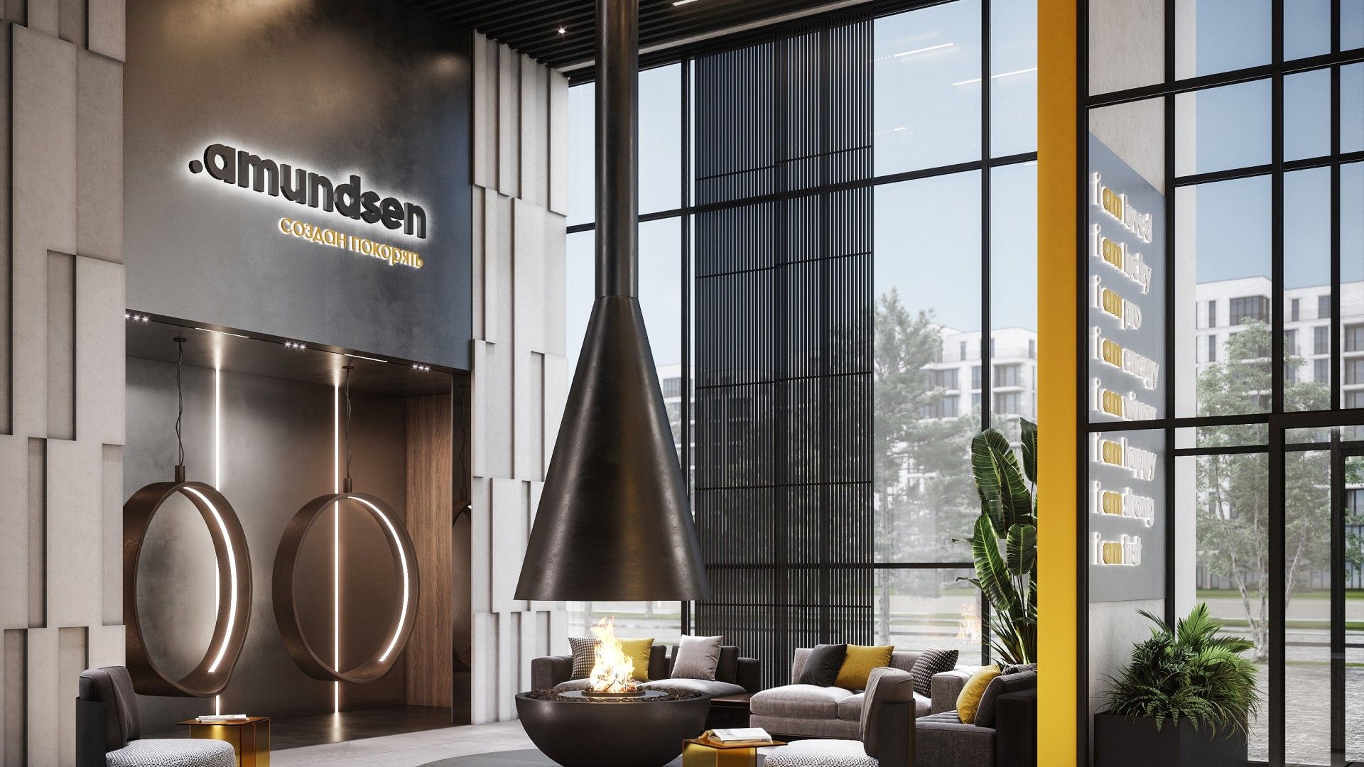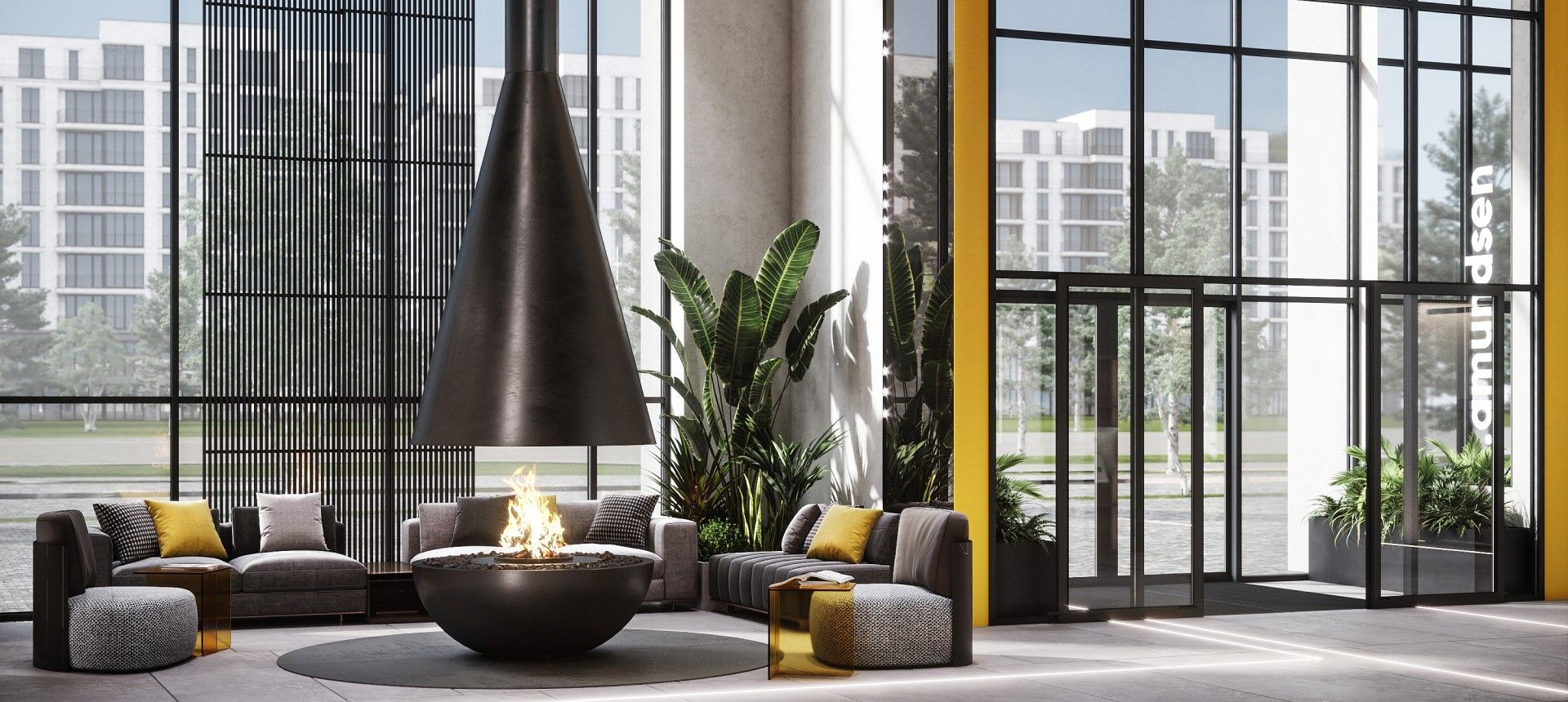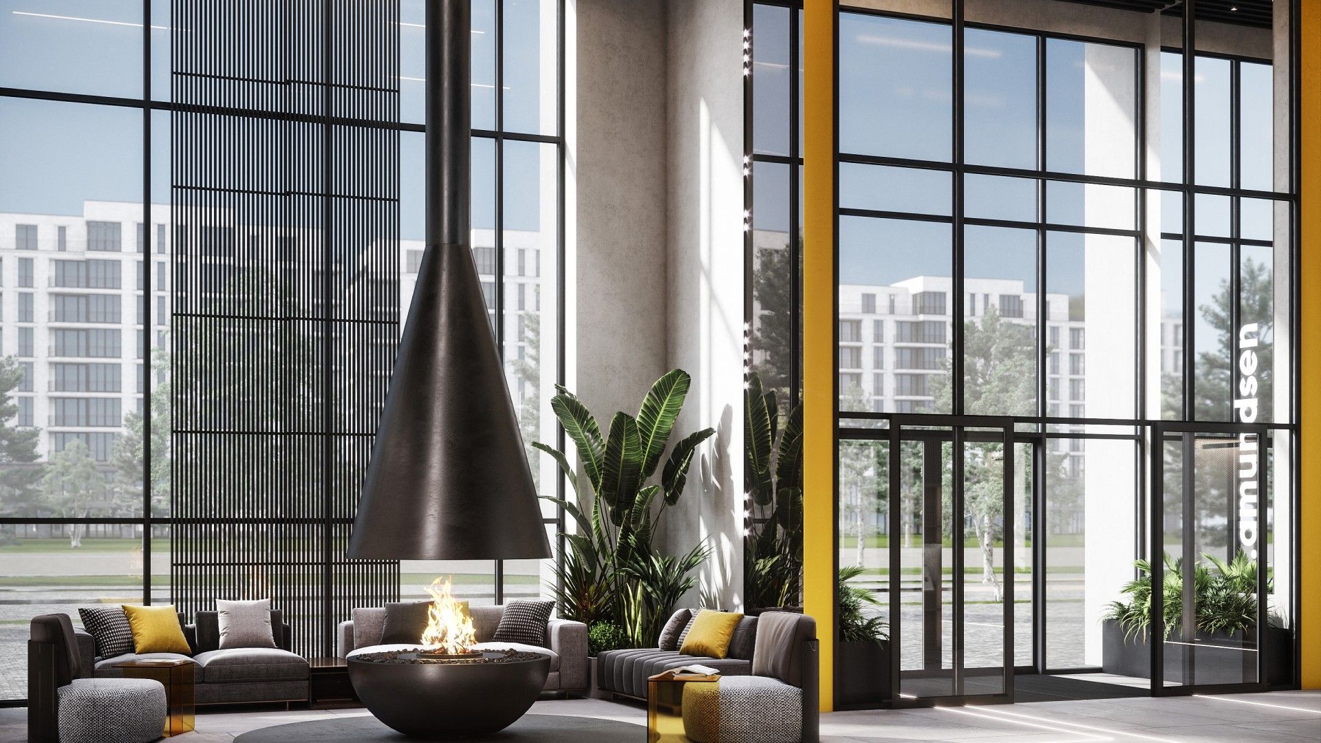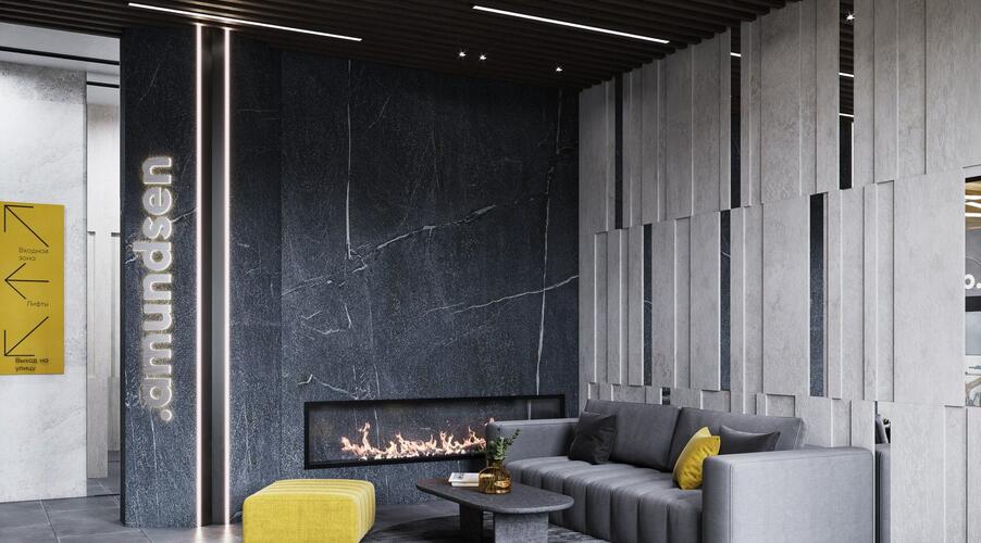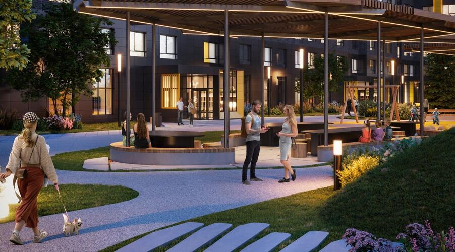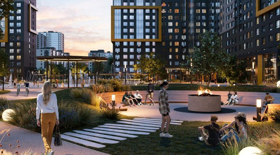 Главный акцент сделан на продуманном общественном пространстве. Фасады зданий выполнены в графитовых тонах с яркими жёлтыми акцентами, сочетая декоративную штукатурку и вентилируемые панели. Однако истинной «фишкой» Amundsen является его двор-парк площадью 3.5 гектара, разработанный при участии ландшафтных дизайнеров, детских психологов и специалистов по физическому развитию. Это не просто зелёная зона, а многофункциональная среда для всесезонного отдыха.