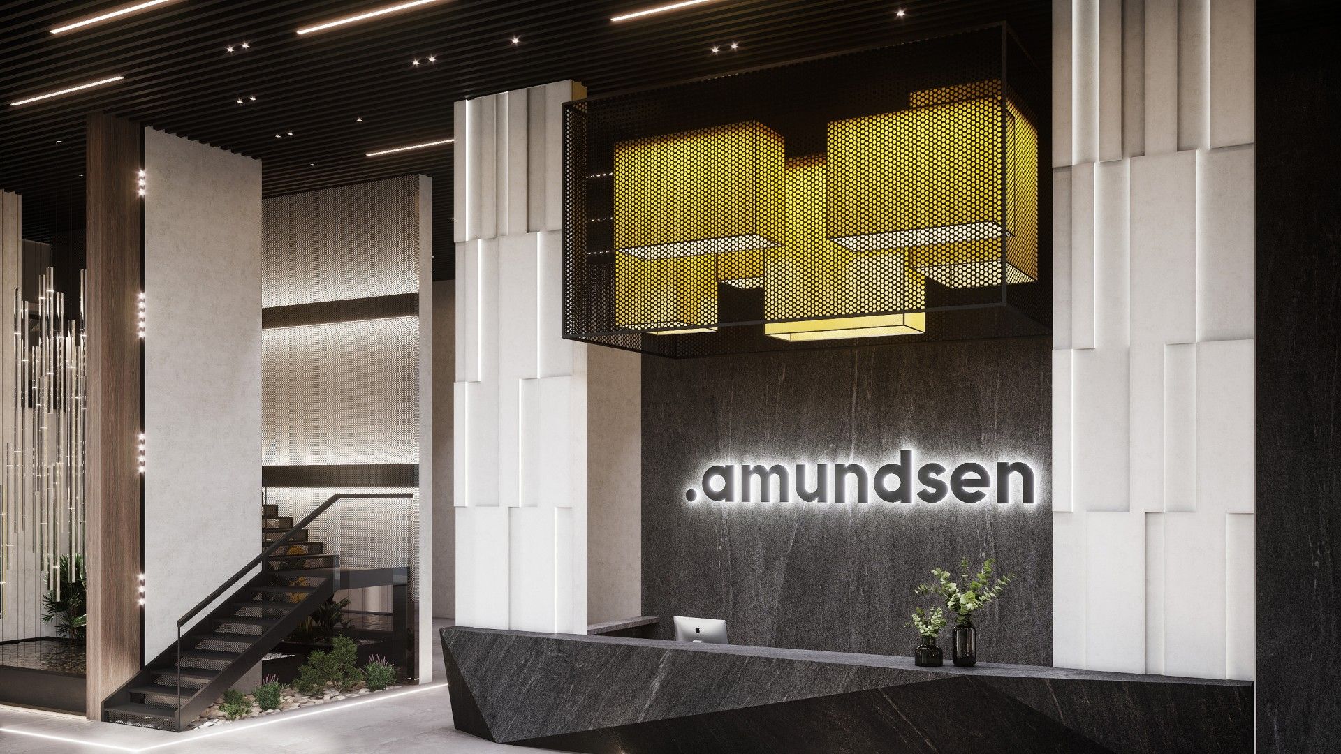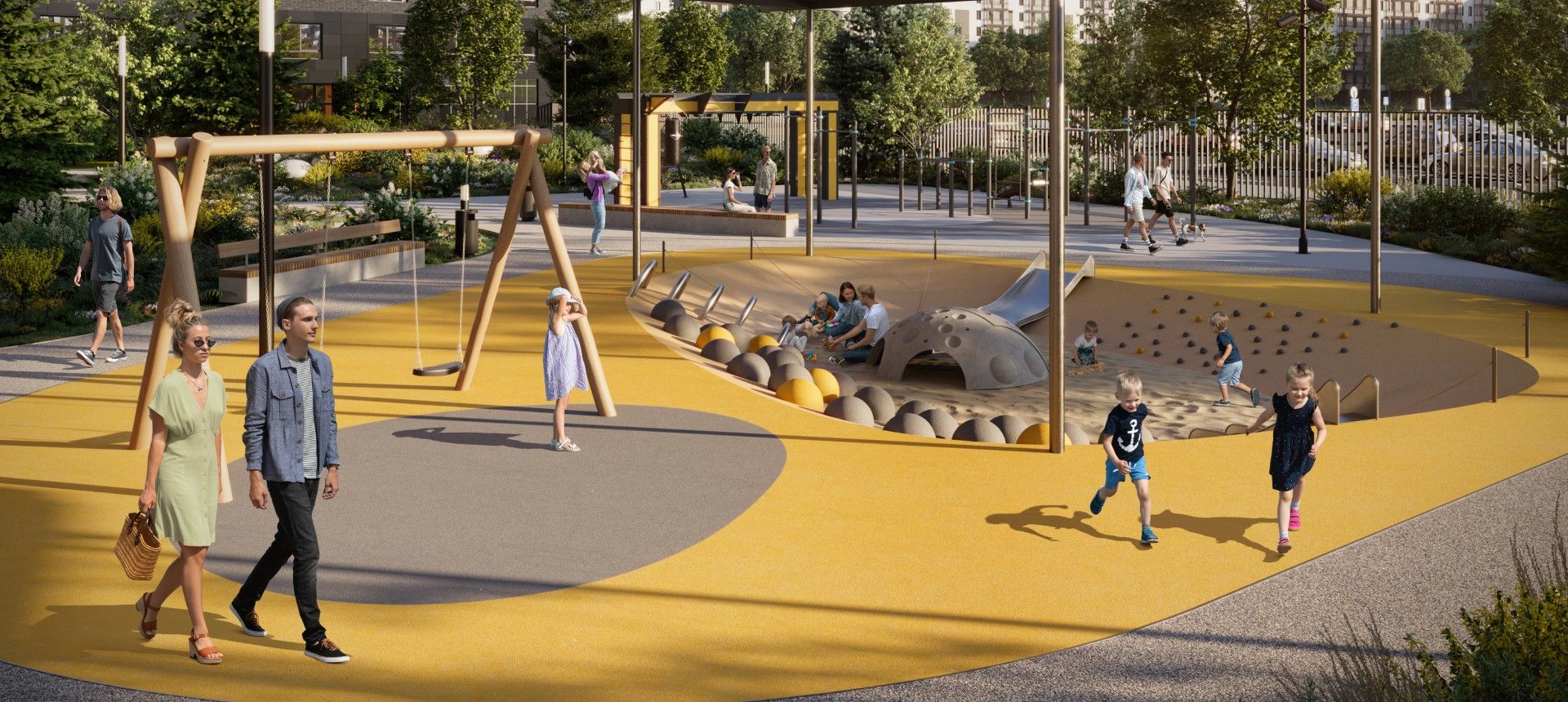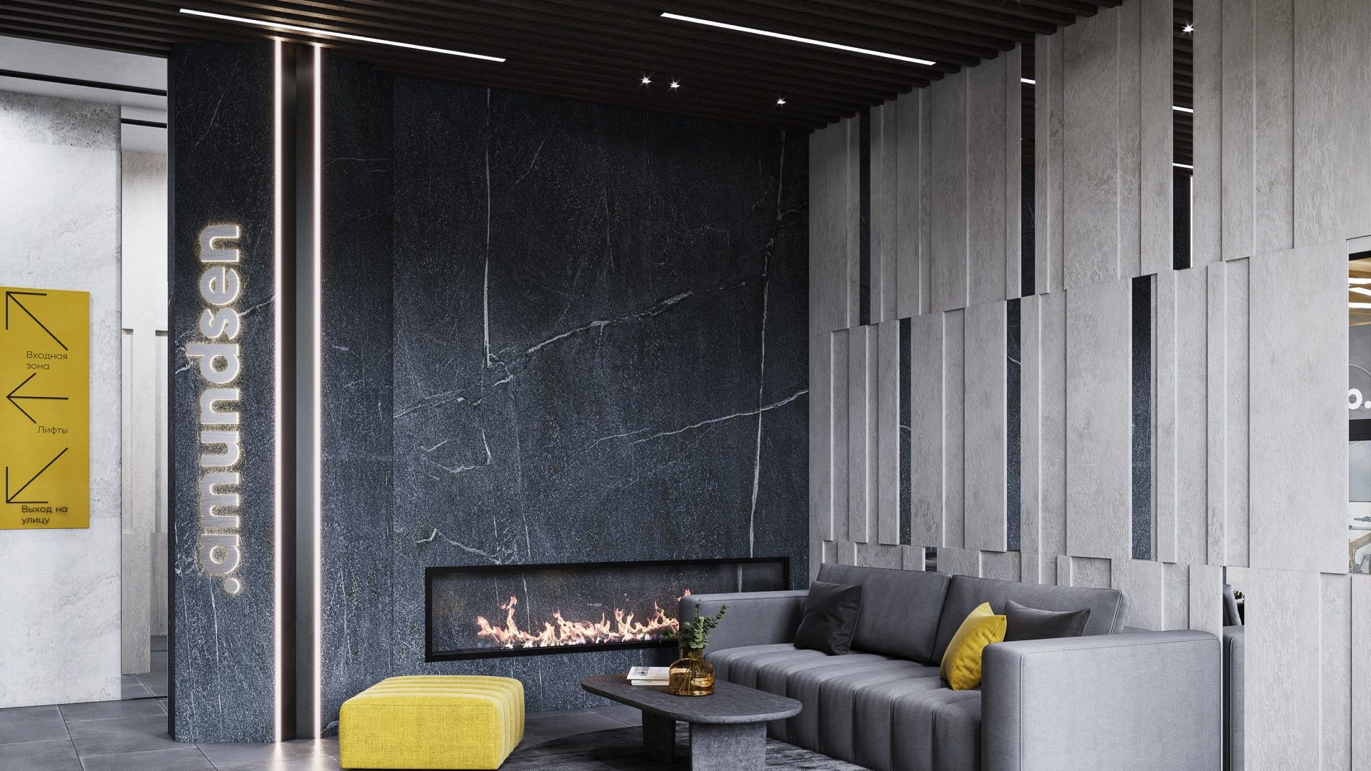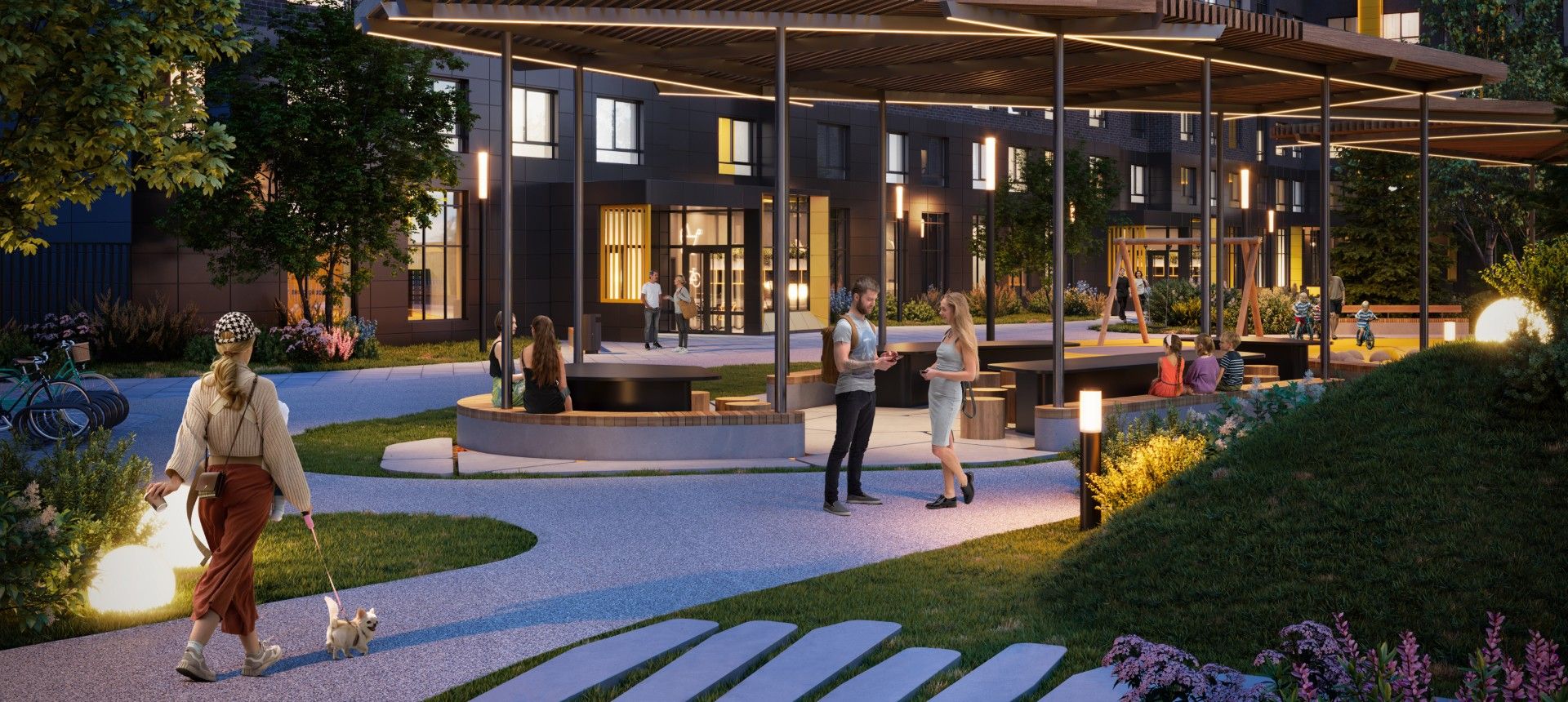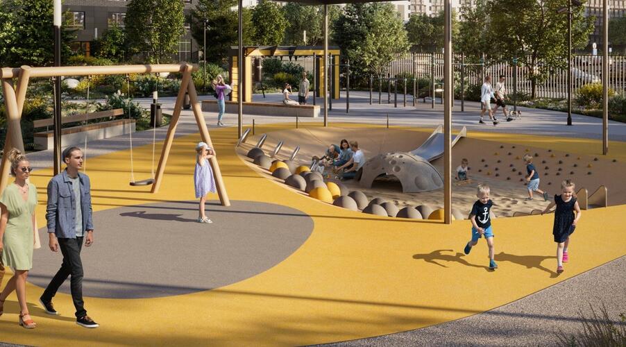 Главный акцент сделан на продуманном общественном пространстве. Фасады зданий выполнены в графитовых тонах с яркими жёлтыми акцентами, сочетая декоративную штукатурку и вентилируемые панели. Однако истинной «фишкой» Amundsen является его двор-парк площадью 3.5 гектара, разработанный при участии ландшафтных дизайнеров, детских психологов и специалистов по физическому развитию. Это не просто зелёная зона, а многофункциональная среда для всесезонного отдыха.