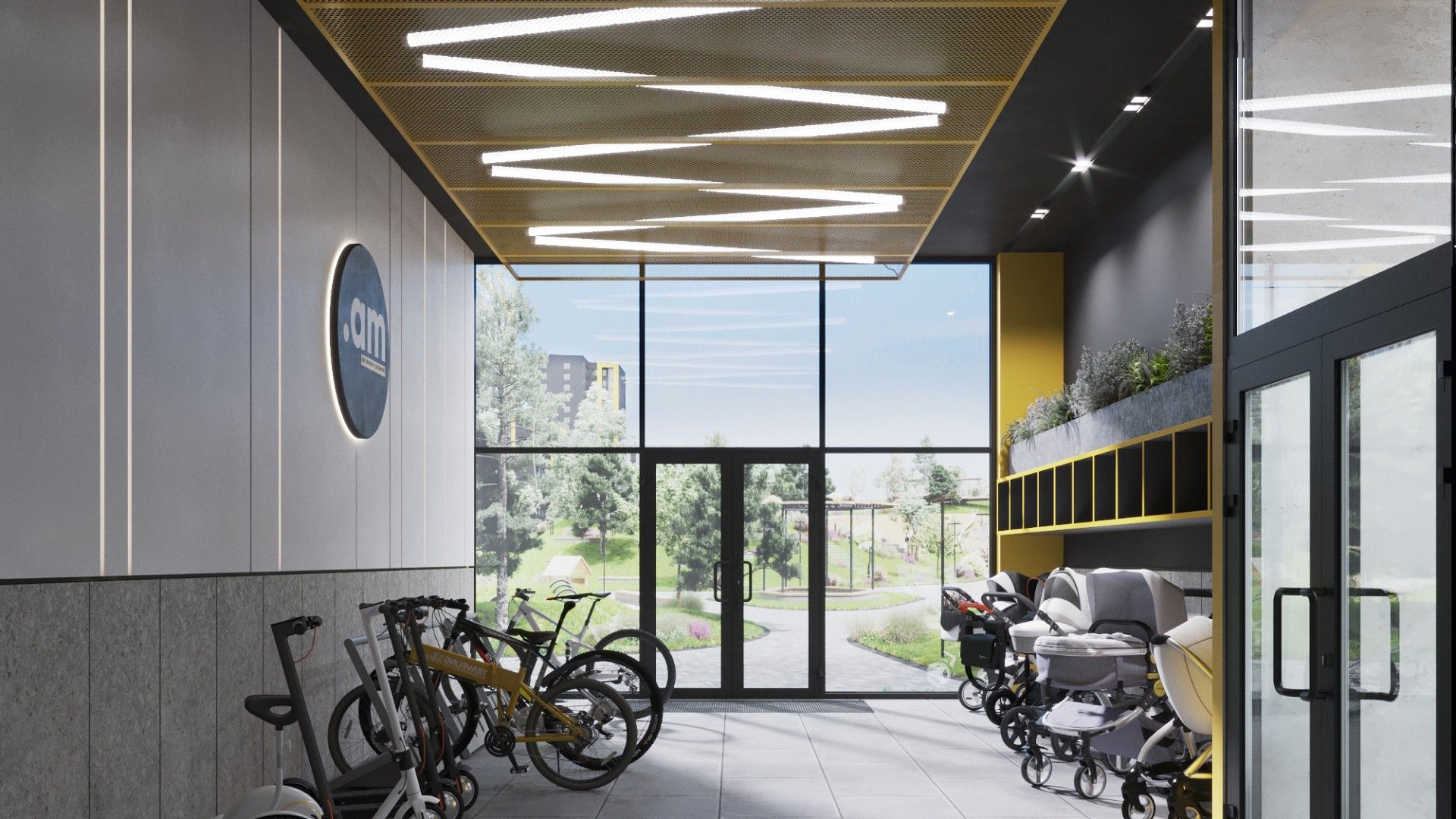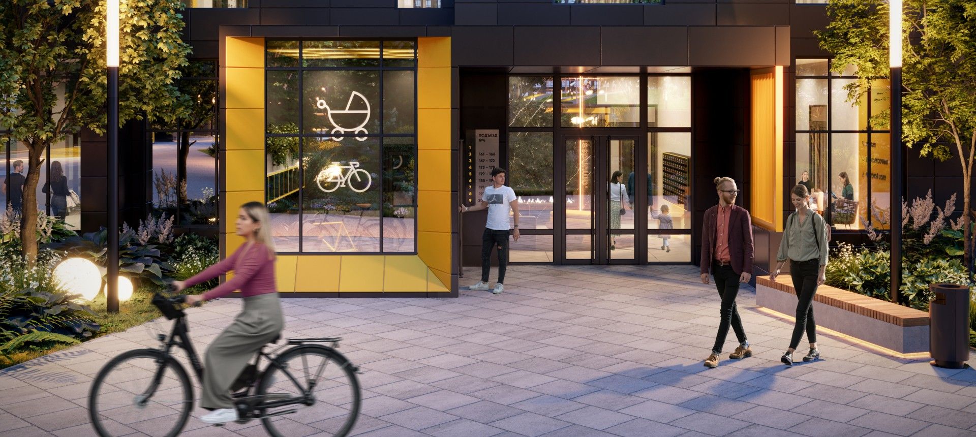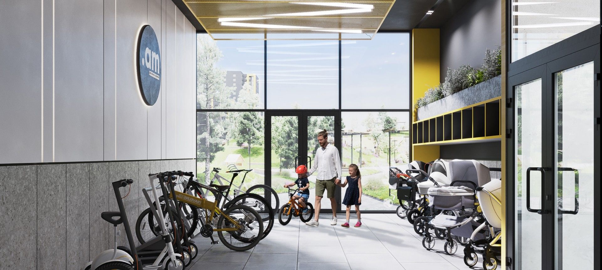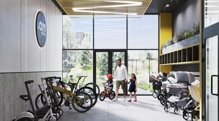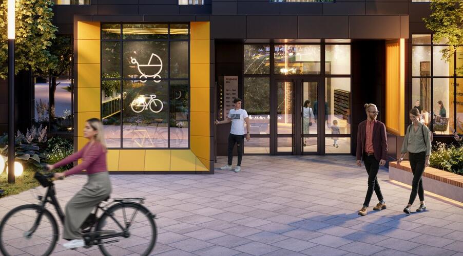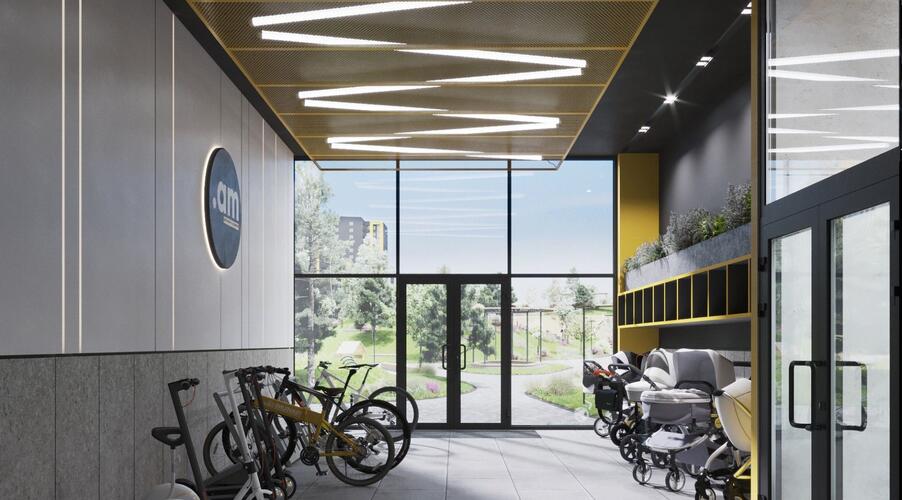 - Закрытые помещения для хранения колясок и велосипедов.
