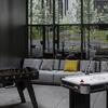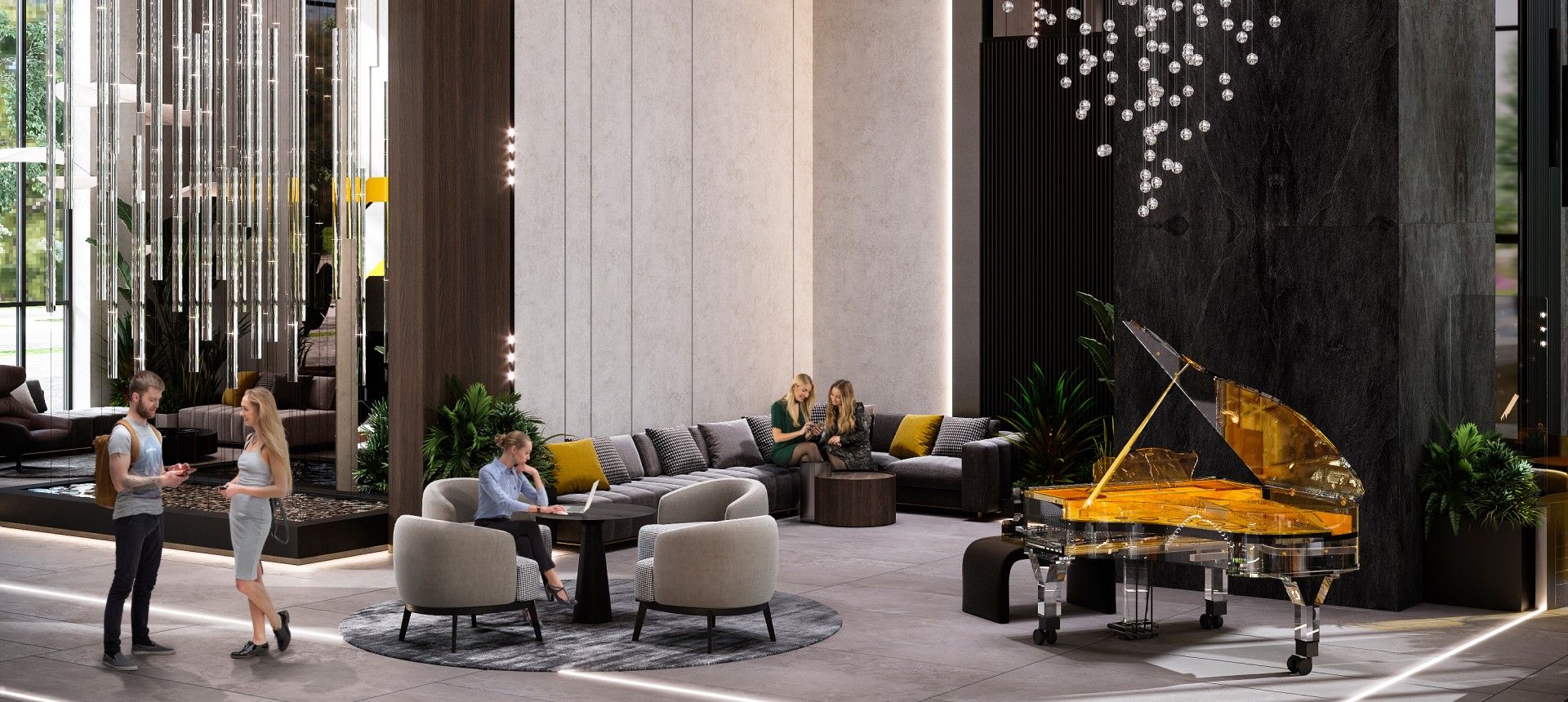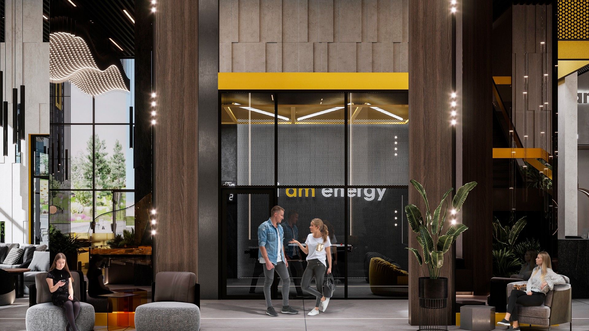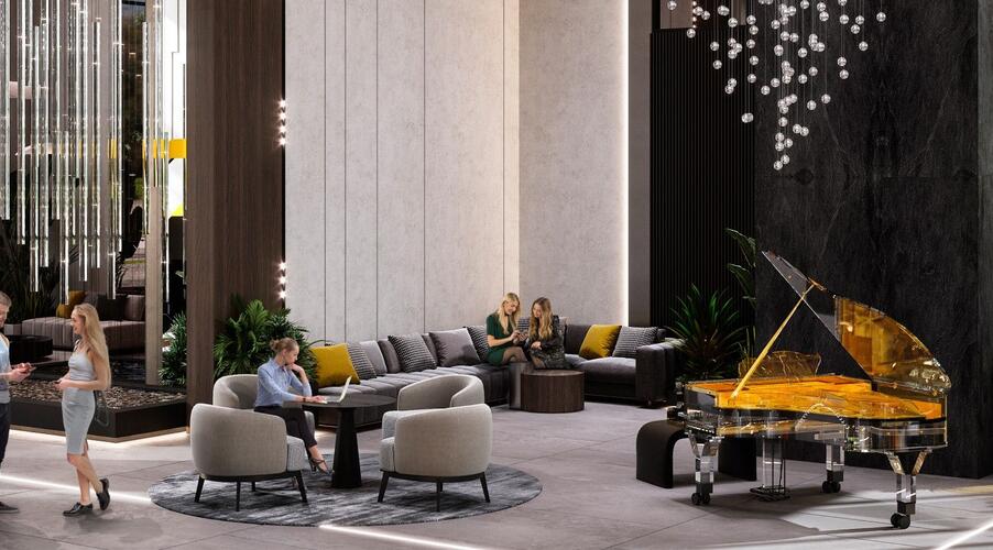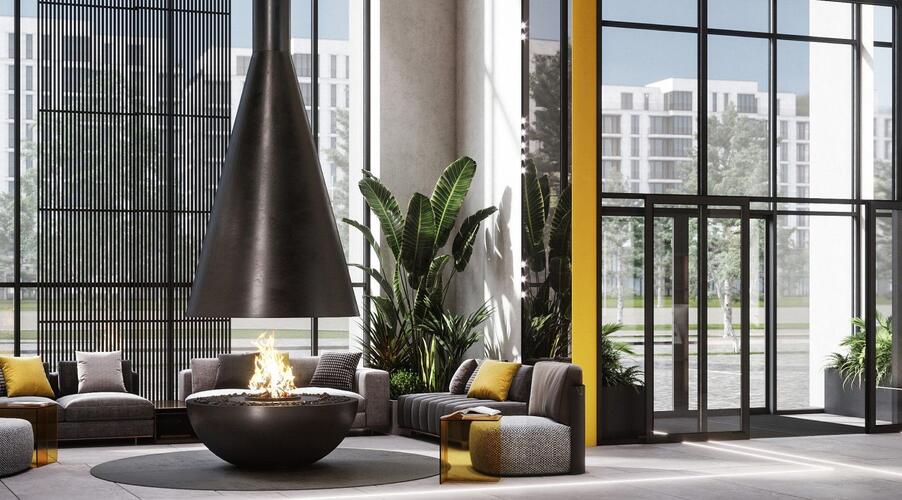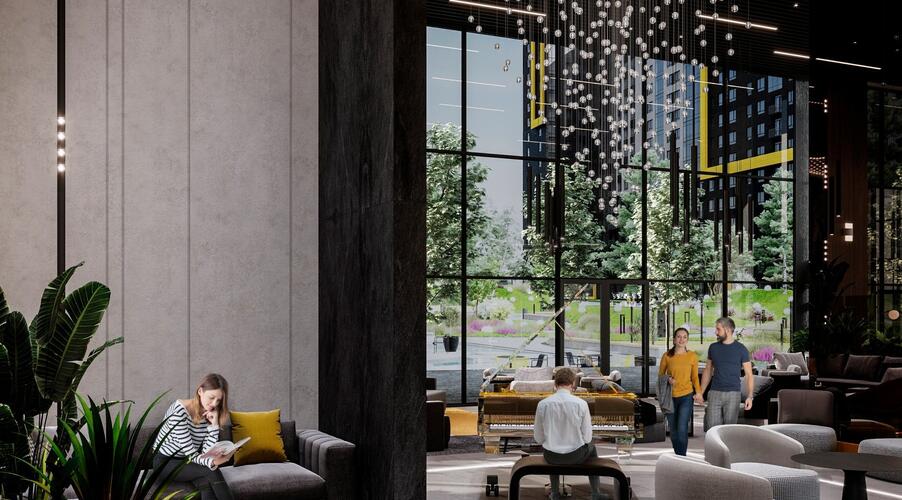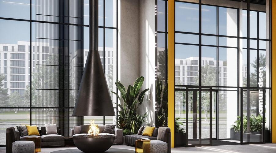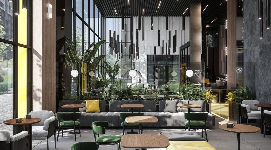 - Инфраструктура уровня бизнес-класса. Входная группа главного корпуса оформлена как лобби пятизвездочного отеля: потолки высотой 7 метров, панорамное остекление, зоны отдыха с камином и ресепшен с консьерж-службой. Для резидентов также доступны: