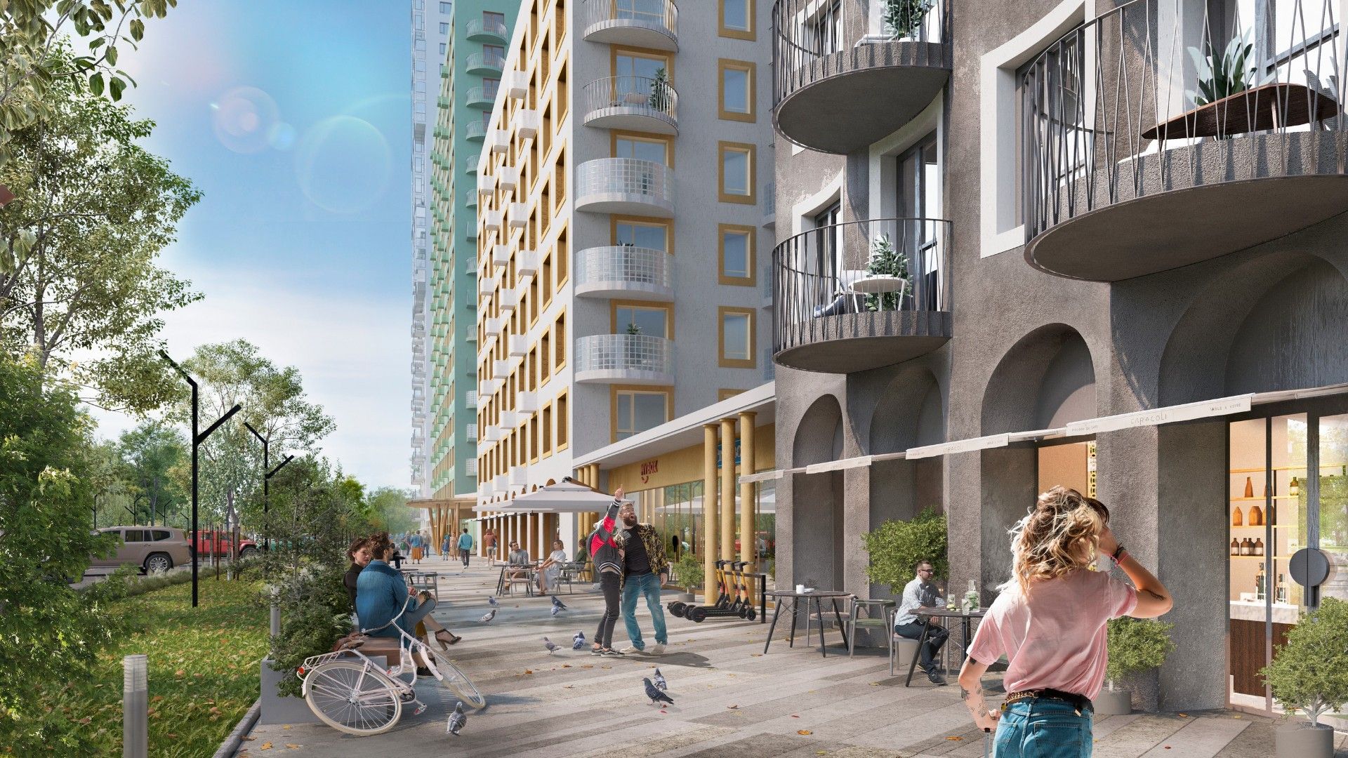 Дизайн-концепция проекта включает интригующие элементы: фасадные арки, рельеф, отражающие элементы, стеклоблоки и диагональные ограждения на летних помещениях. Контрастность кварталу придает золотистый дом в середине двора, который можно полностью разглядеть только зайдя во двор.