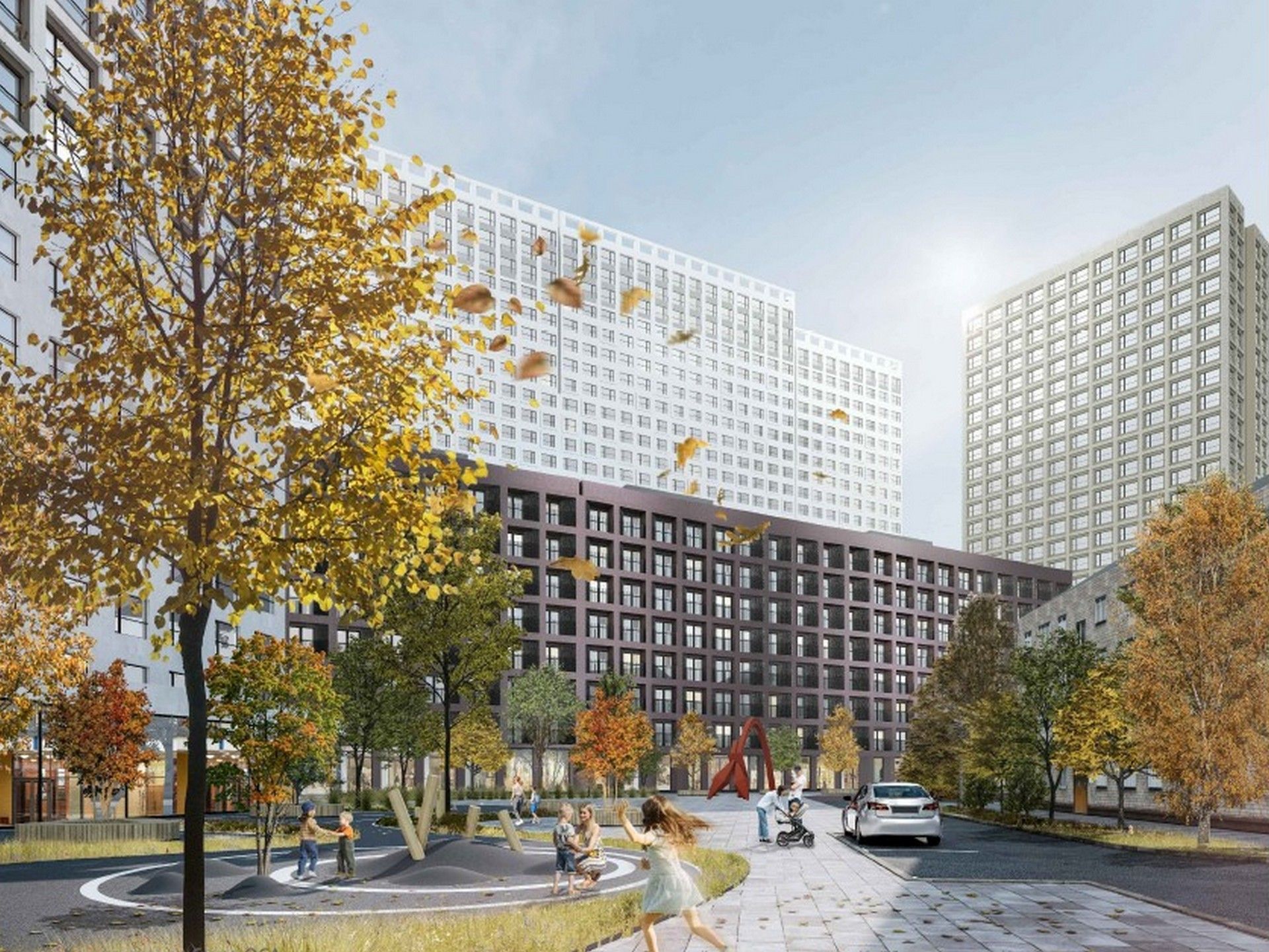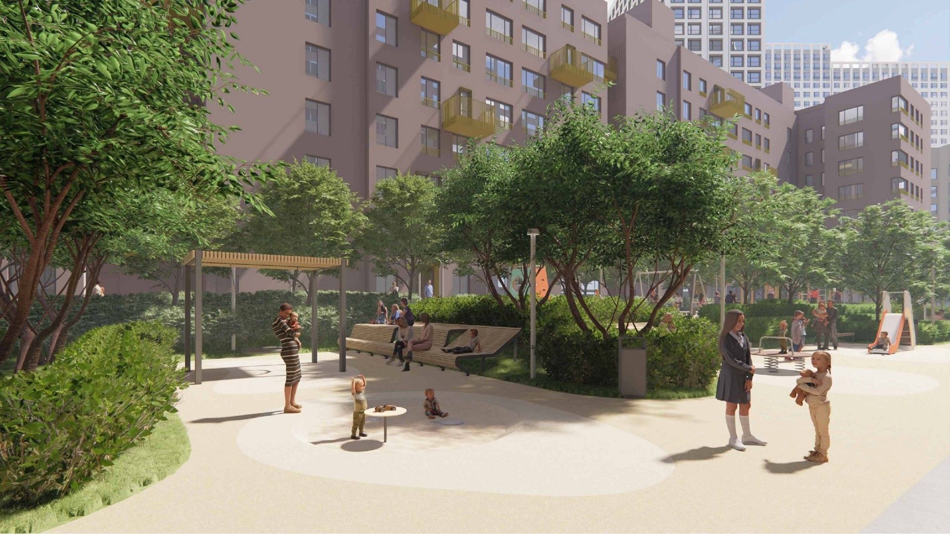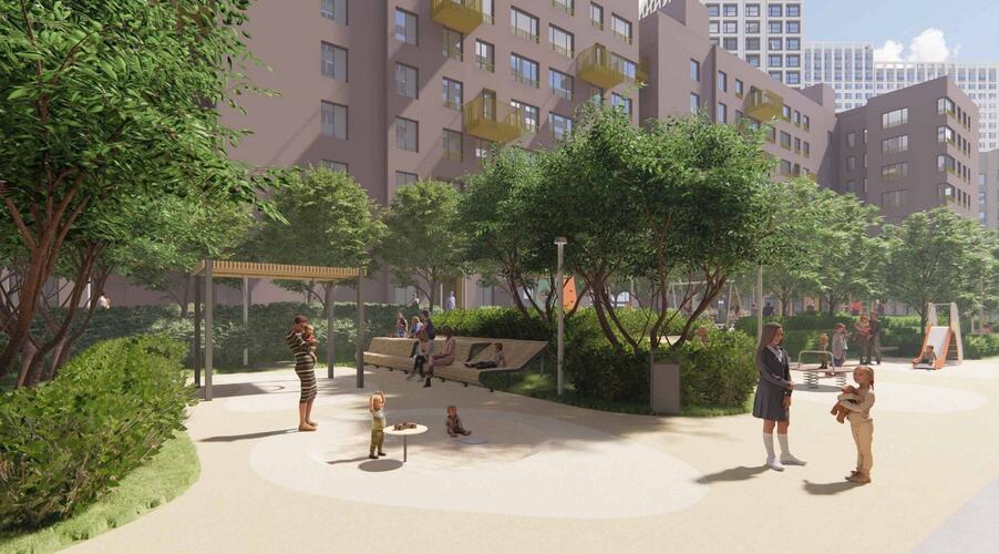 - Благоустройство территории: Прилегающая территория носит характер закрытого дворовой среды. Проект включает зоны для отдыха, детские и спортивные площадки современного формата, а также ландшафтный парк для прогулок. Видеонаблюдение и служба консьержей обеспечивают безопасность и приватность для жителей.