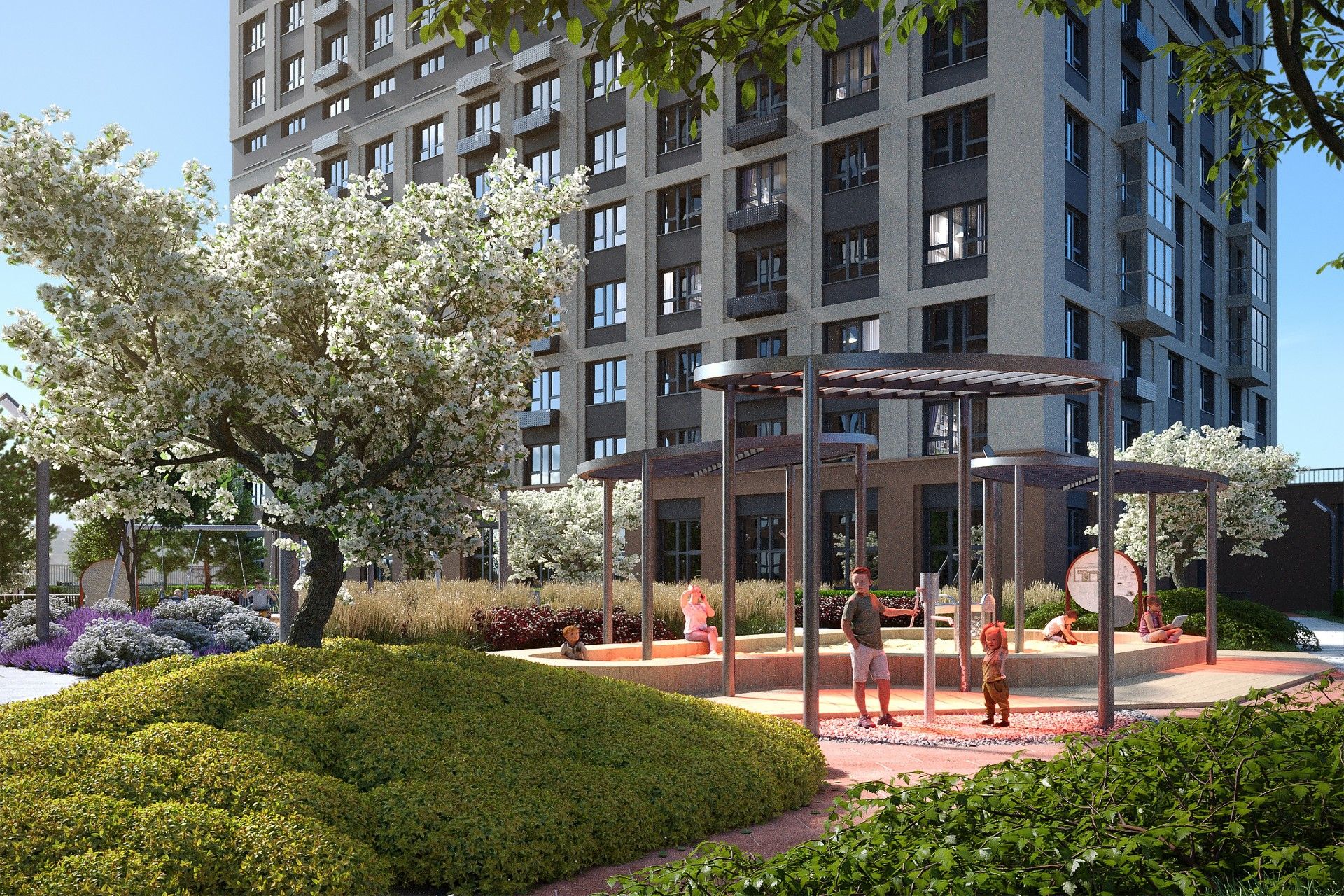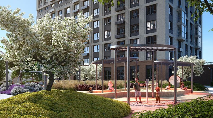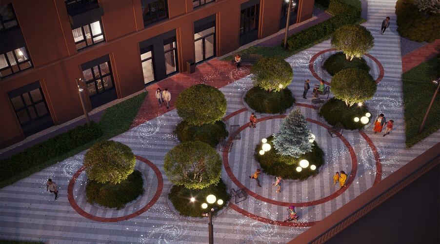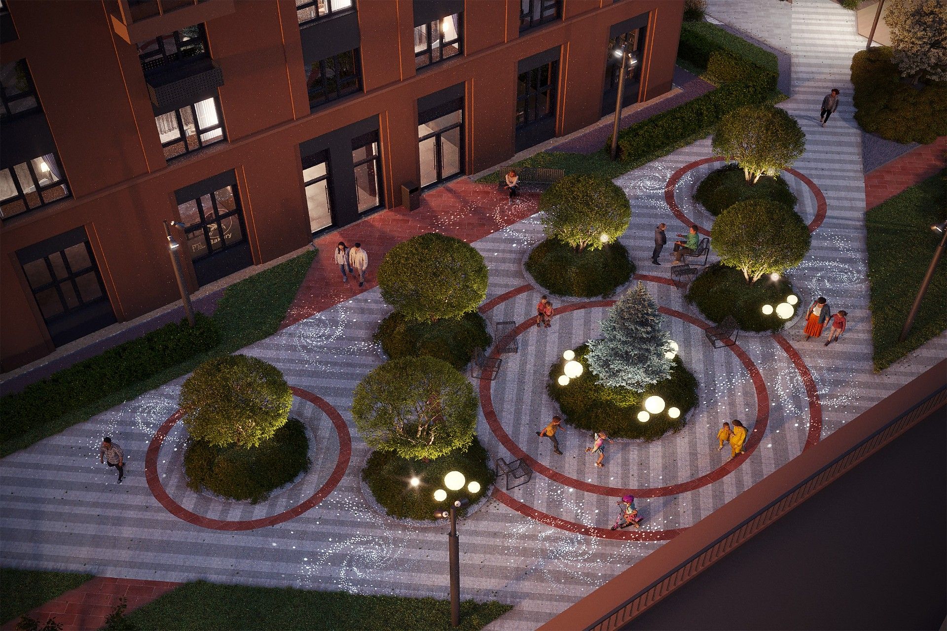 Концепция благоустройства построена на принципах спокойствия, эстетики и функциональности. Реализована концепция «двор без машин», что гарантирует безопасность для семей с детьми.