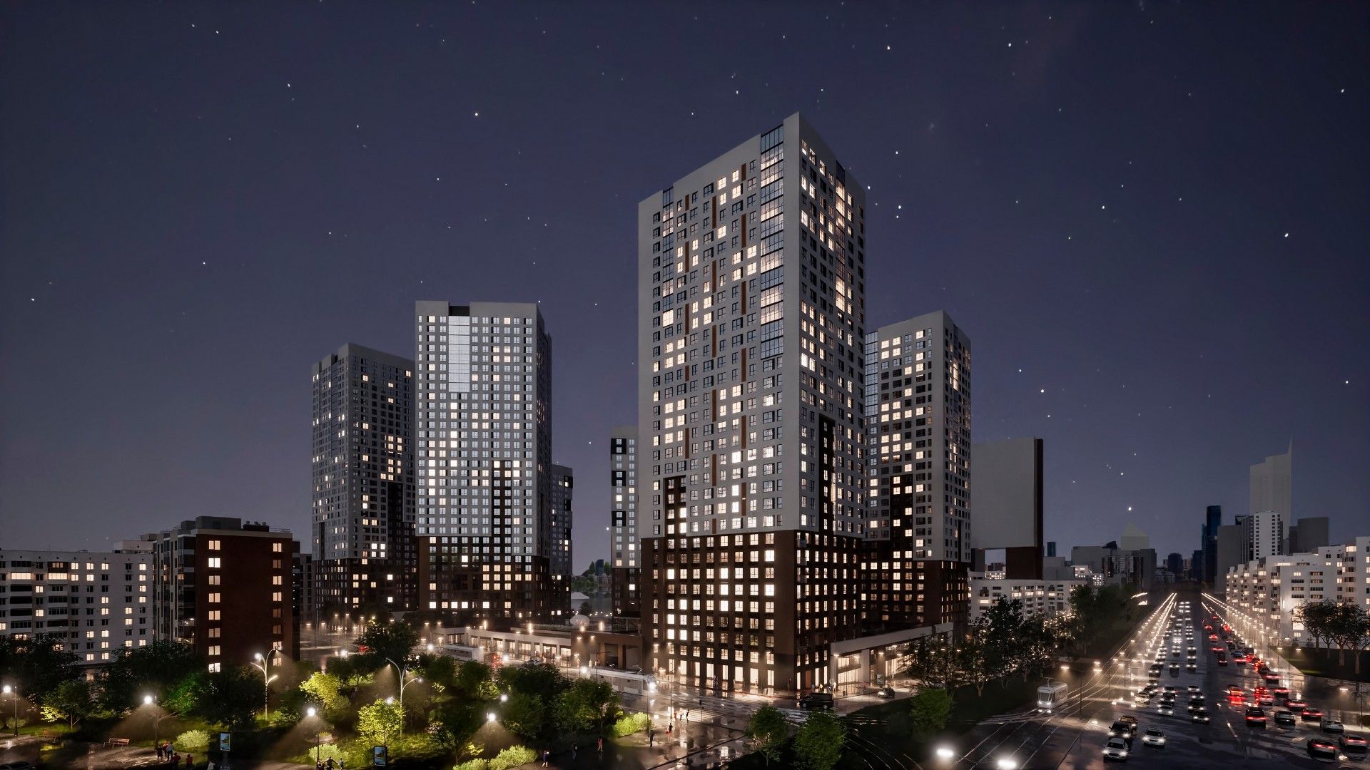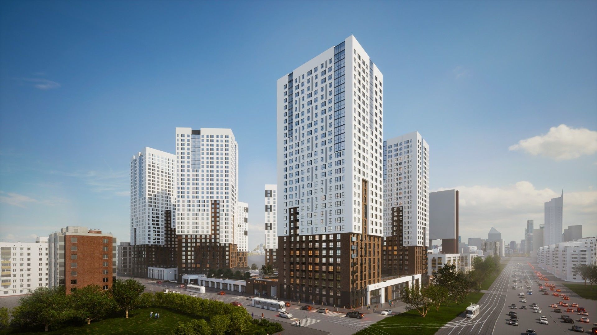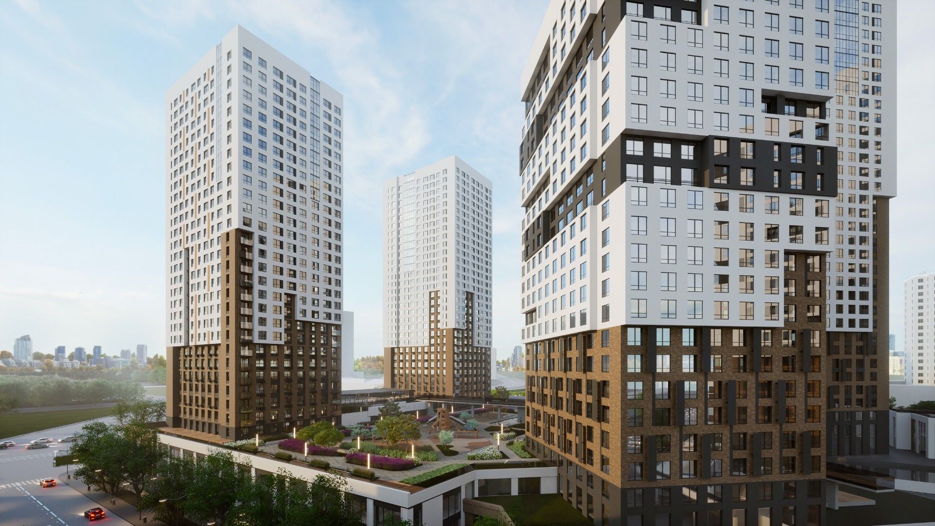 - Состав: шесть монолитных высоток этажностью 25-32 этажа