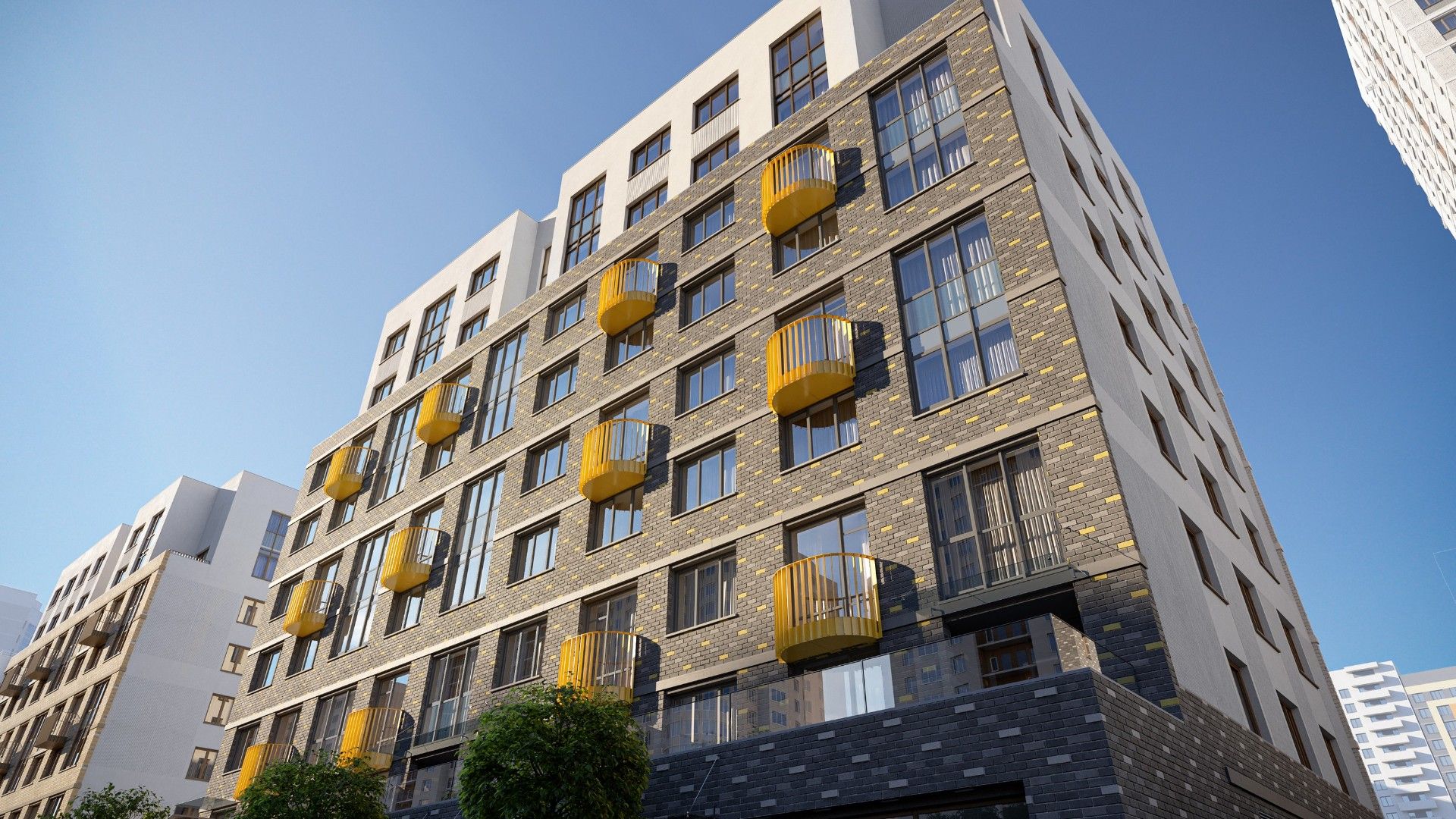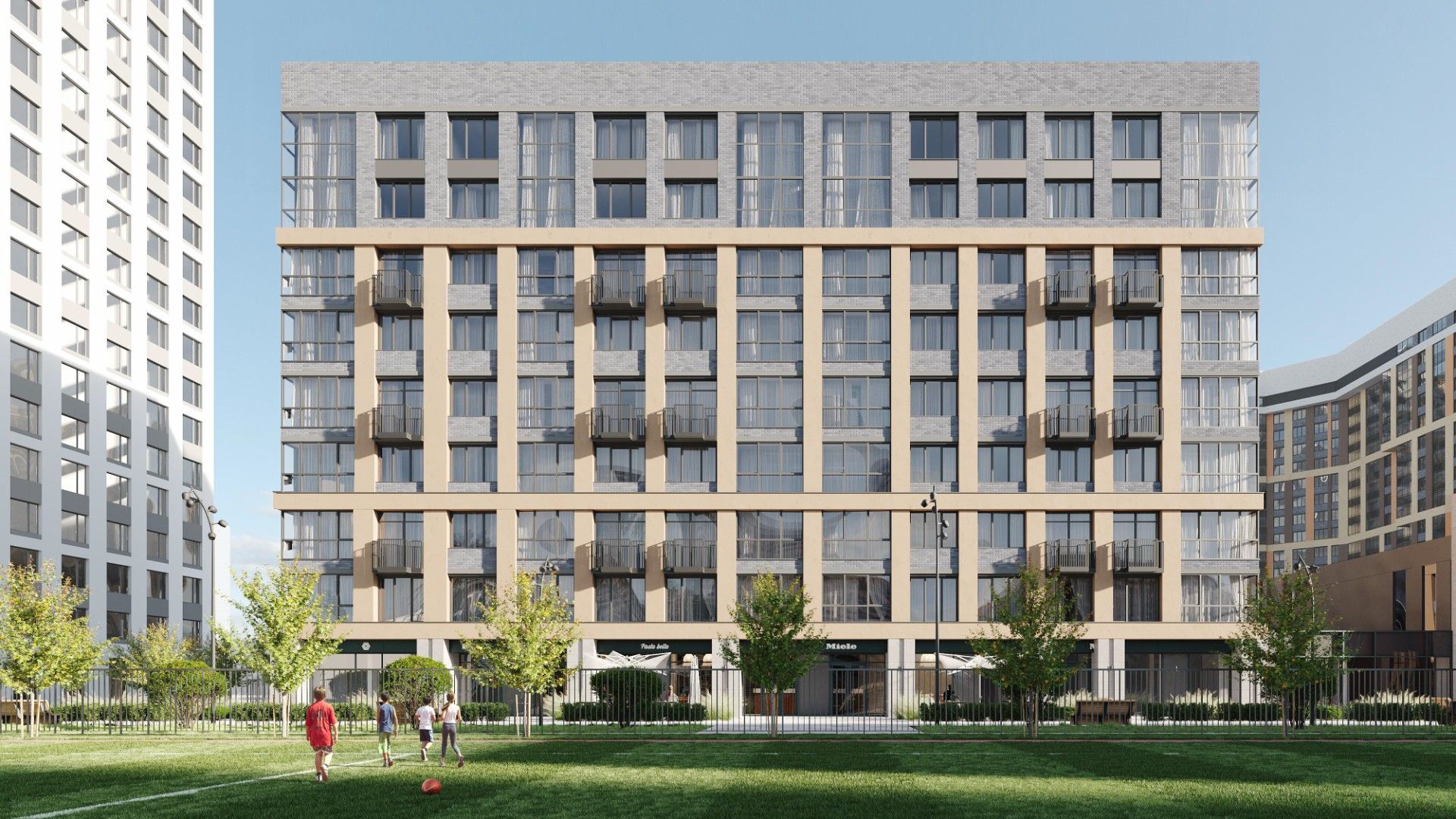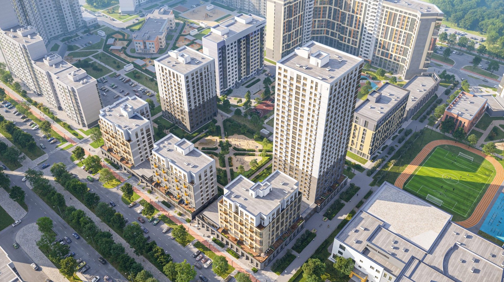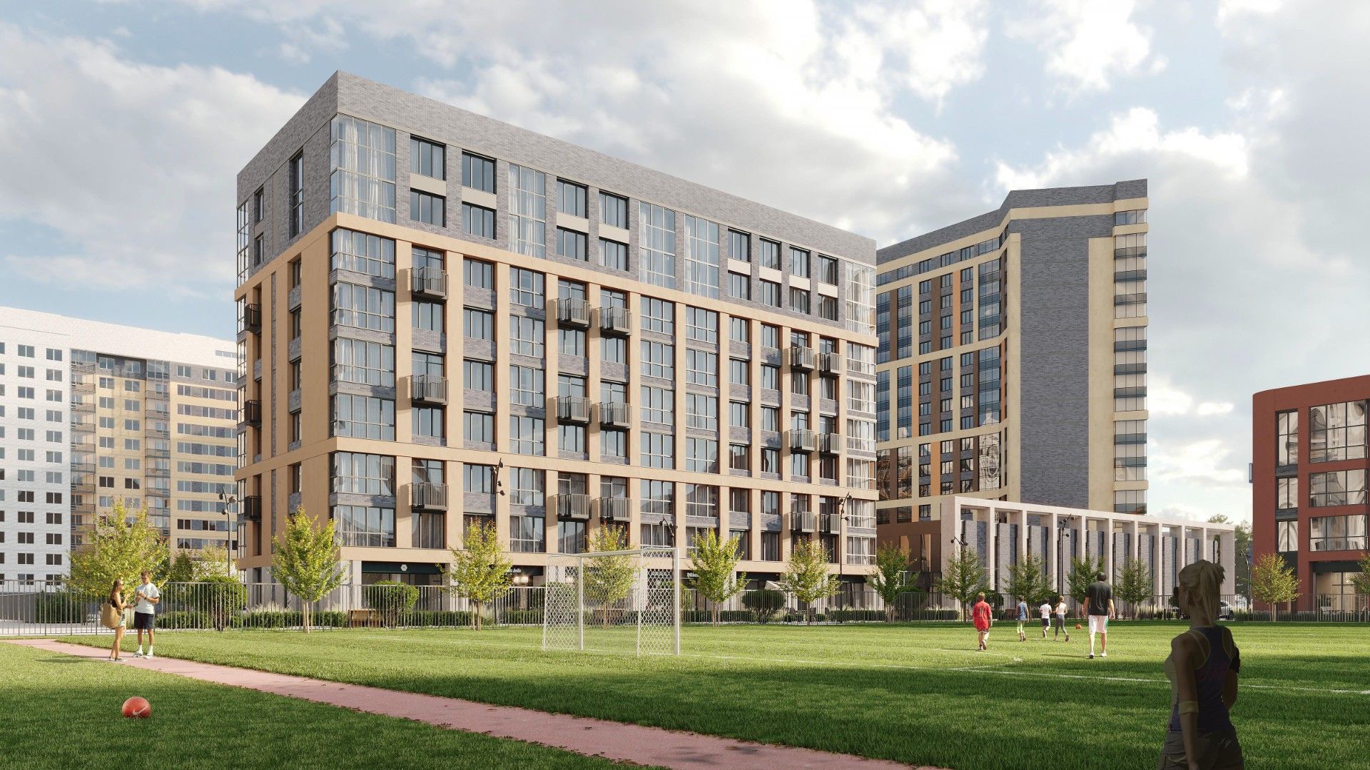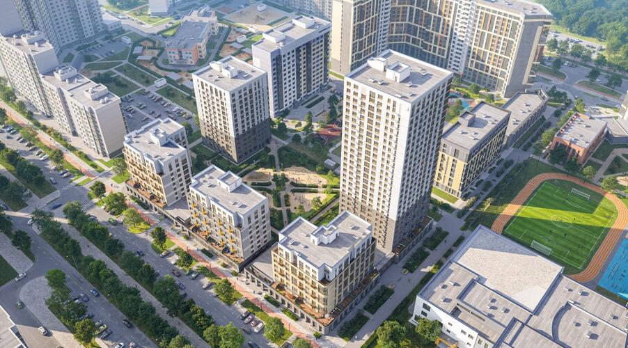 - Продуманное зонирование: На территории запроектированы детские игровые площадки для разных возрастных групп, спортивные зоны и зоны отдыха с зелеными насаждениями.