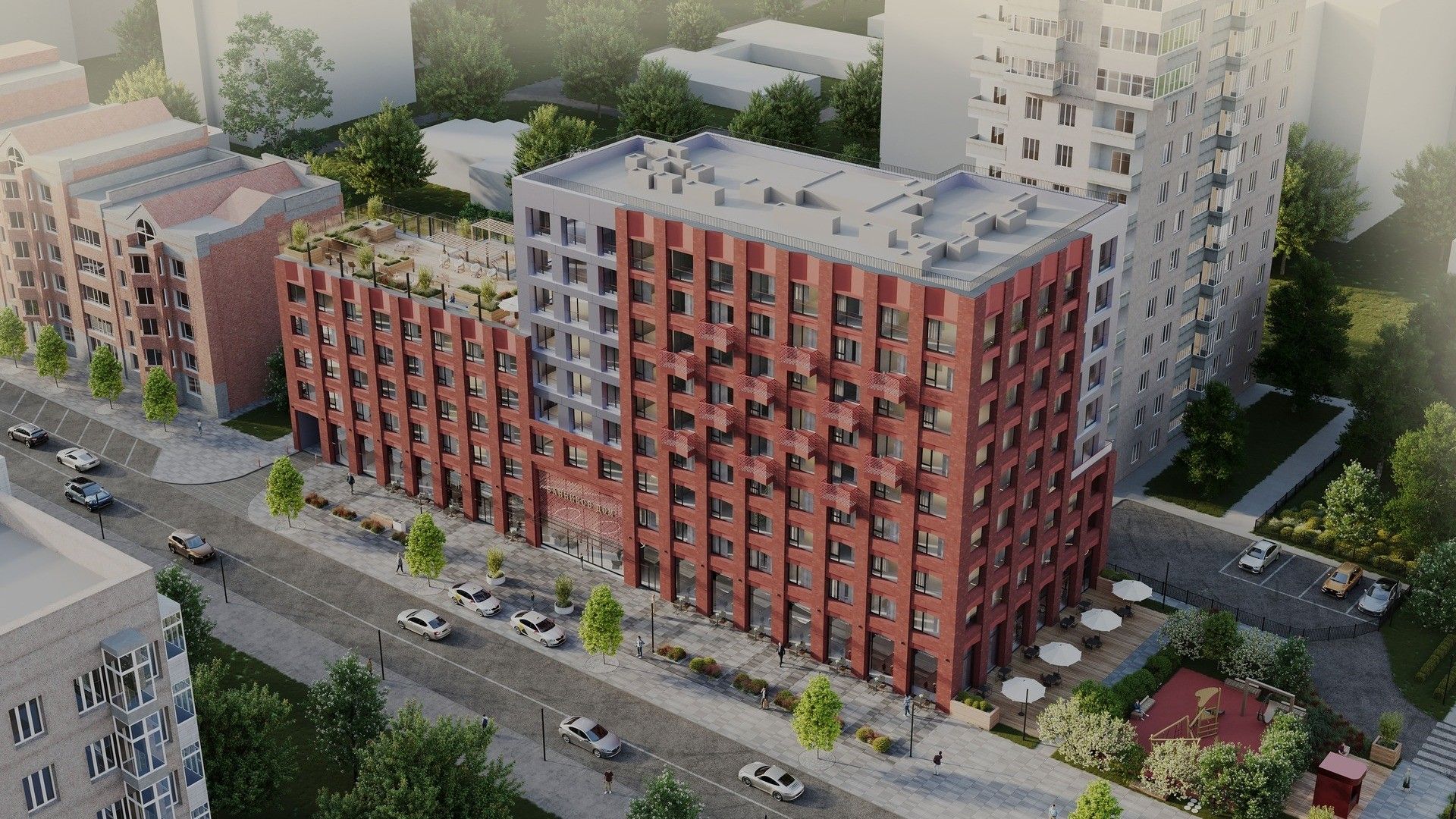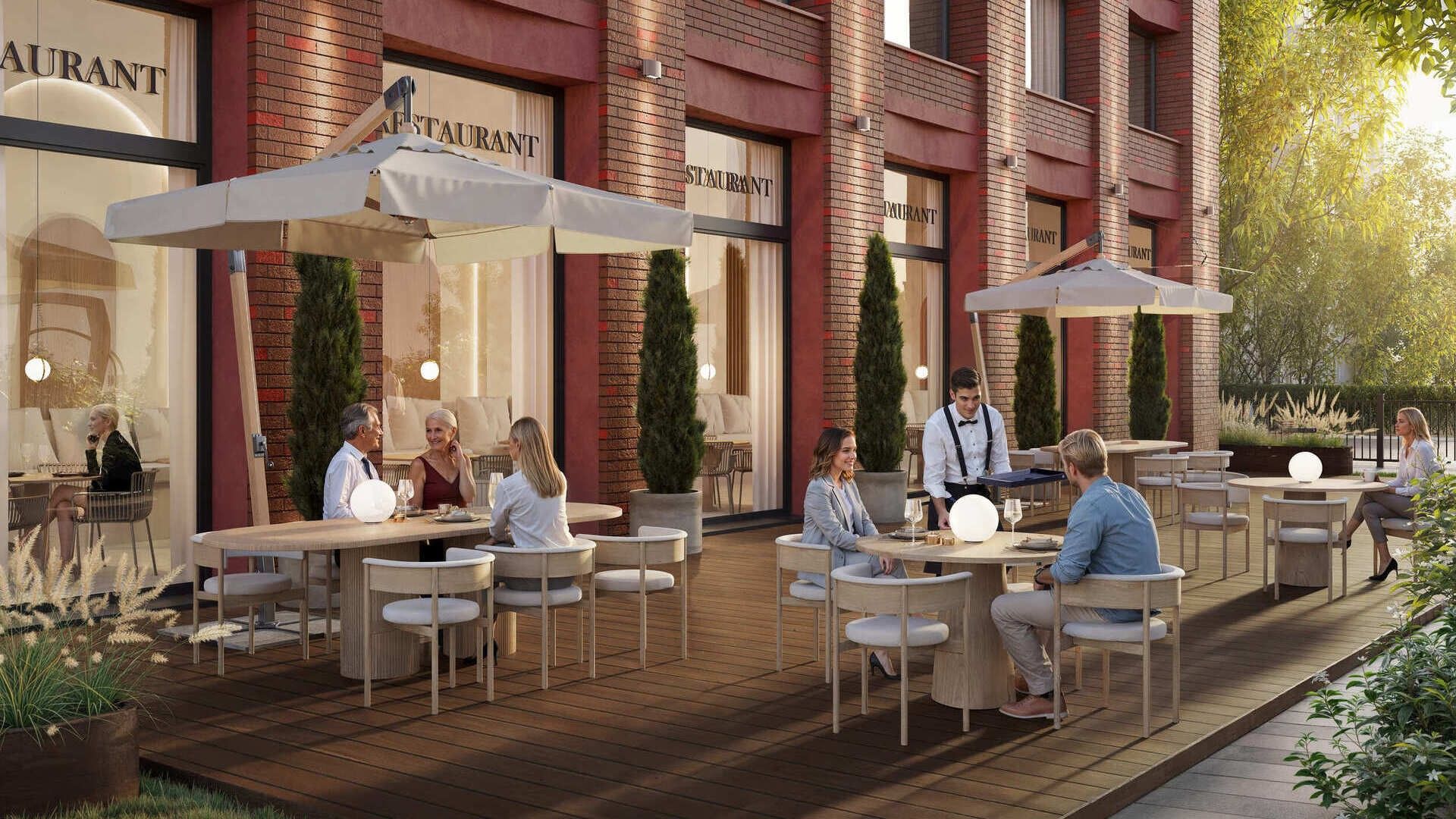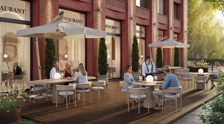 - Собственный ресторан авторской кухни: На первом этаже здания будет расположен ресторан с террасой, что добавляет комфорта для жильцов и придает проекту статусности.