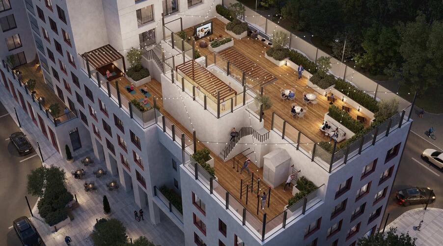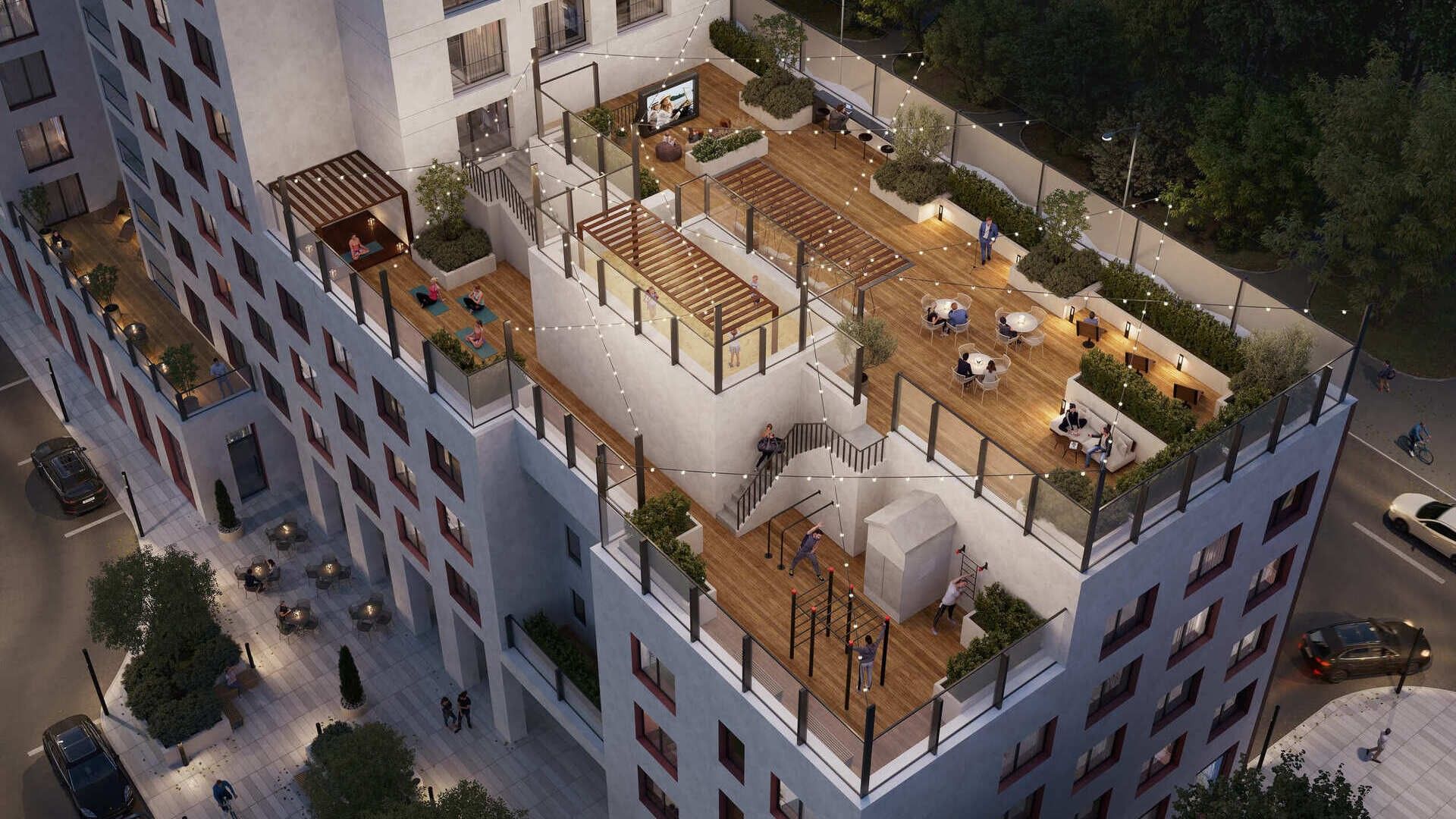 - Лаунж-терраса на крыше: Закрытая территория на крыше дома с зонами для отдыха и общения является уникальным предложением для Екатеринбурга.