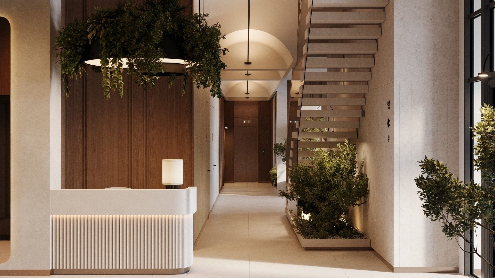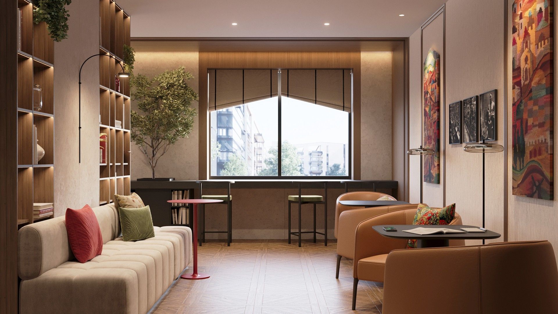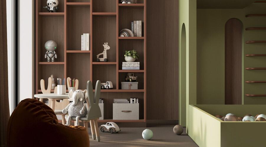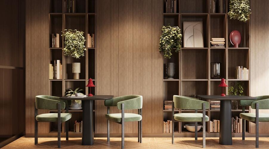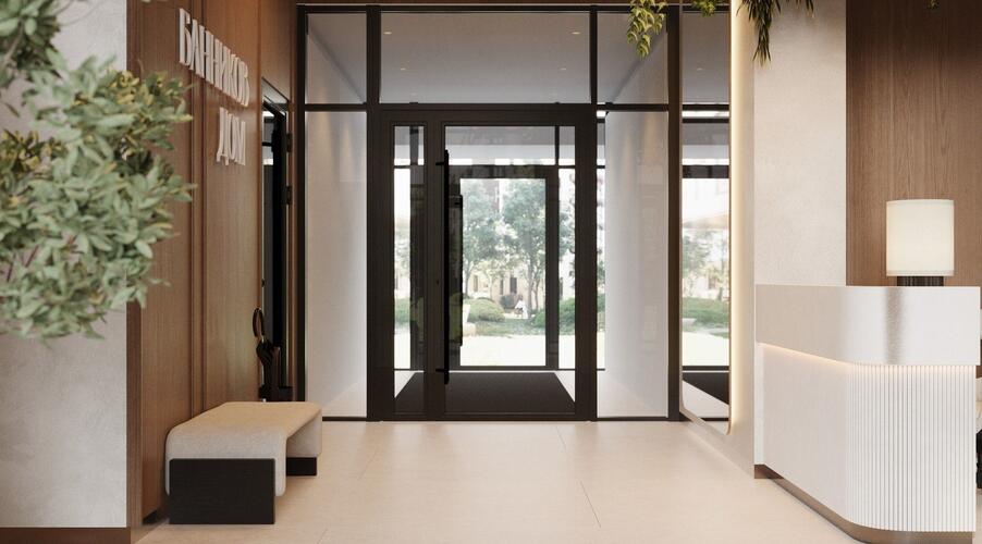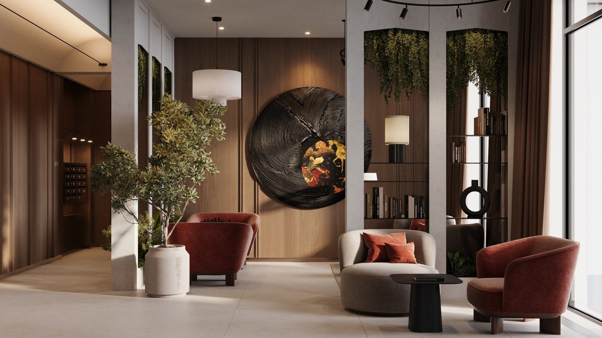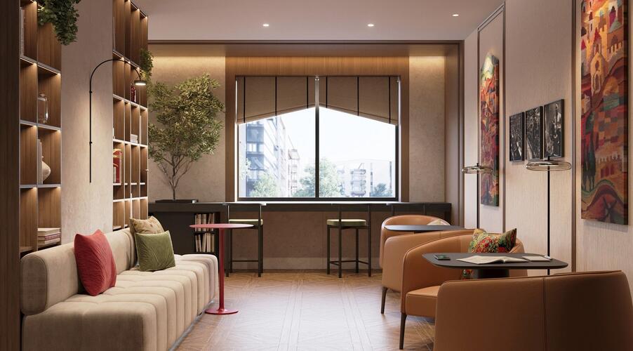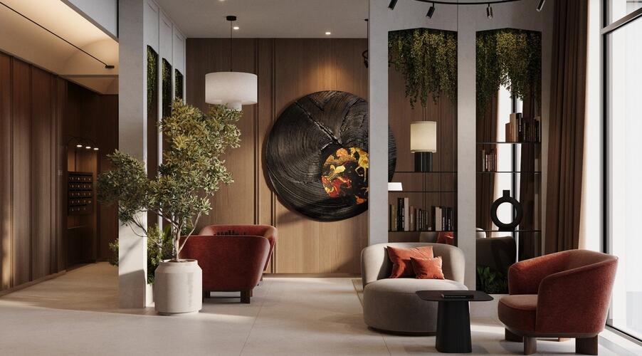 - Лобби в стиле бутик-отеля: Дизайн общественной зоны первого этажа, с продуманными арома- и музыкальным сопровождением, создает ощущение роскоши и уюта. Пространство разделено на зоны: гостевую, коворкинга и детской игровой.