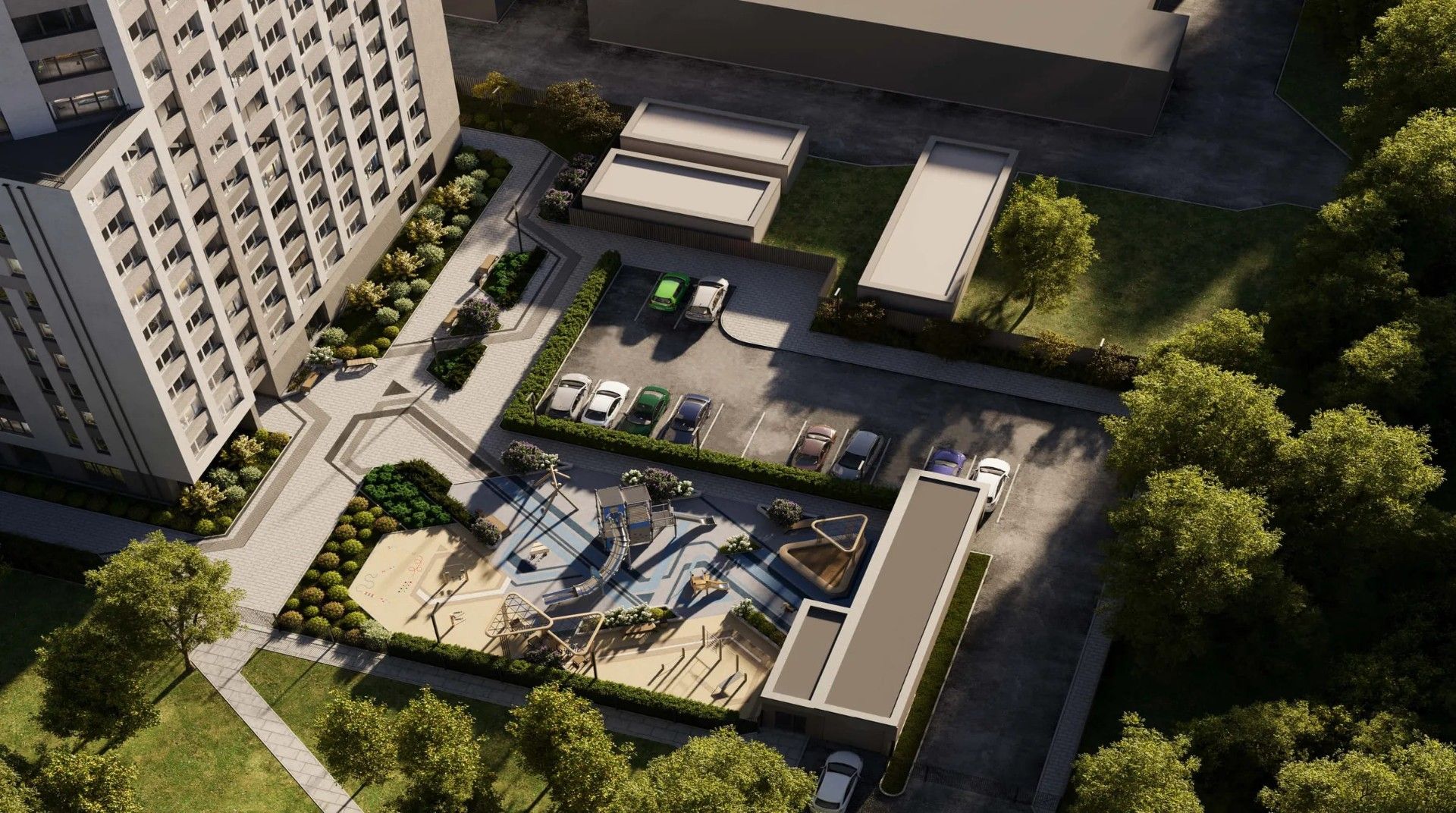 - Подземный паркинг: Одноуровневый паркинг защищает автомобили от непогоды. Прямой лифт из паркинга ведет в жилые этажи, что особенно удобно с колясками или тяжелыми сумками.