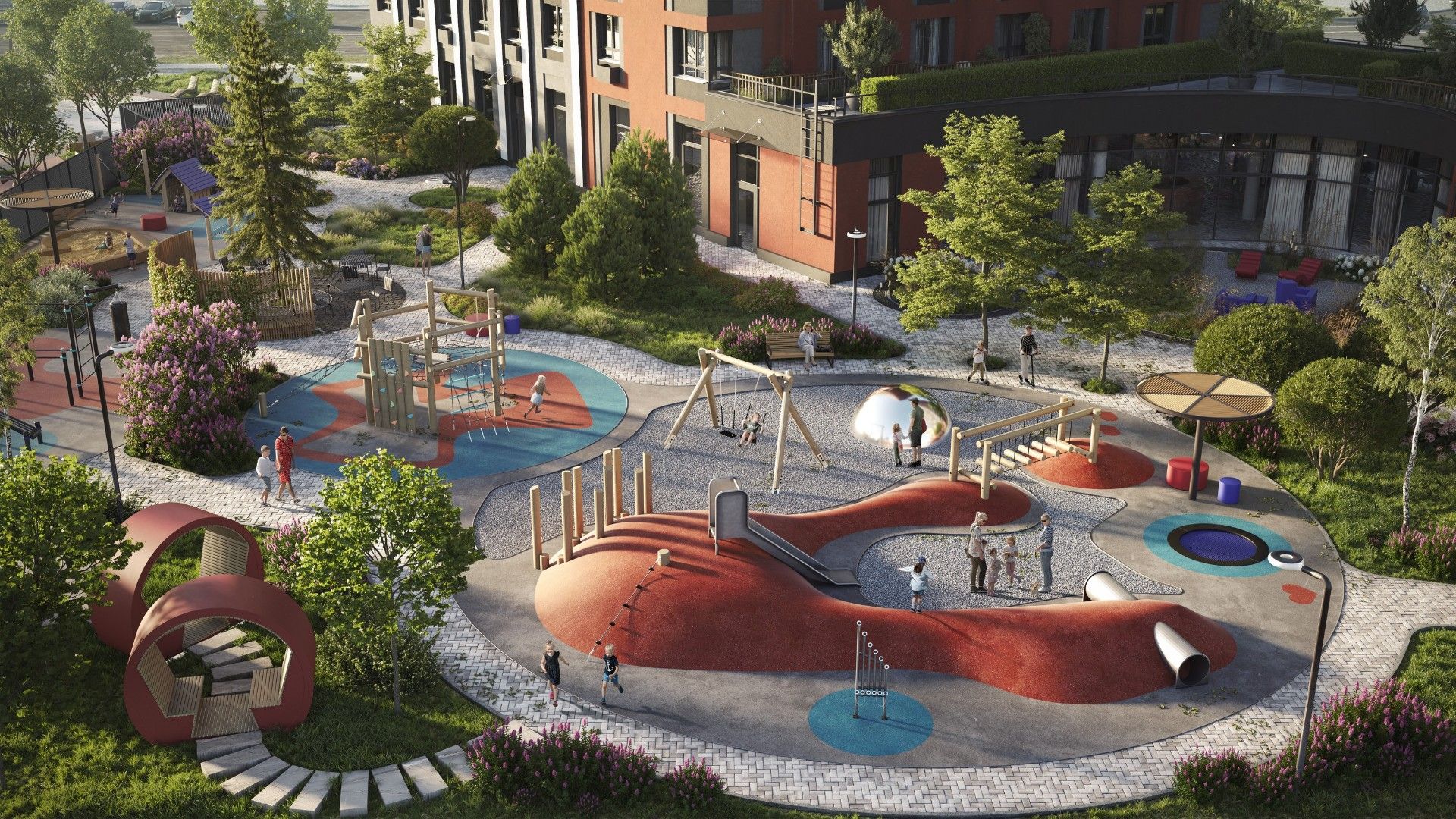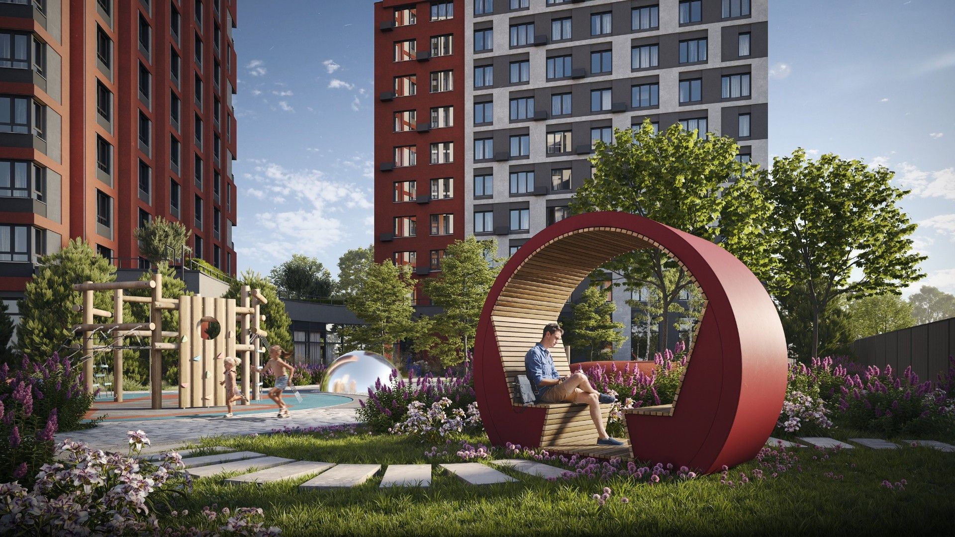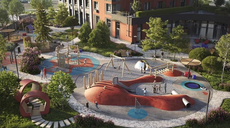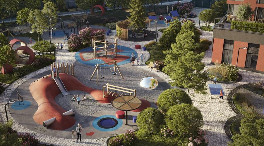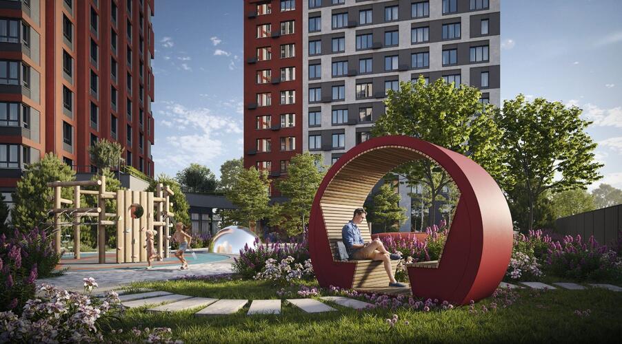 - Продуманный двор: Закрытая от магистралей территория поделена на зоны для отдыха, спорта и игр для детей разных возрастов.