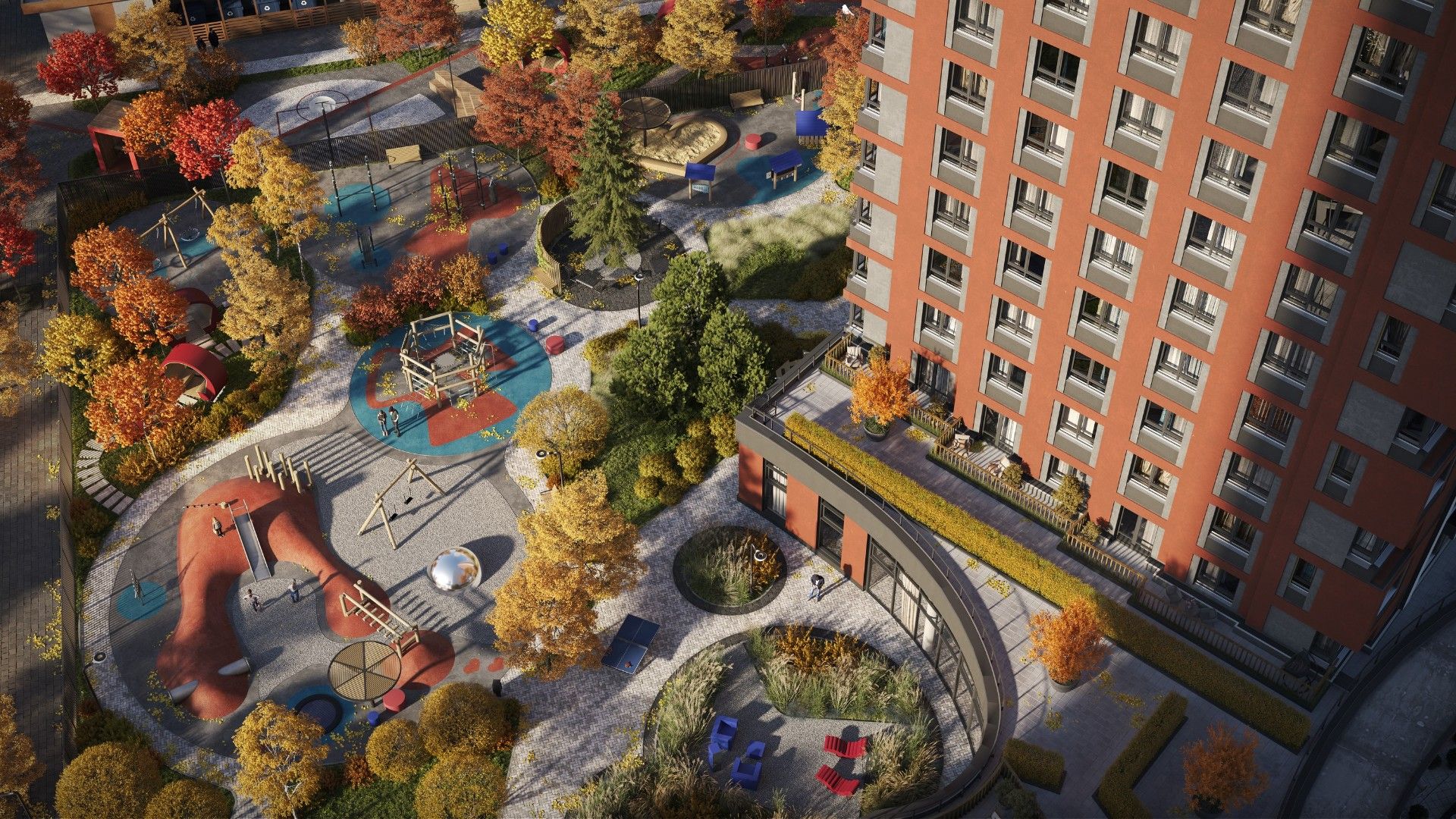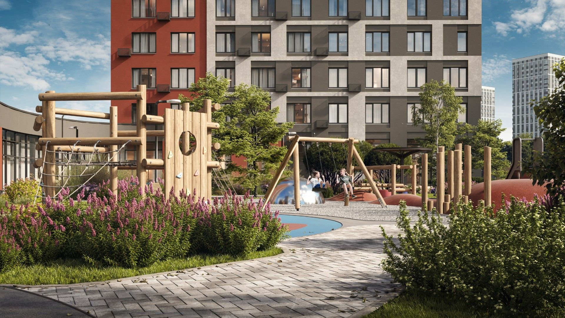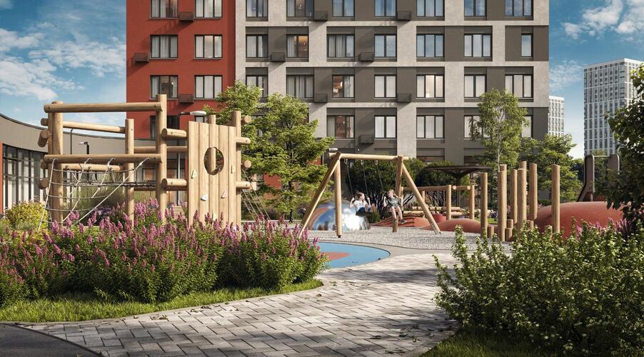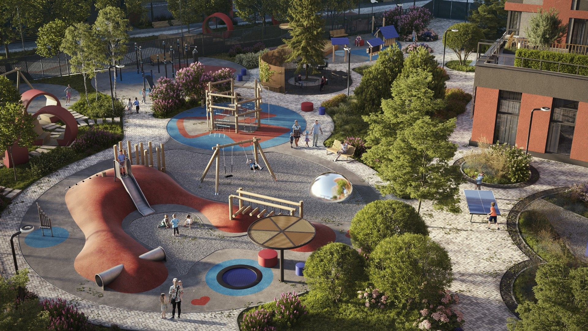 - Продуманный двор: Закрытая от магистралей территория поделена на зоны для отдыха, спорта и игр для детей разных возрастов.
