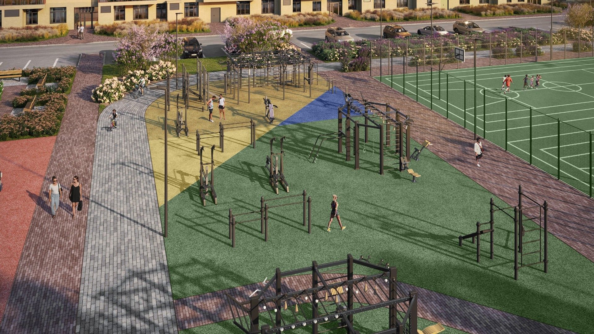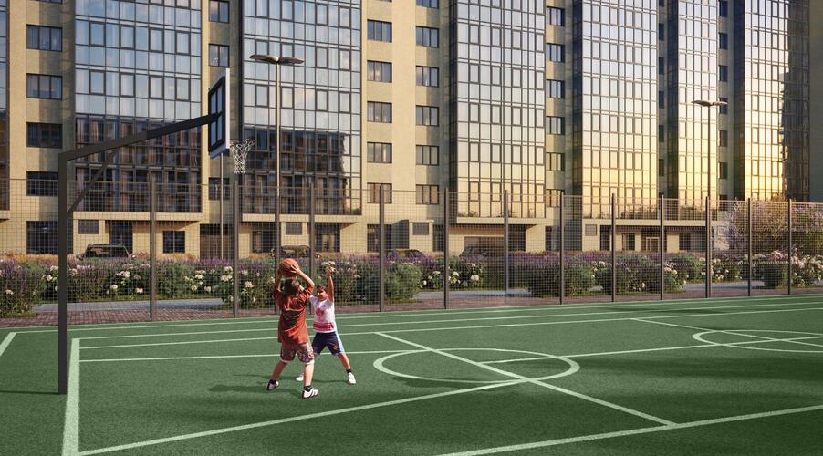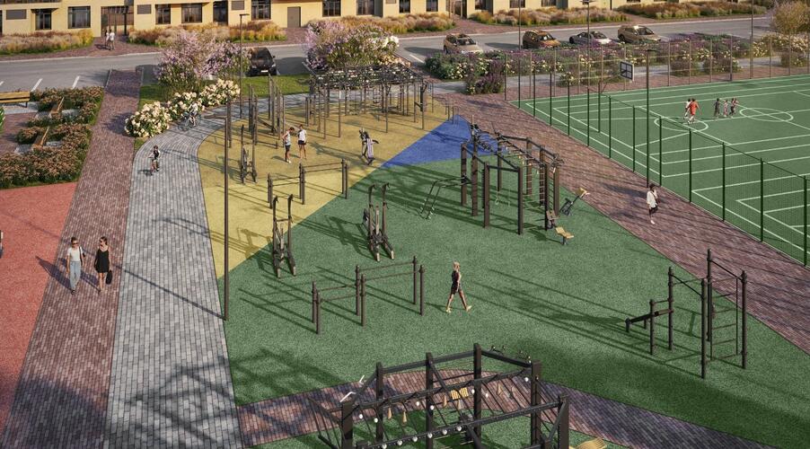- Спортивная инфраструктура: два оборудованных корта для командных игр (футбол, волейбол, баскетбол) и воркаут-пространство