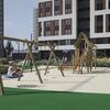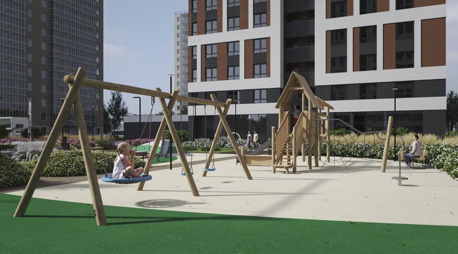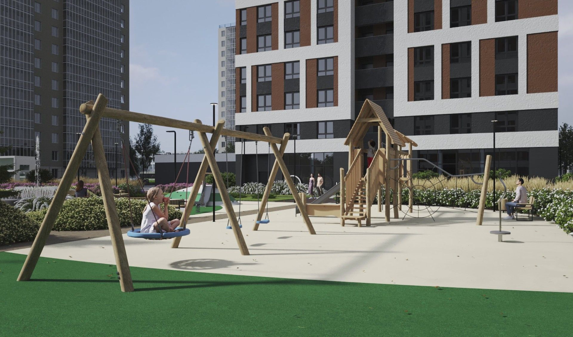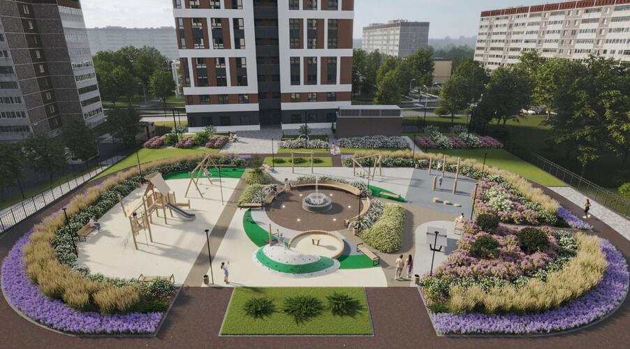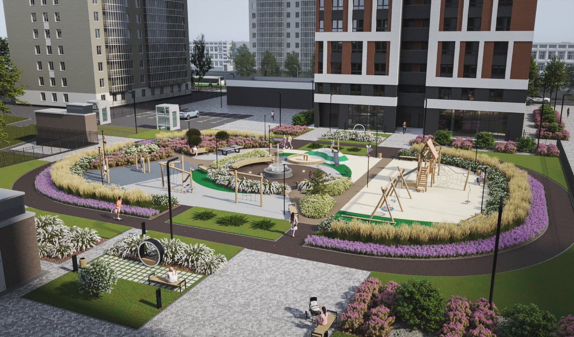Территория комплекса спроектирована по индивидуальному проекту: двор без машин, зоны отдыха, спортивная площадка, беговая дорожка и фонтан в центре. Игровые площадки для детей выполнены из натуральных материалов.
