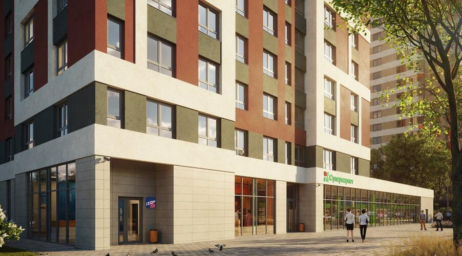 - Панорамные окна в коммерческих помещениях на первых этажах — создают привлекательную улично-деловую среду.