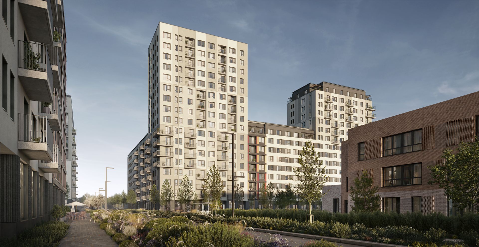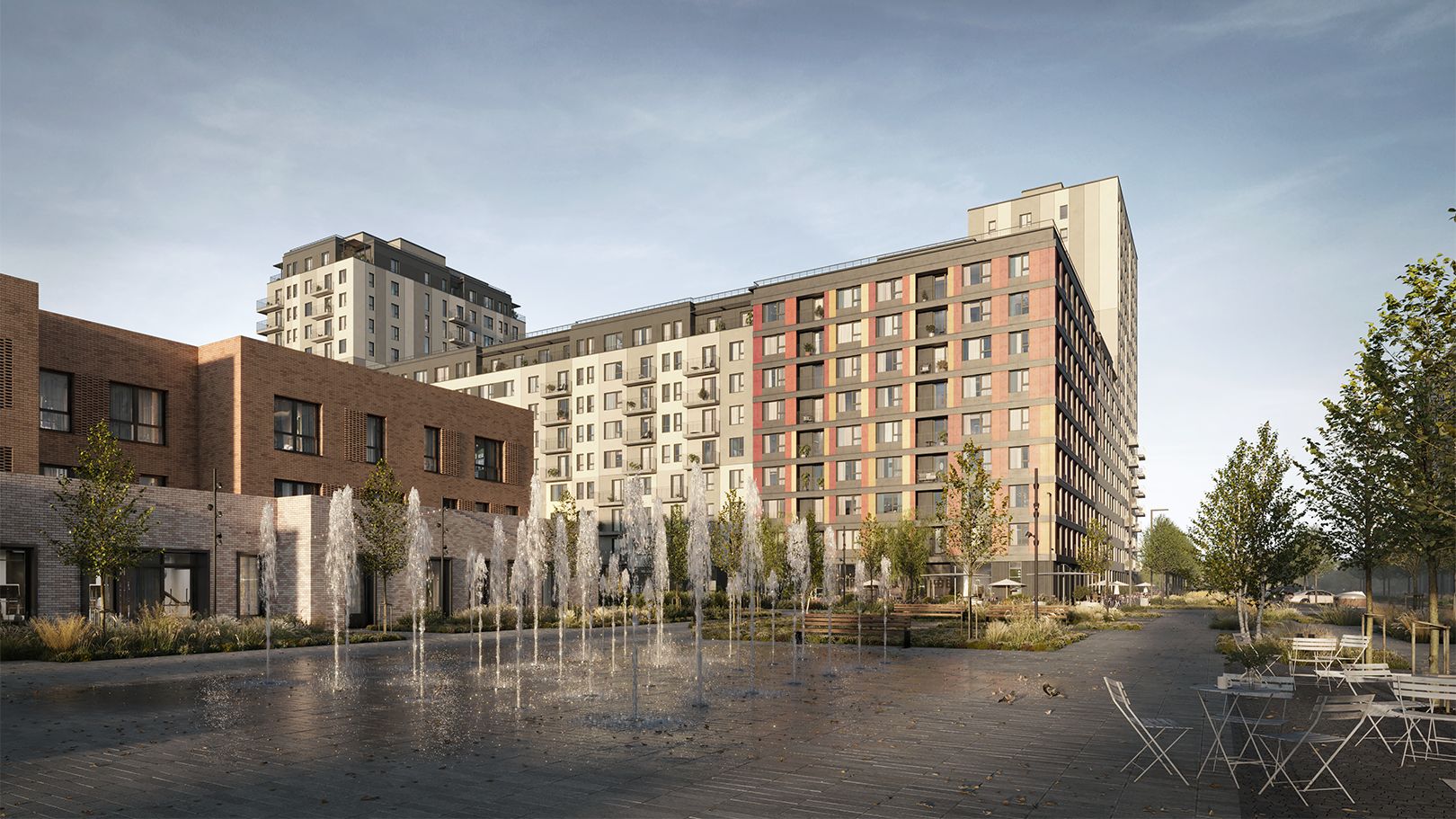 - Архитектура «супер-квартала»: Территория спланирована по примеру барселонского Эшампле: четкая сетка улиц делит площадь на уютные блоки. Центральным элементом стал пешеходный бульвар с площадью и фонтаном, вокруг которого формируется вся жизнь.