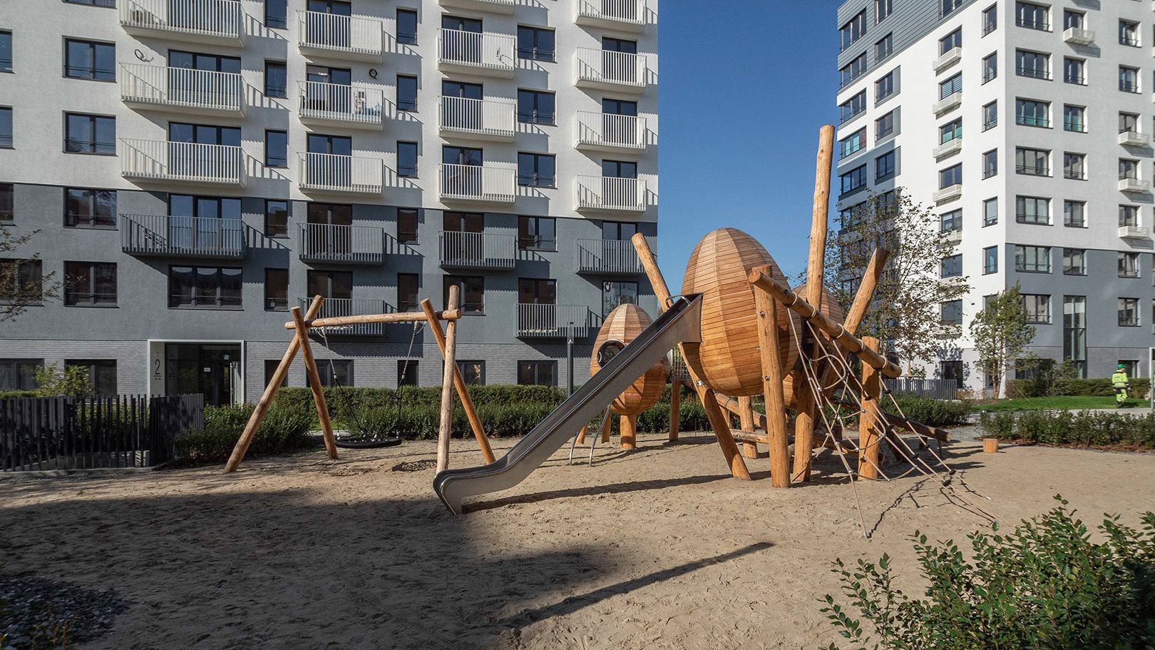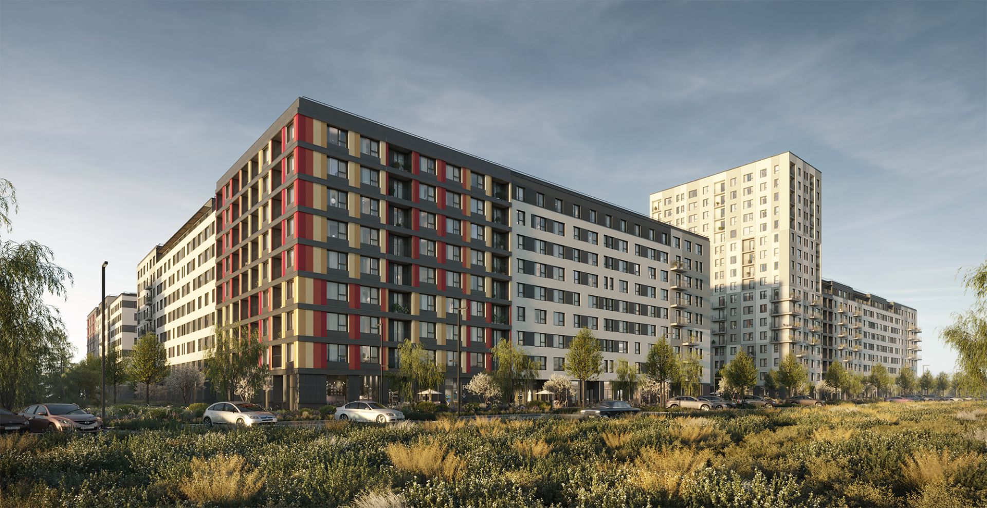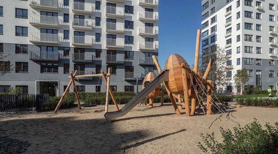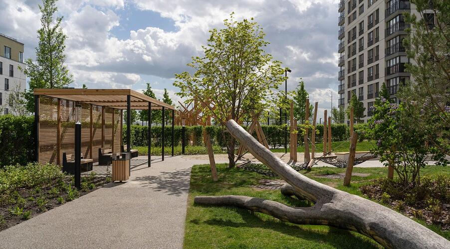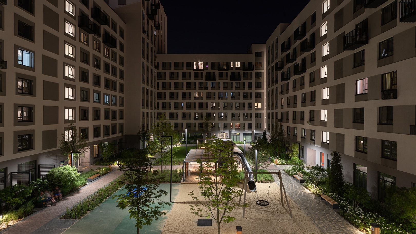 - Закрытые дворы без машин: Автотранспорт перемещается по периметру квартала, обеспечивая безопасность для детей и тишину во внутреннем пространстве.