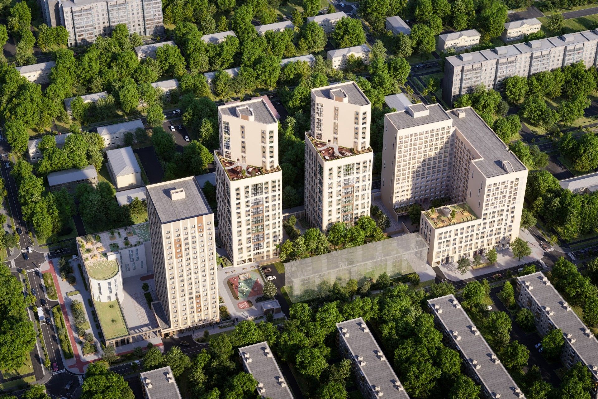 - Повседневные нужды: На первых этажах жилых корпусов запланированы магазины, кафе, аптеки и другие сервисы.