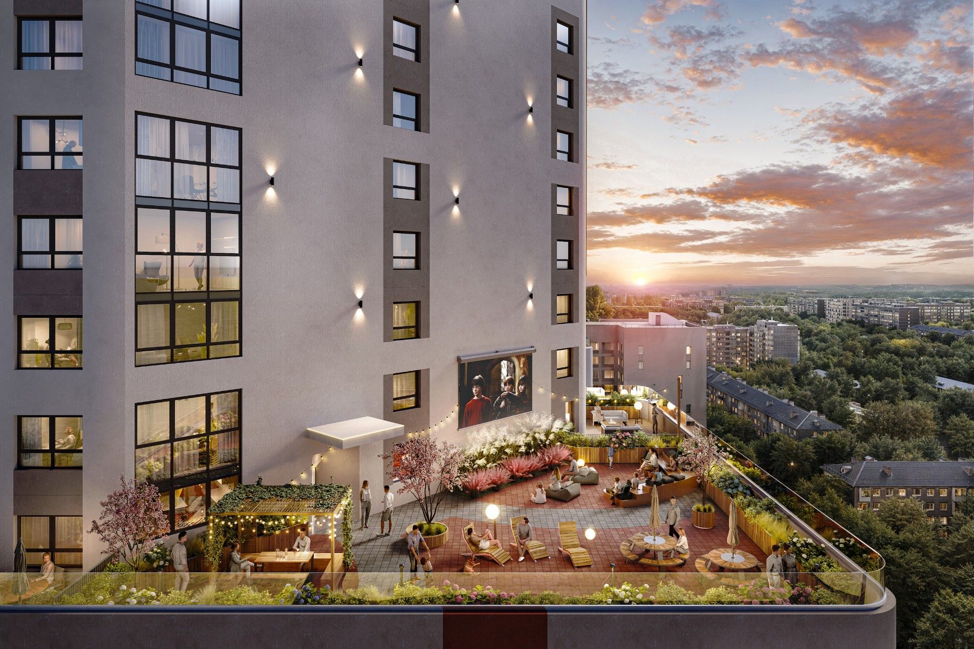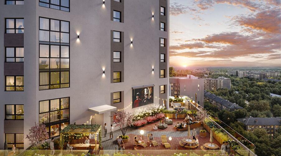 - Уникальная feature — лаунж-террасы: На 19-х этажах домов второй очереди обустроены общественные террасы с панорамным видом на город, предназначенные для отдыха и общения жителей.
