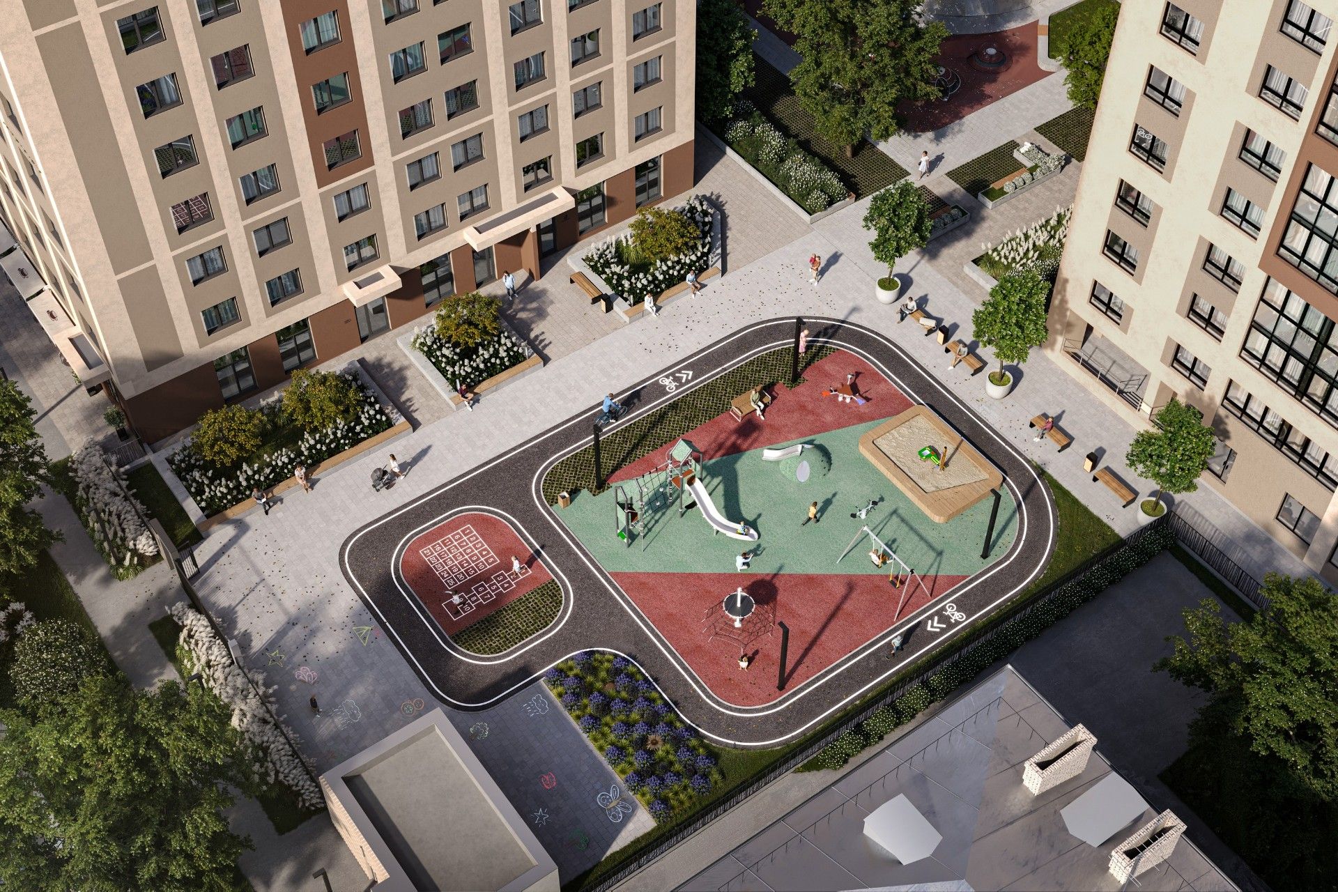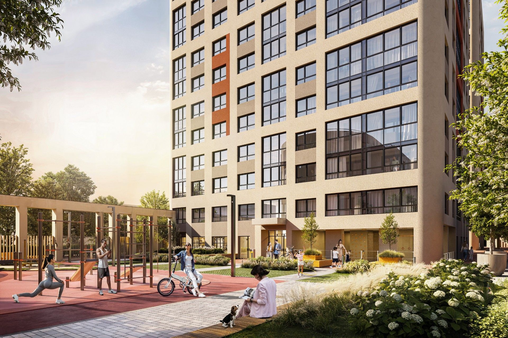 - Зоны отдыха: Воркаут-площадки, лаунж-зоны, велодорожки.