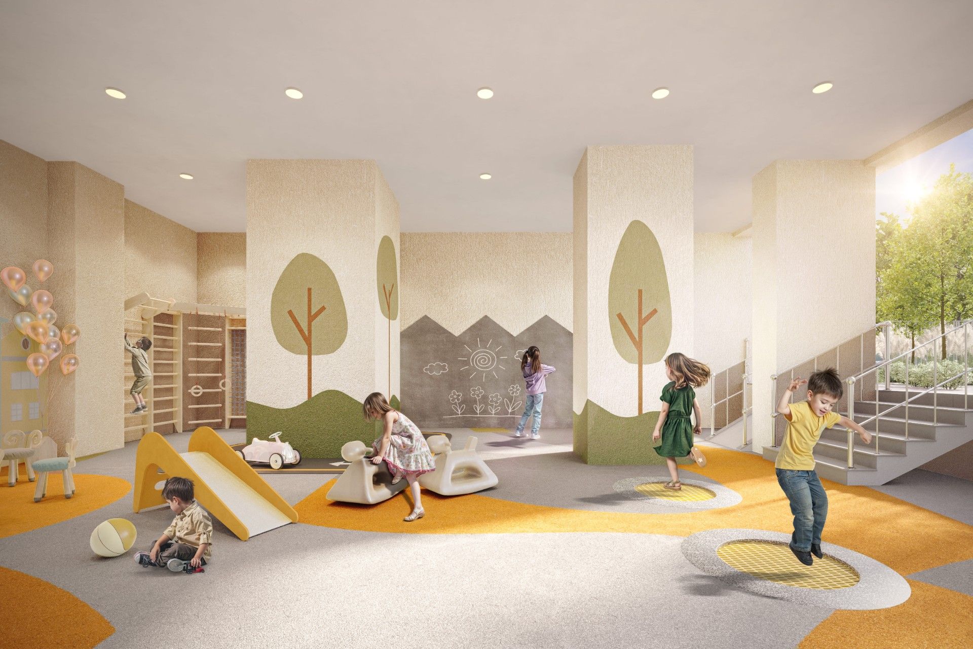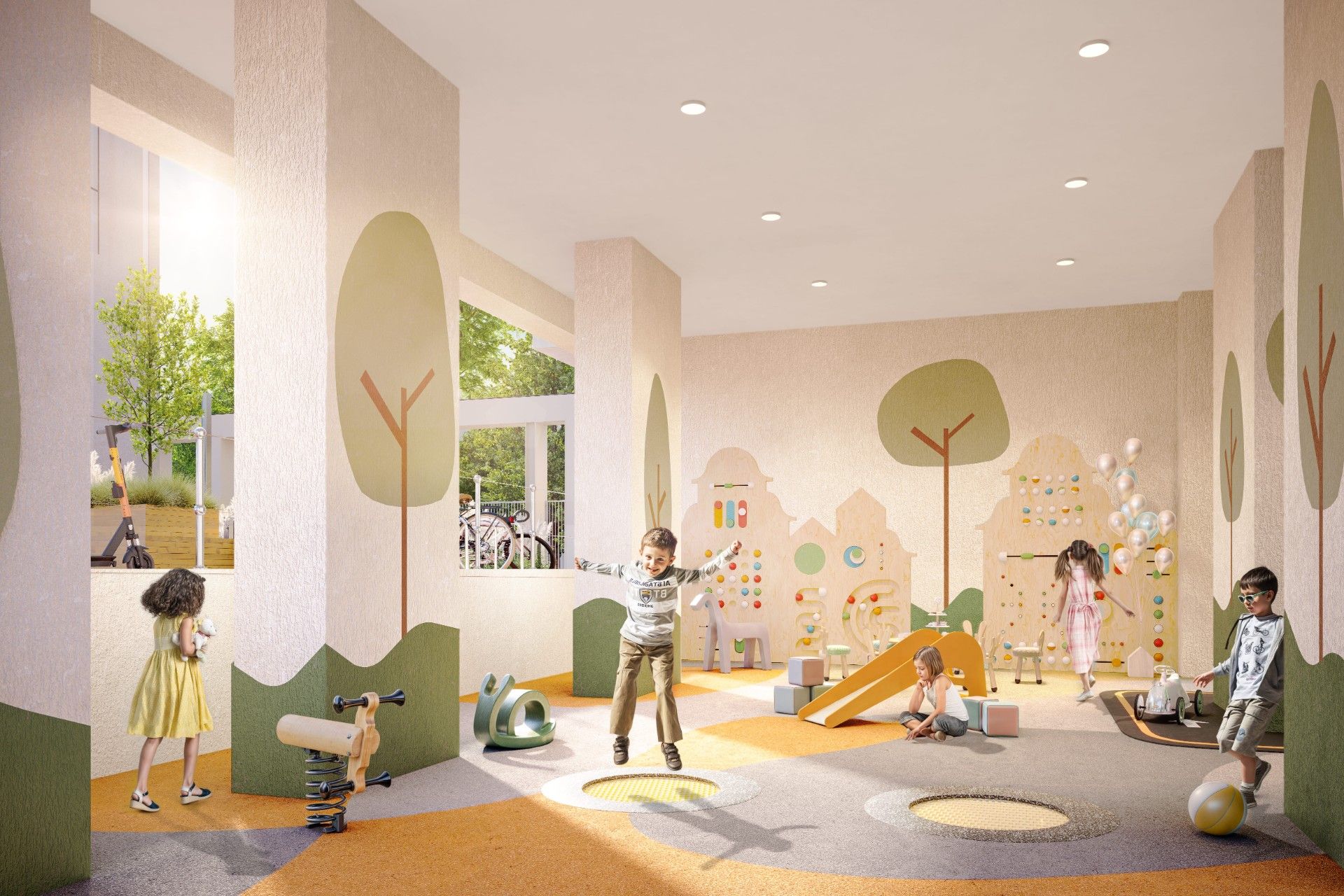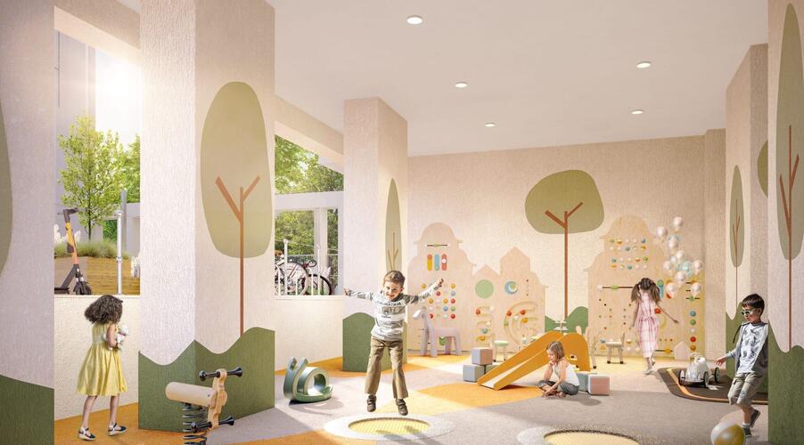 - Детские площадки: Развивающие игровые комплексы для разных возрастов, включая уникальную крытую площадку для игр в любую погоду.