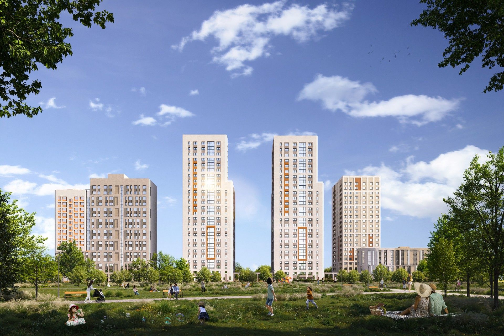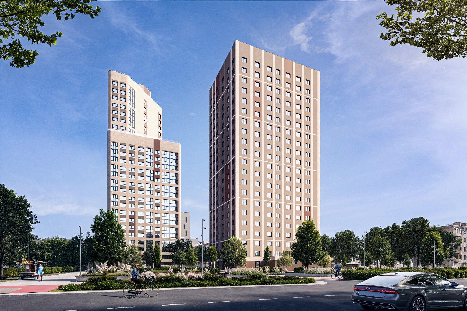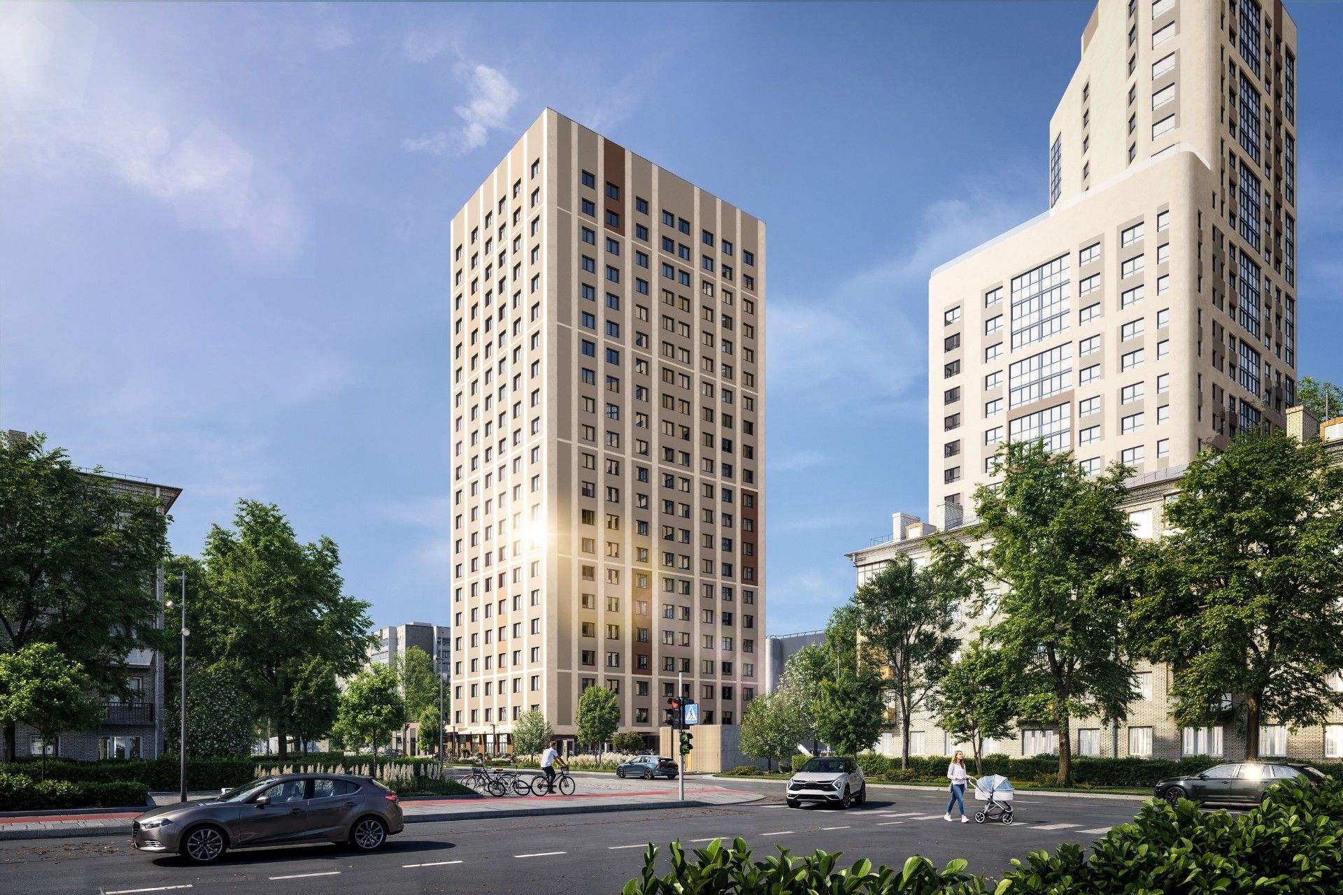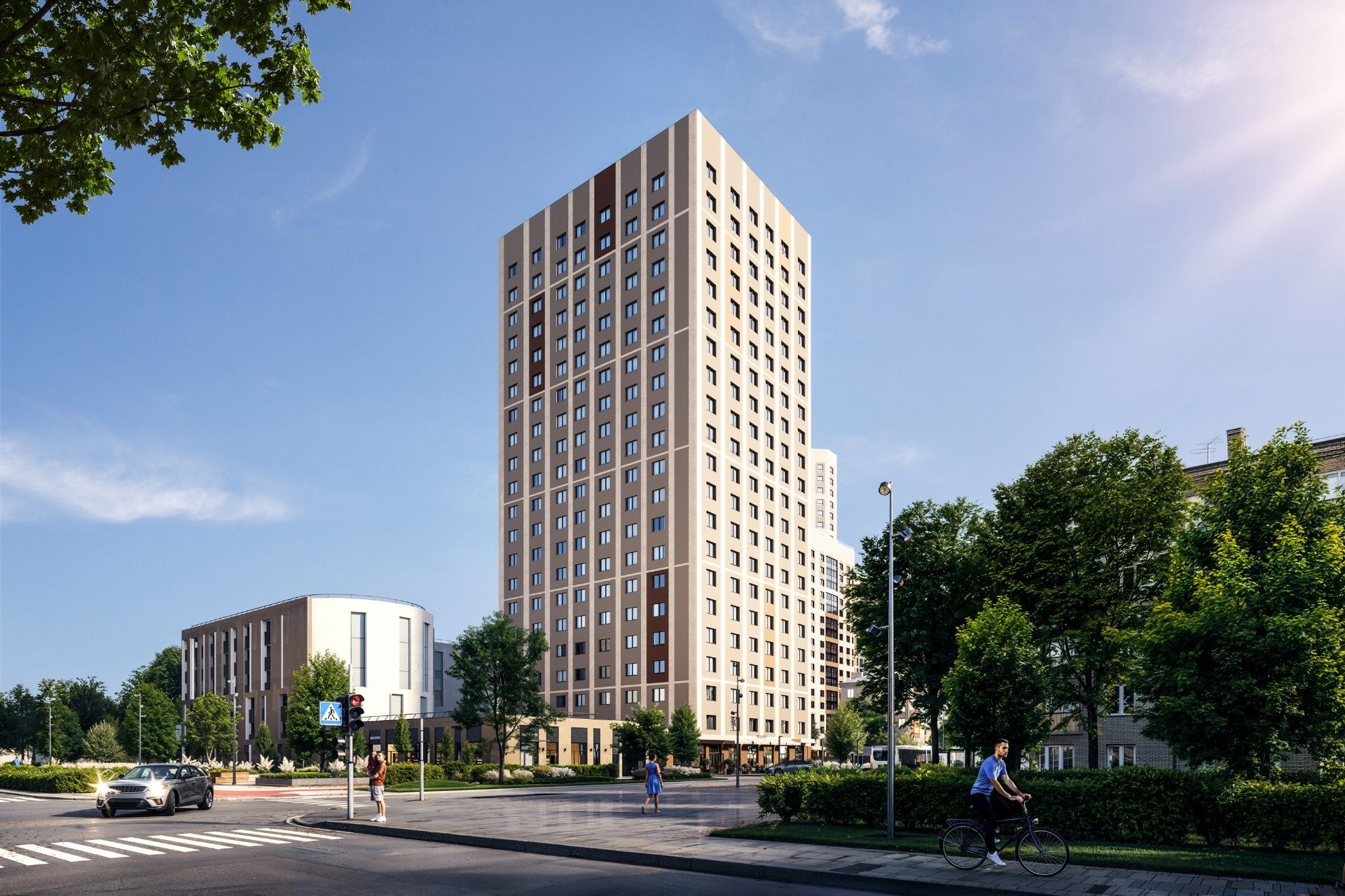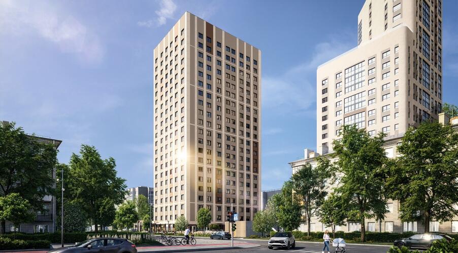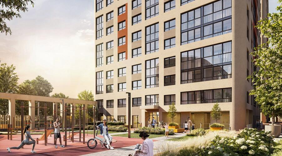 Архитектура комплекса отличается сдержанностью: выбрана светлая палитра с песочными оттенками и бордовыми акцентами, что визуально обогащает пространство. Концепция предполагает создание камерных дворов без машин, объединенных общим прогулочным бульваром.