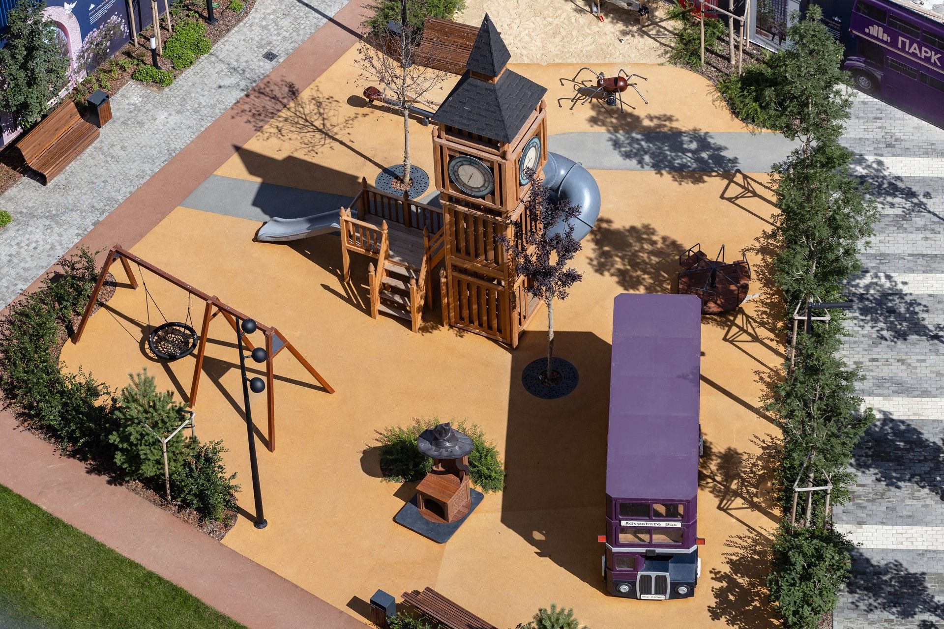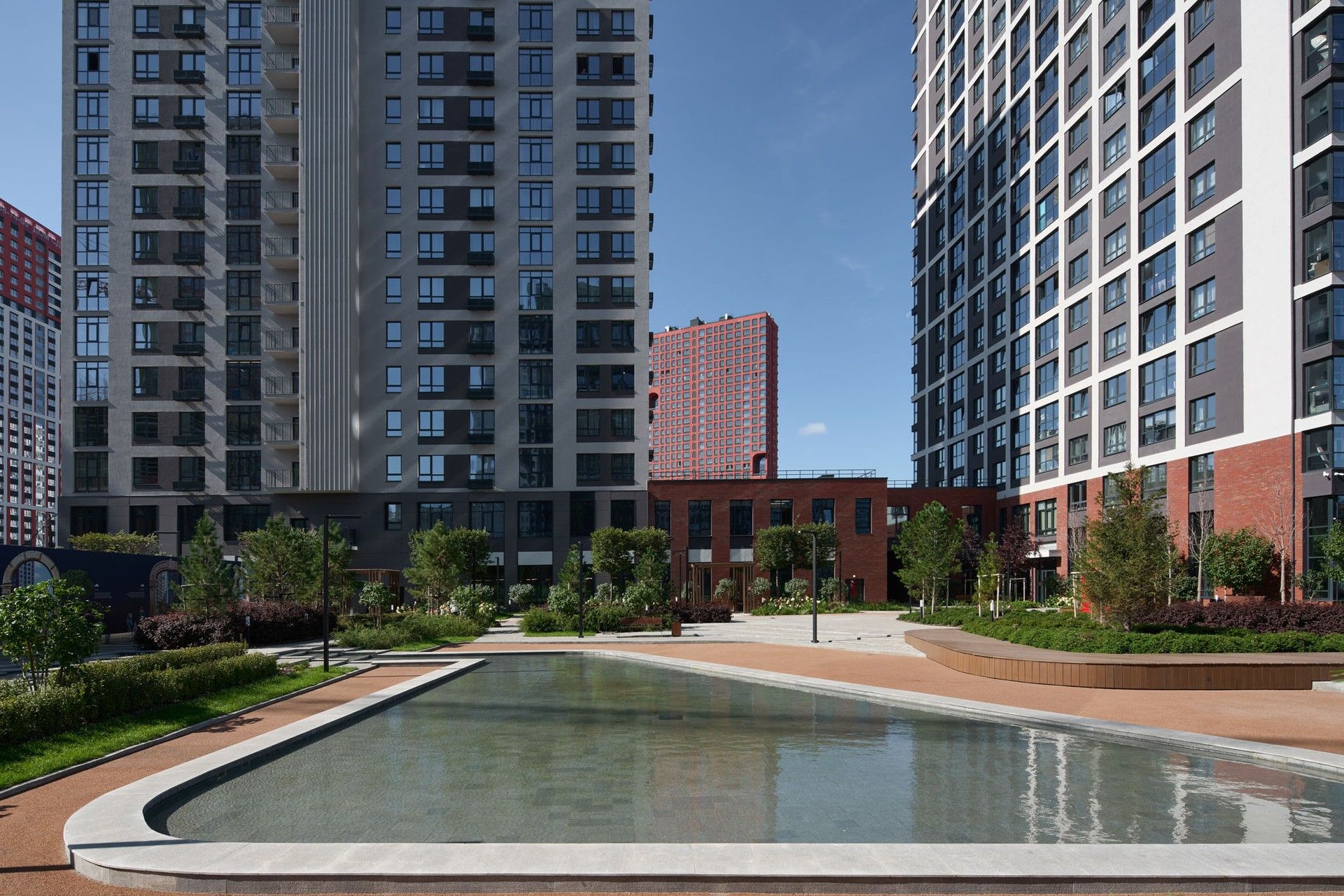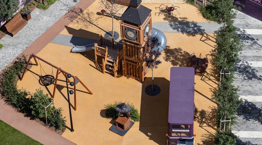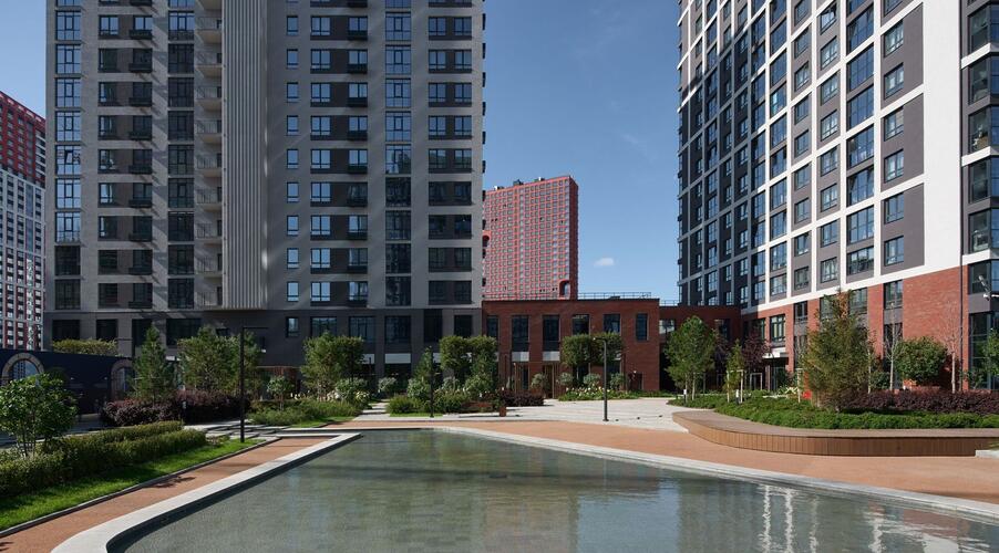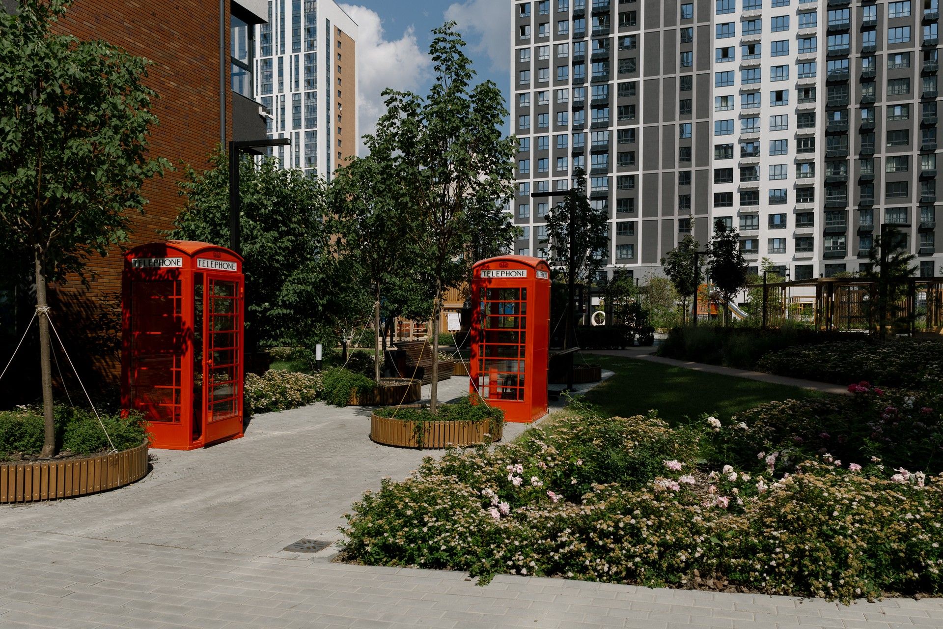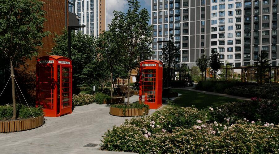 - Приватный двор-парк: Центральным элементом экосистемы является двор площадью 2 гектара, который не огорожен автомобильными парковками [8, 9]. Его уникальность — в ландшафтном дизайне, разработанном европейскими и российскими бюро, который воссоздает атмосферу мировых столиц: Лондона, Милана, Дубая, Токио, Барселоны, Нью-Йорка и Сингапура [1, 8, 9]. На территории есть детские площадки с тематическими арт-объектами (например, Биг-Бен и красные телефонные будки), зоны для спорта, отдыха и даже искусственный водоем с ручьем [2, 9].