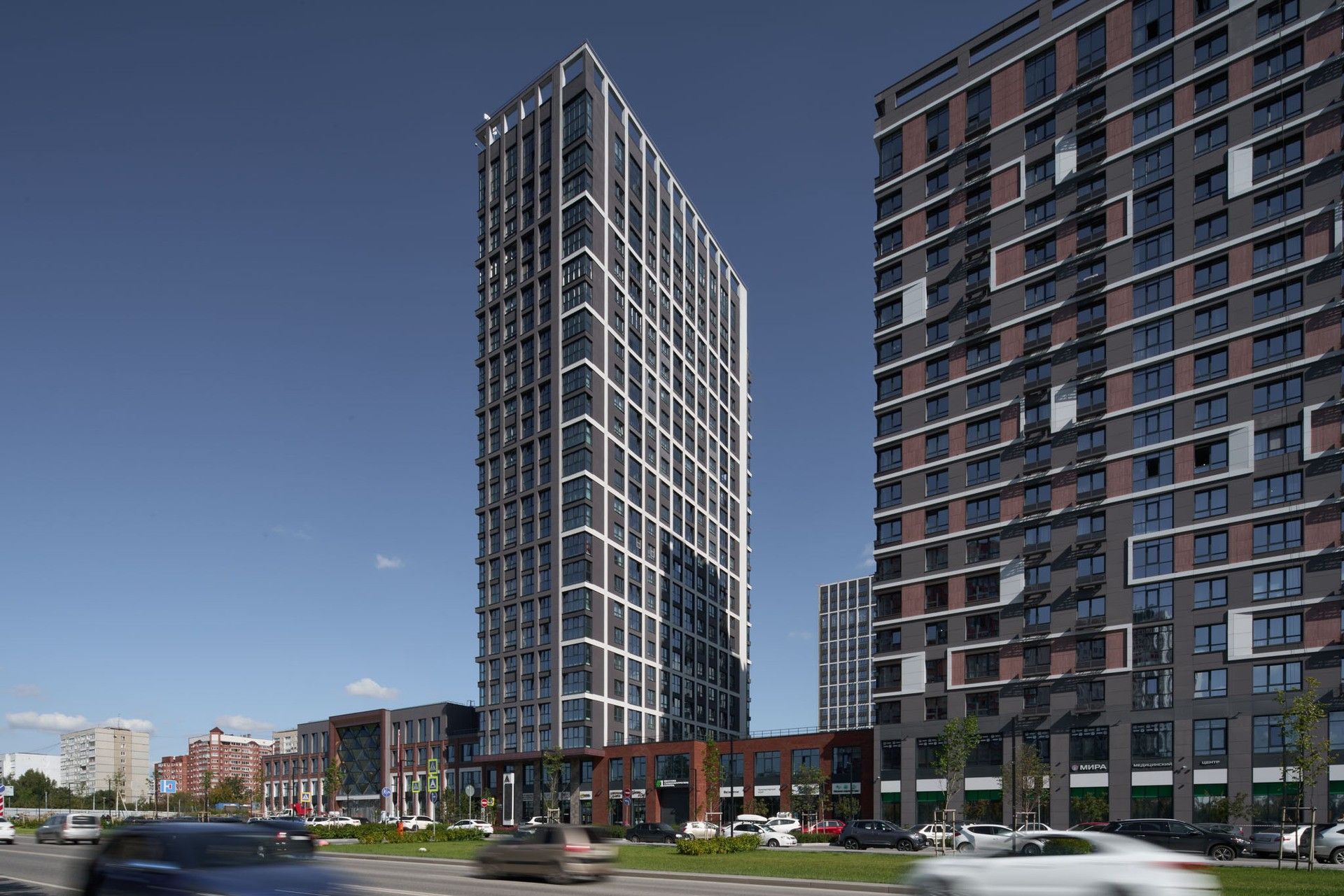 - Внутри комплекса: В пешеходной галерее и на первых этажах уже открыты супермаркеты («Пятёрочка», «Жизньмарт»), кофейня, ресторан, медицинский и спа-центр, пункты выдачи заказов [2, 5]. Планируется открытие муниципального и частного детских садов, что является серьезным преимуществом. На практике часто сталкиваюсь, что наличие собственных детских садов в ЖК решает проблему очередей в муниципальные учреждения района.