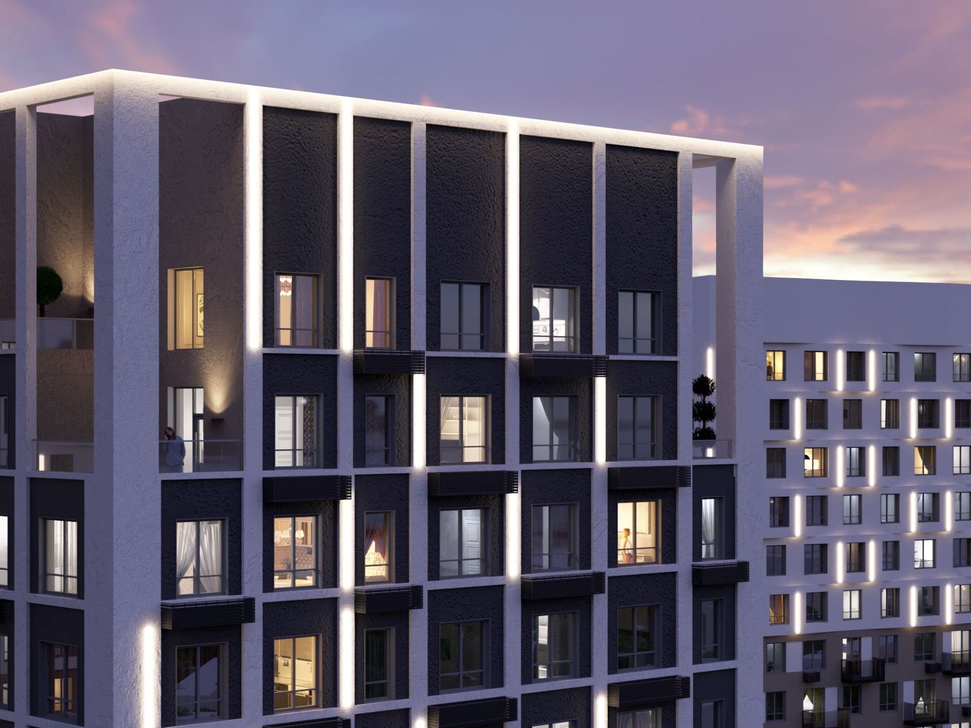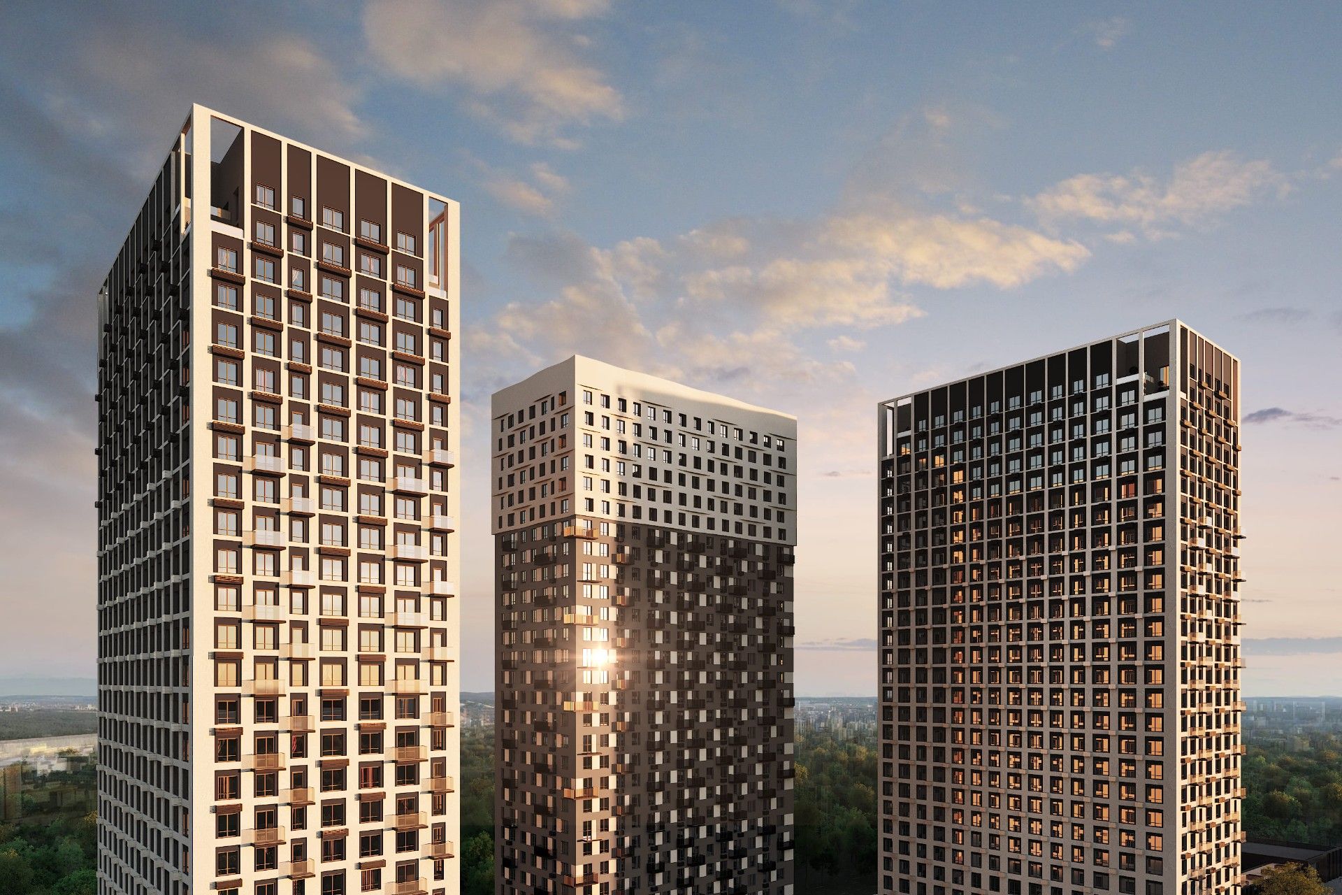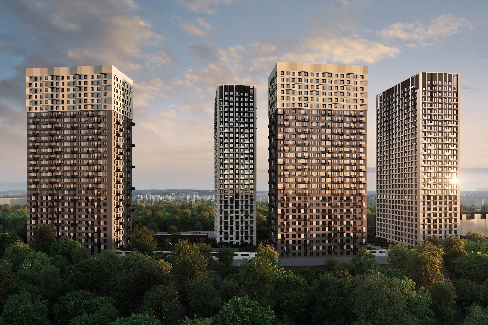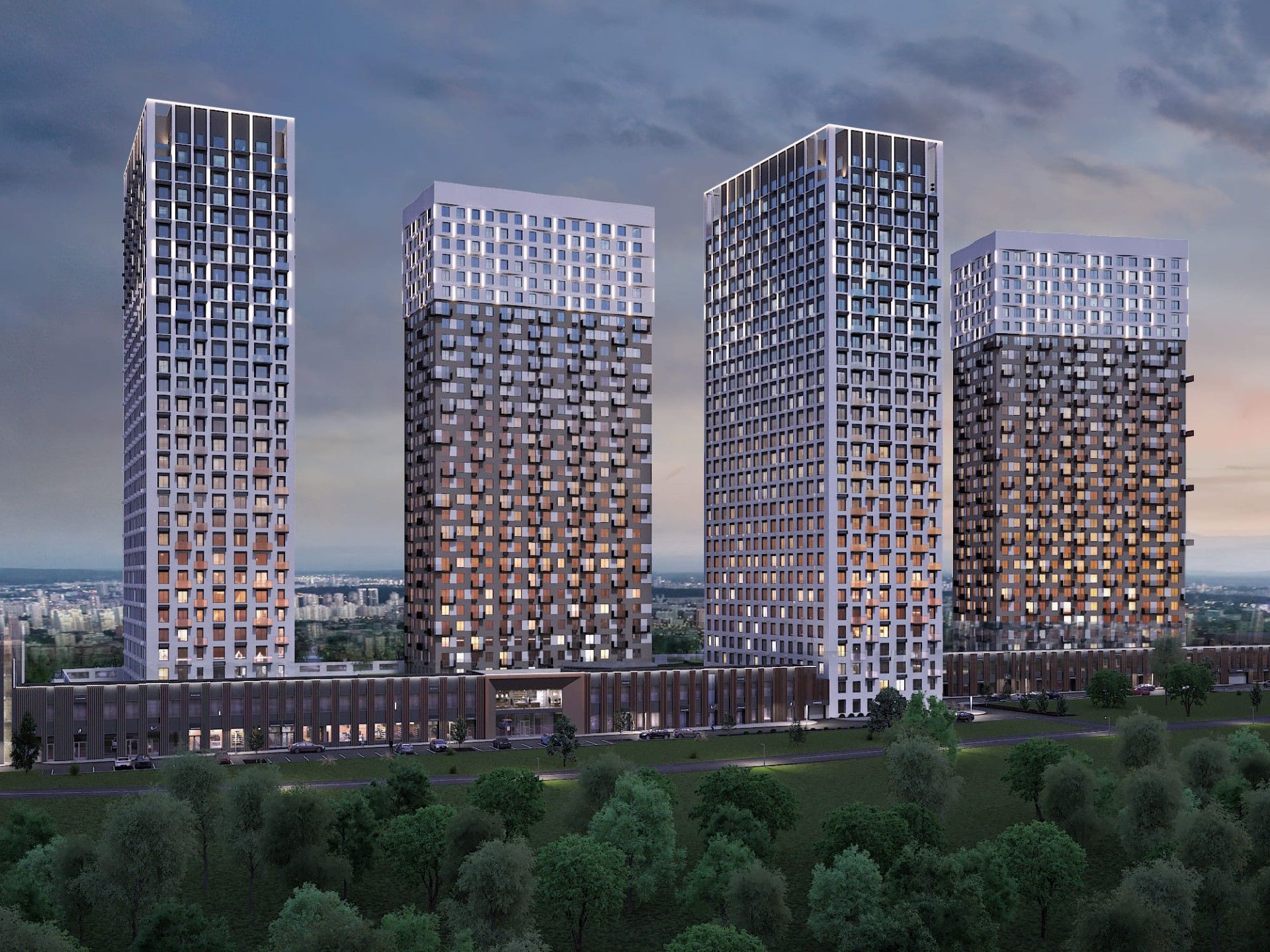 Проект — комплекс из четырех монолитных башен переменной этажности (до 31 этажа) на общем стилобате. Это обеспечивает оптимальную инсоляцию квартир и панорамные виды.