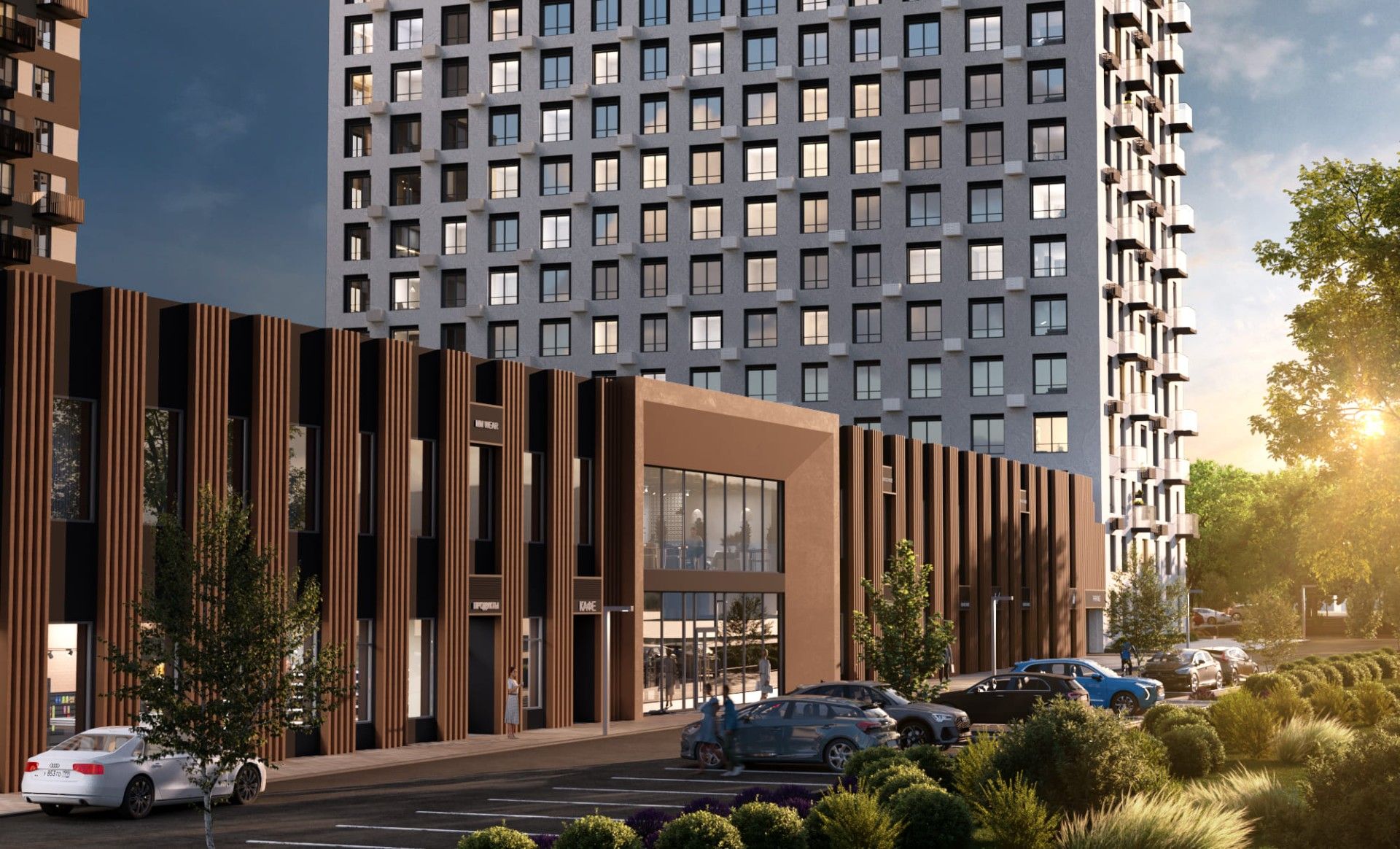 Предусмотрен подземный паркинг с зарядками для электромобилей и открытая стоянка.