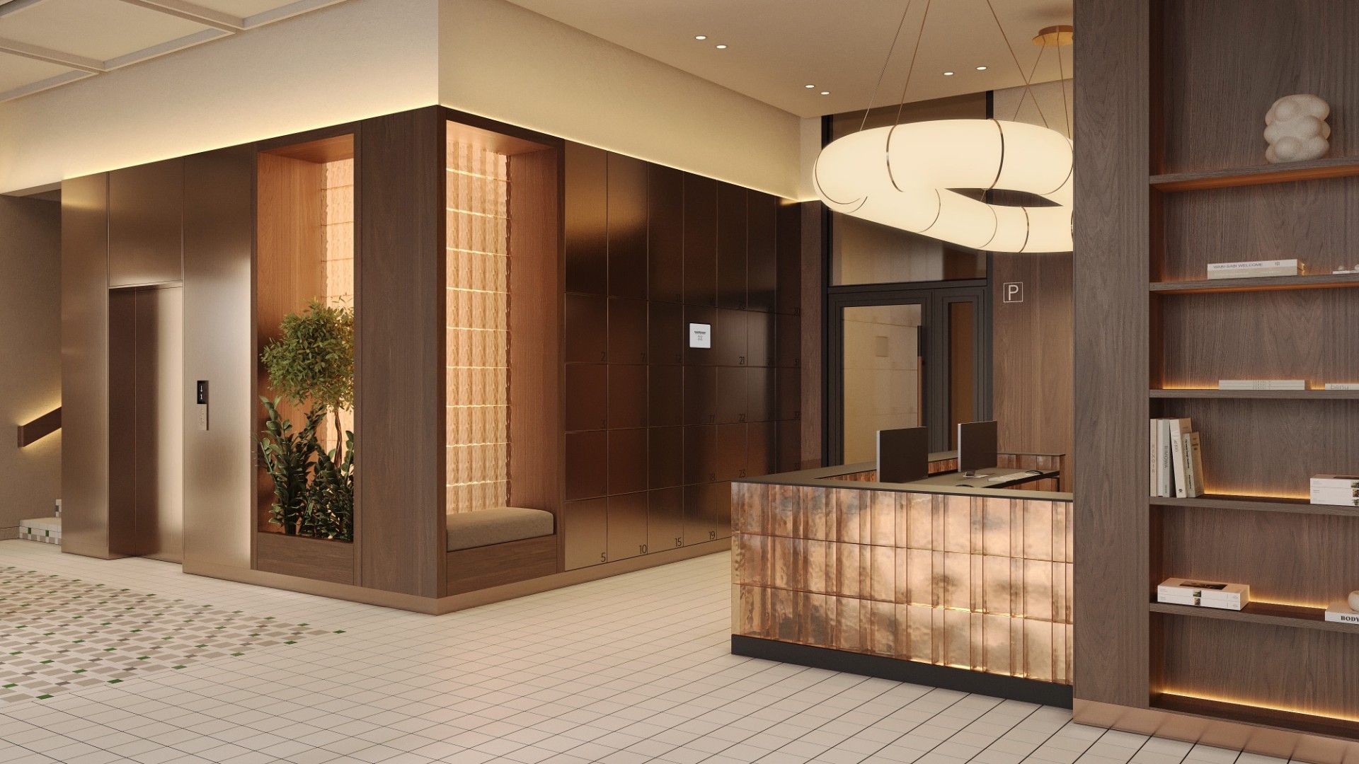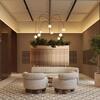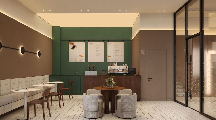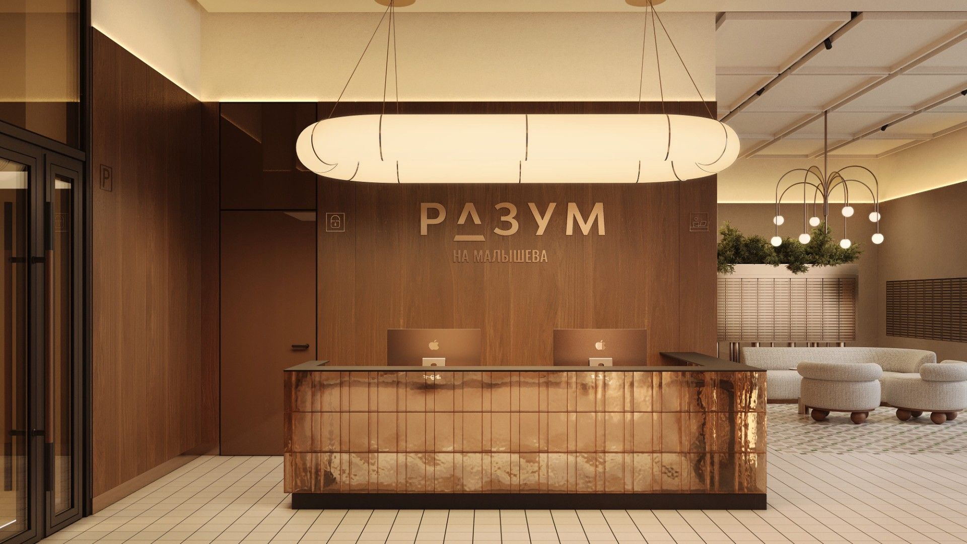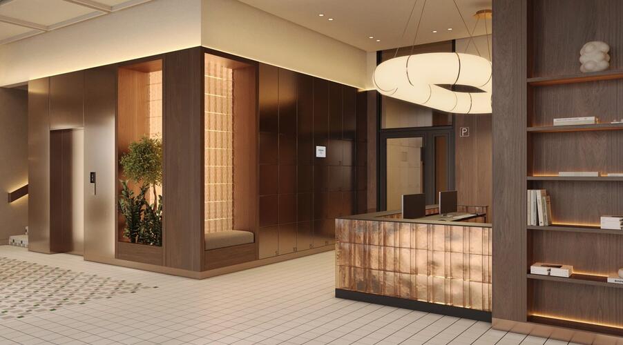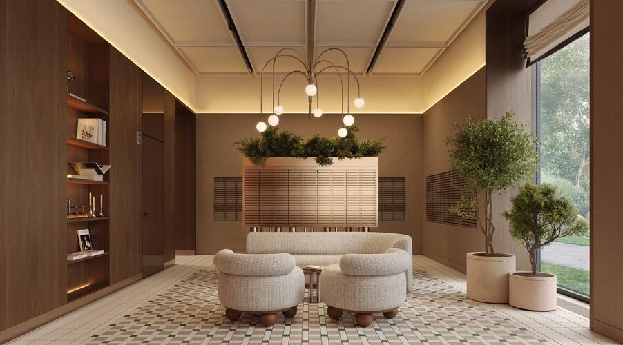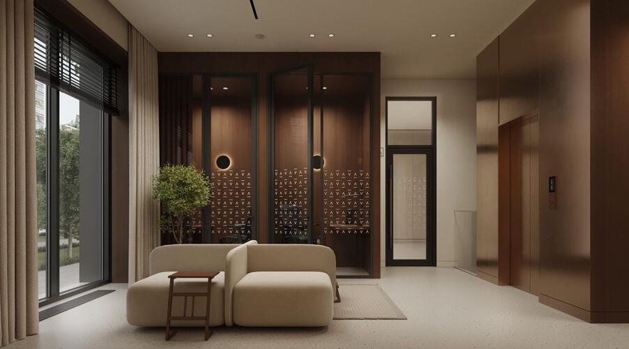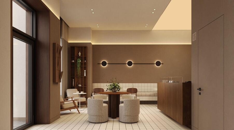 Входные группы реализованы как гранд-лобби с ресепшеном, зонами ожидания и кофейней.