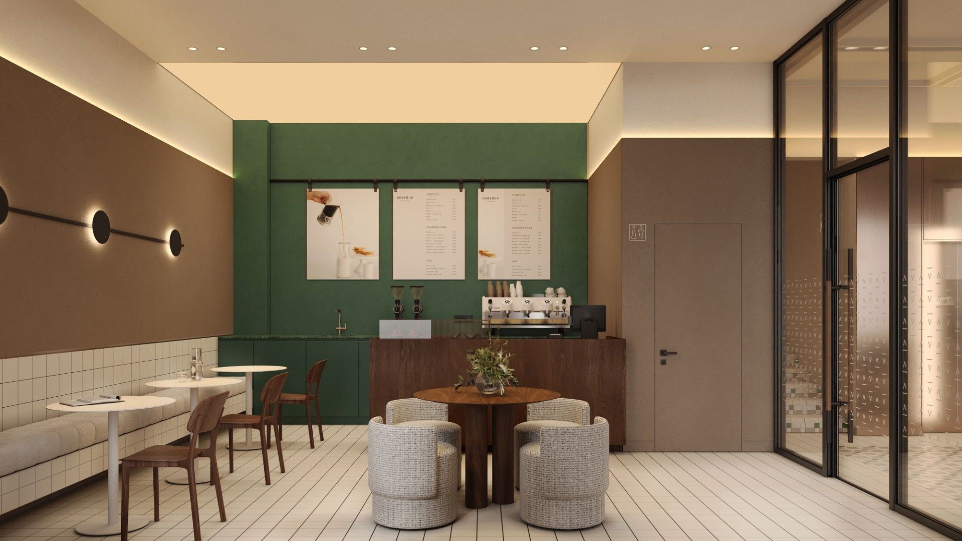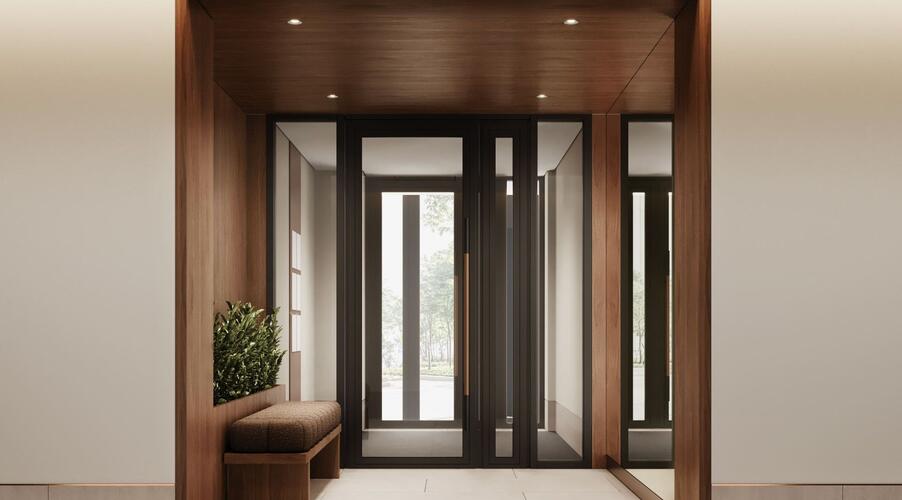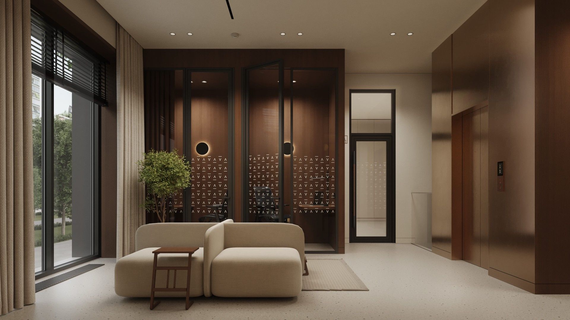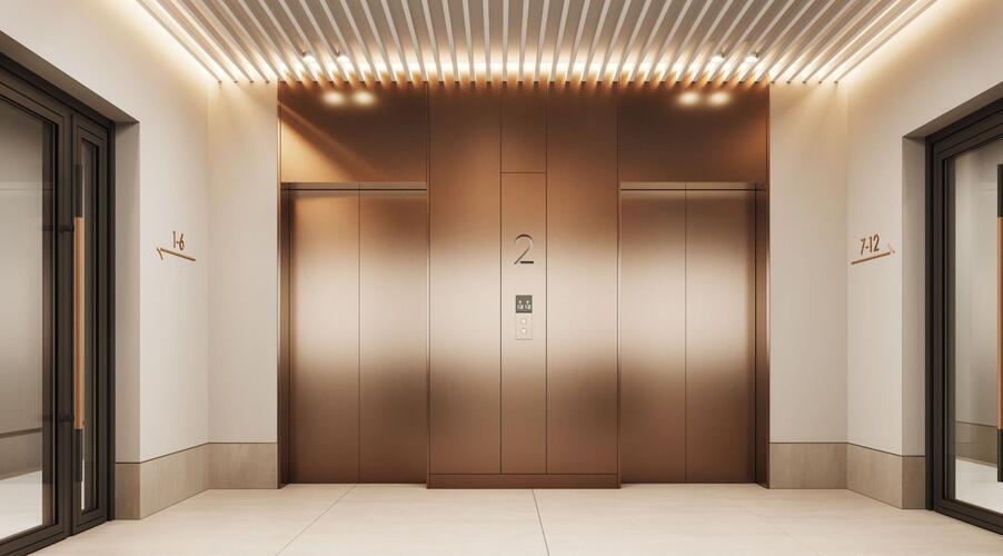Входные группы реализованы как гранд-лобби с ресепшеном, зонами ожидания и кофейней.