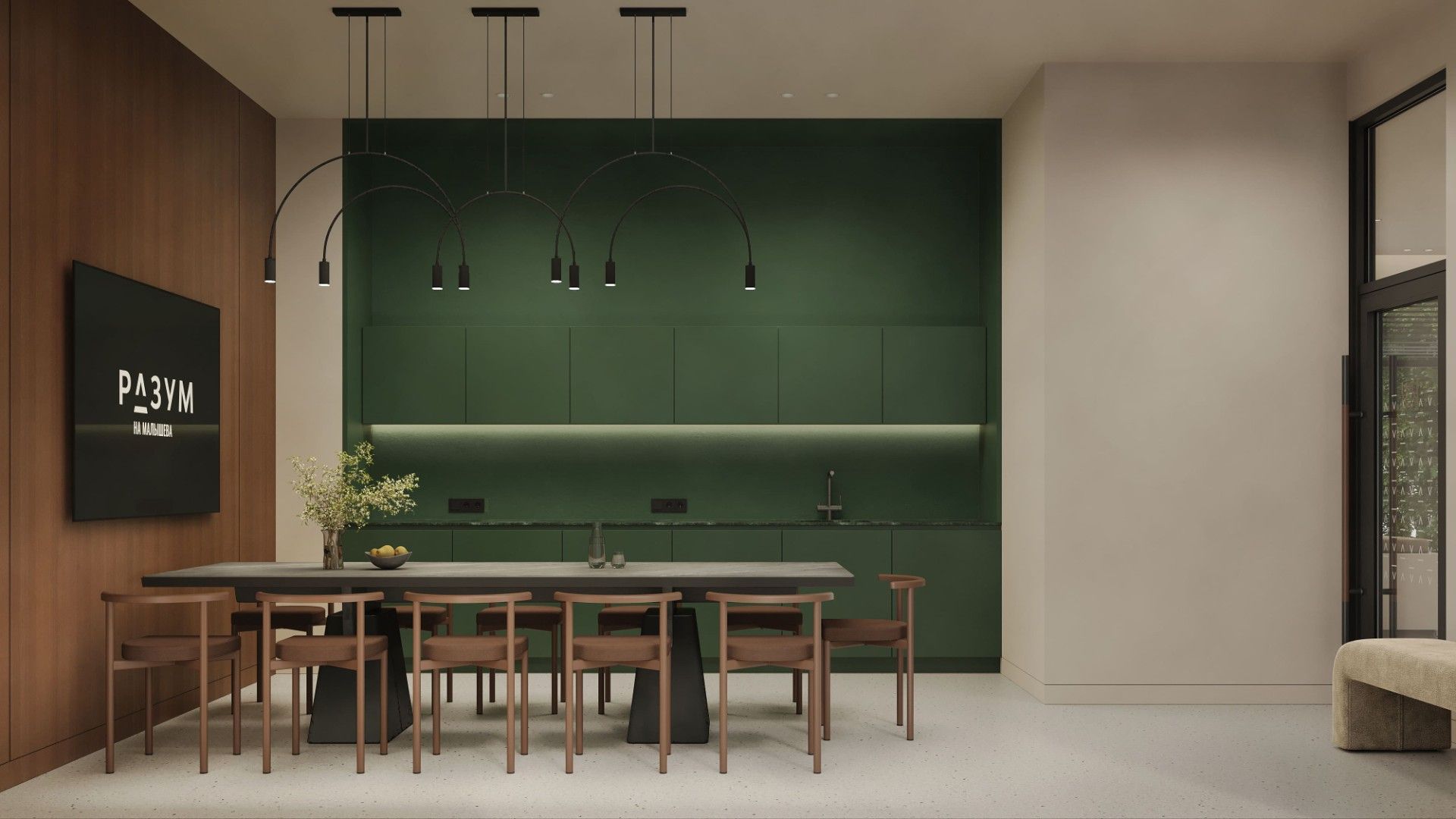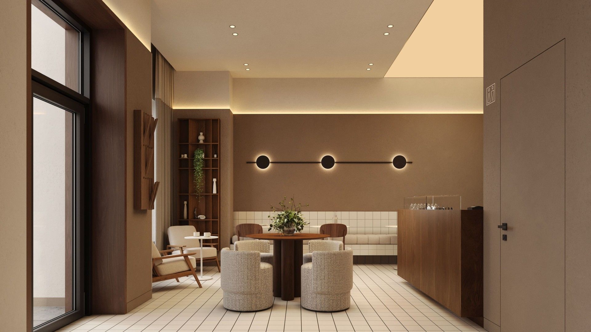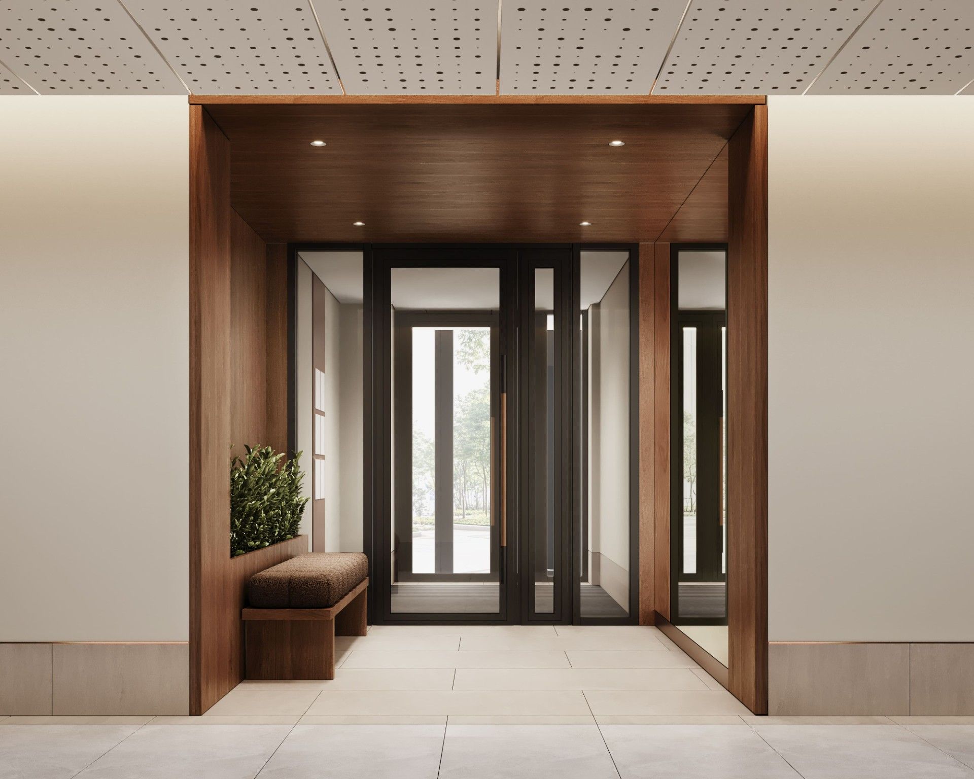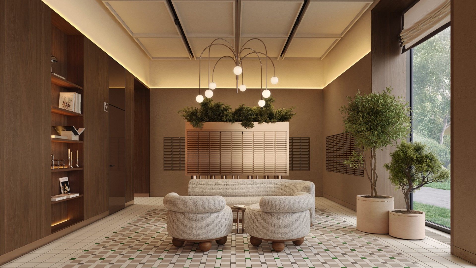 Входные группы реализованы как гранд-лобби с ресепшеном, зонами ожидания и кофейней.