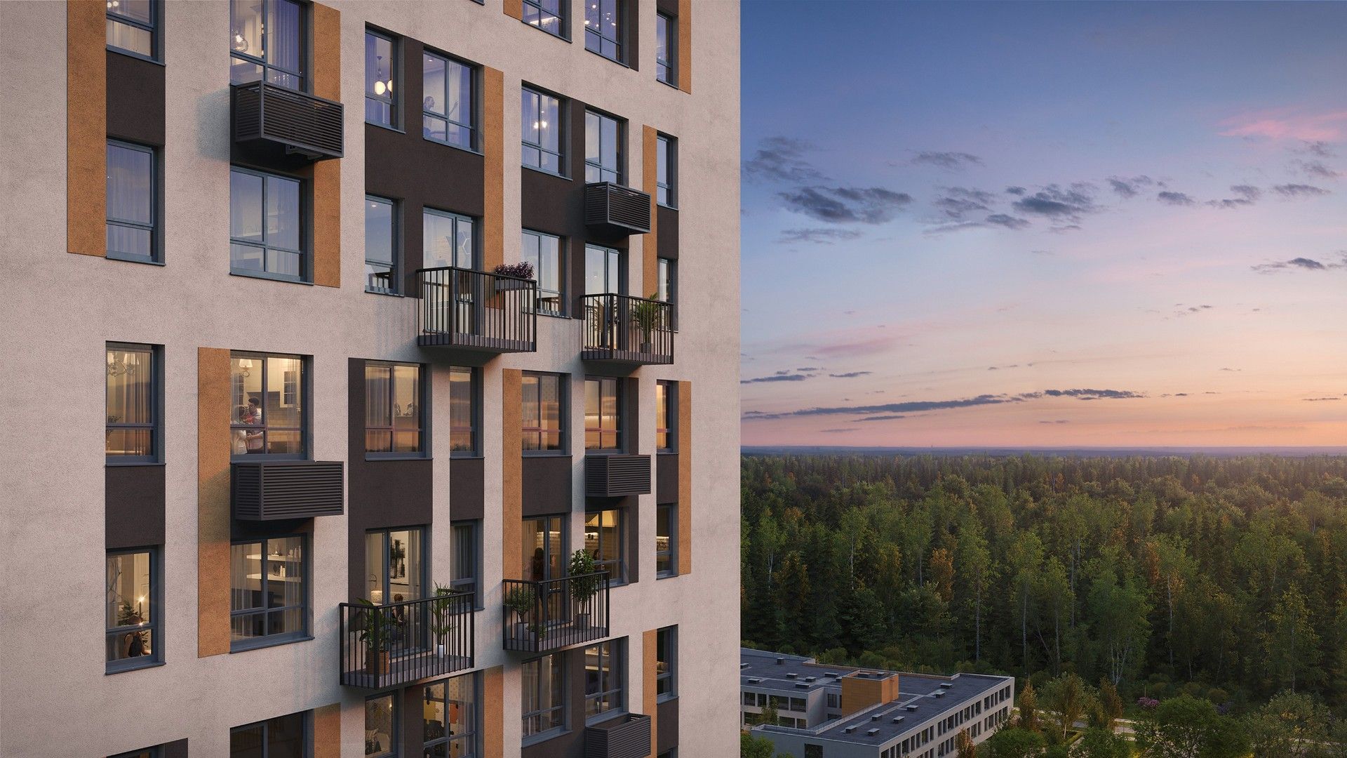 Архитектура комплекса решена в спокойных природных оттенках с выразительными рыжими и графитовыми акцентами. Французские балконы добавляют фасадам легкости и современности. Технология строительства — кирпично-монолитная, что обеспечивает высокие показатели тепло- и шумоизоляции.