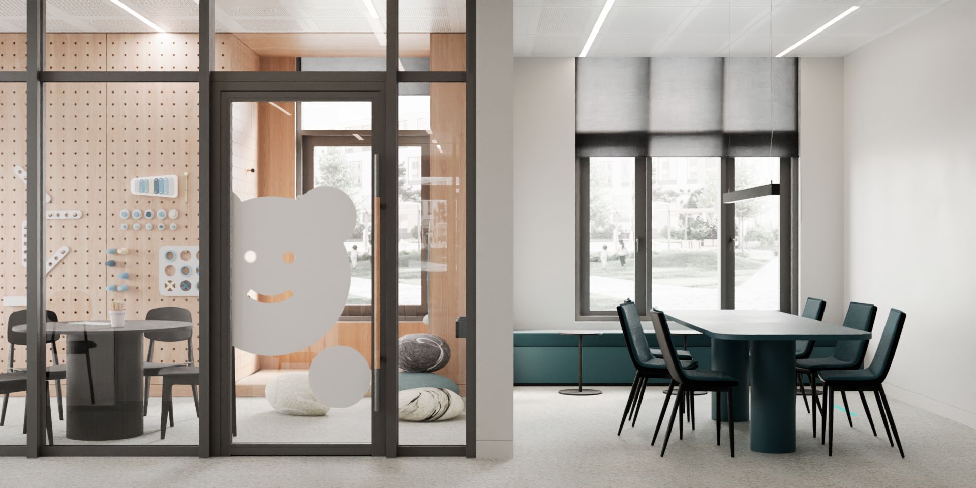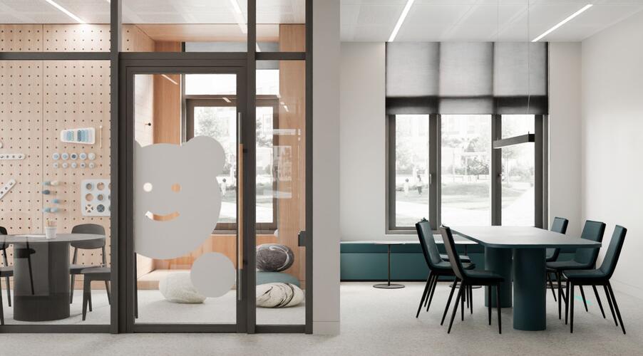 - Соседский центр с гостиной, детской комнатой и йога-залом.