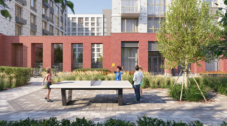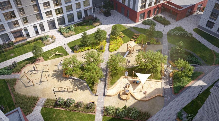 | Концепция благоустройства | Парадный вестибюль, соседский центр, уникальный двор-остров с искусственным рельефом и взрослыми деревьями. |