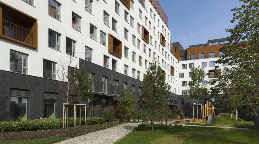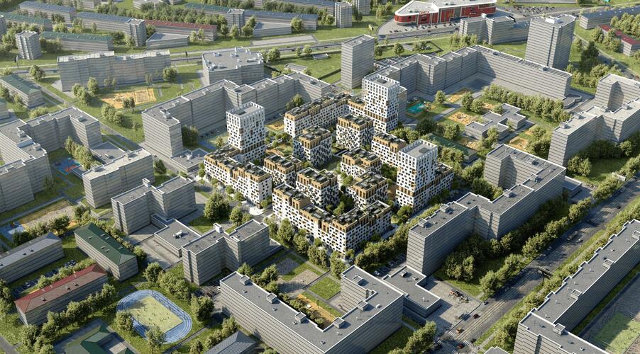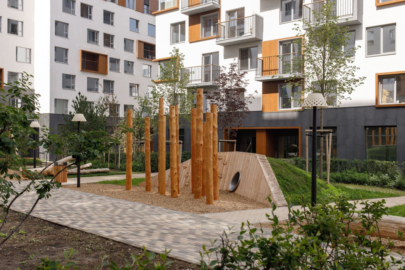 Проект выделяется на фоне типовой застройки района благодаря привлечению голландских архитекторов. С точки зрения благоустройства, проект предлагает продуманное пространство без машин: