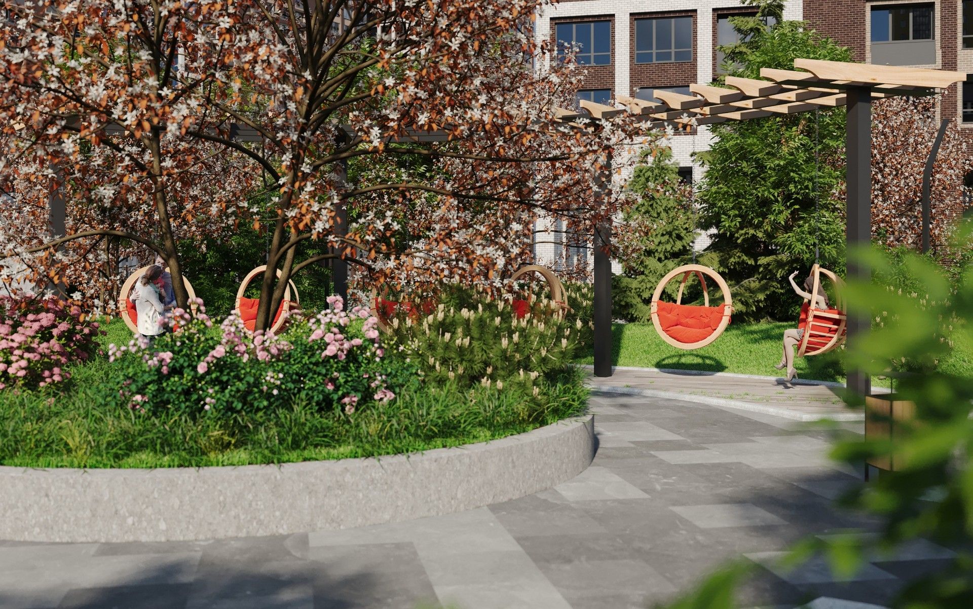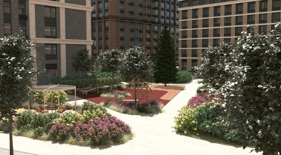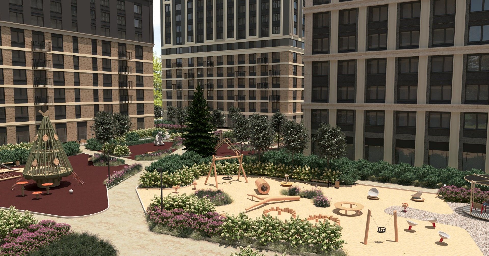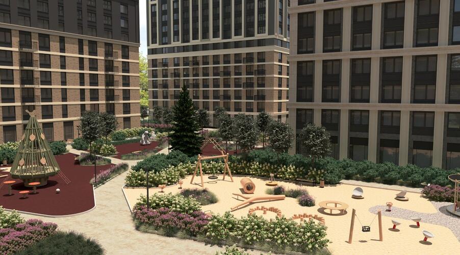Девелопер создает полноценную среду для комфортной жизни внутри комплекса. Ключевые элементы благоустройства включают: