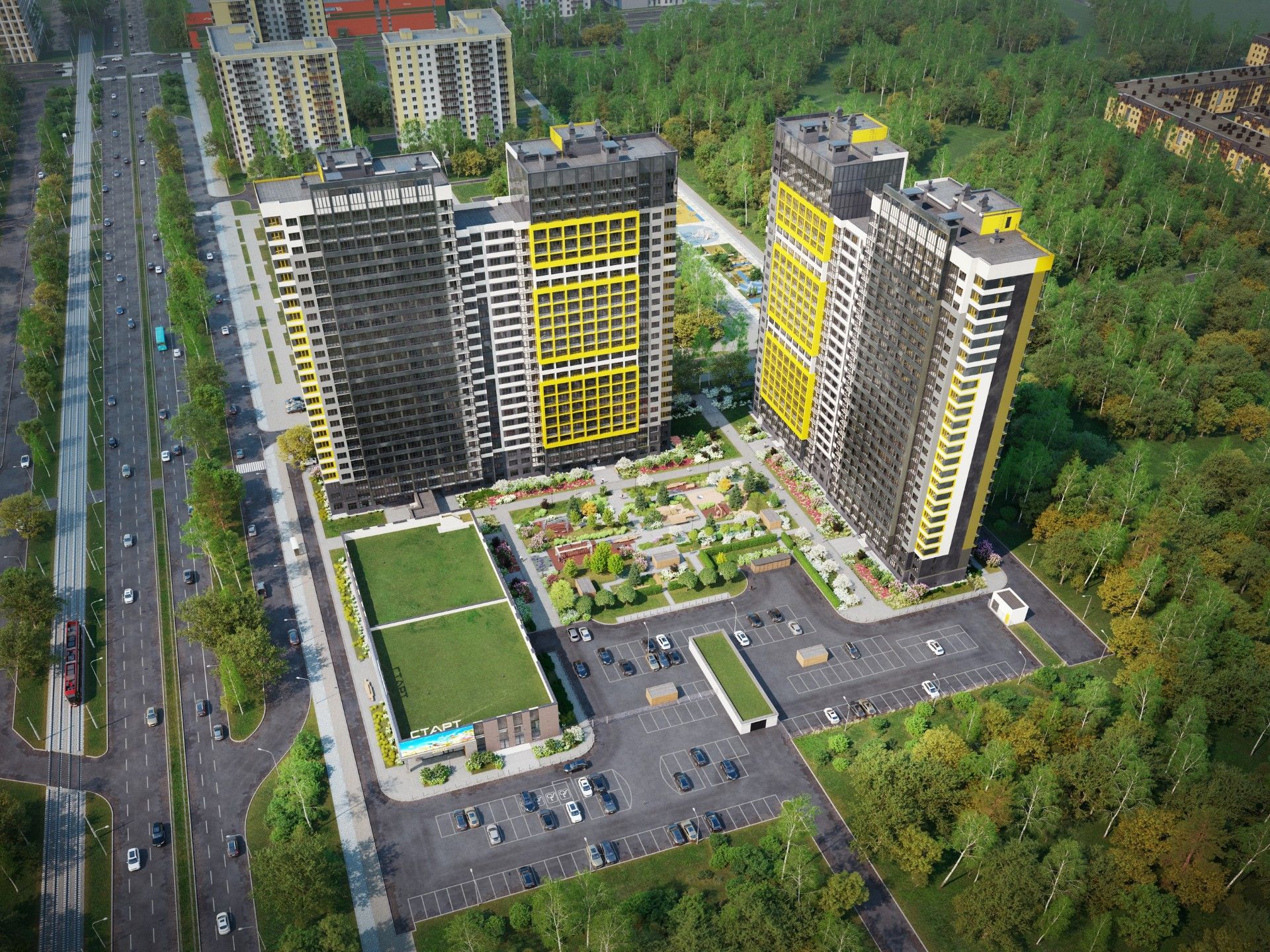 Комплекс граничит с обновленным сквером «Старт», который стал излюбленным местом отдыха местных жителей. Сквер благоустроен многочисленными аллеями, скамейками и современным освещением, создавая уютную атмосферу для прогулок и отдыха.